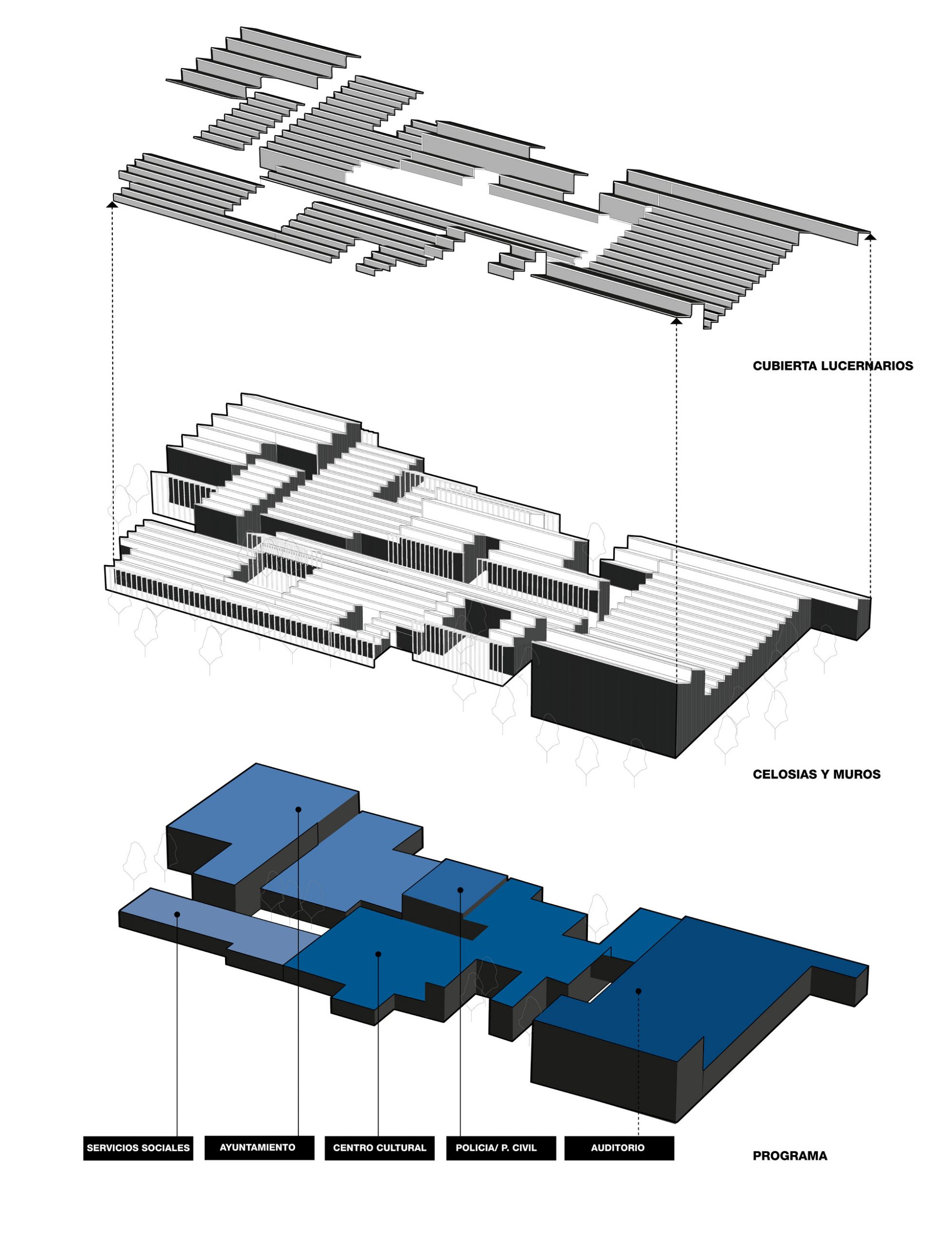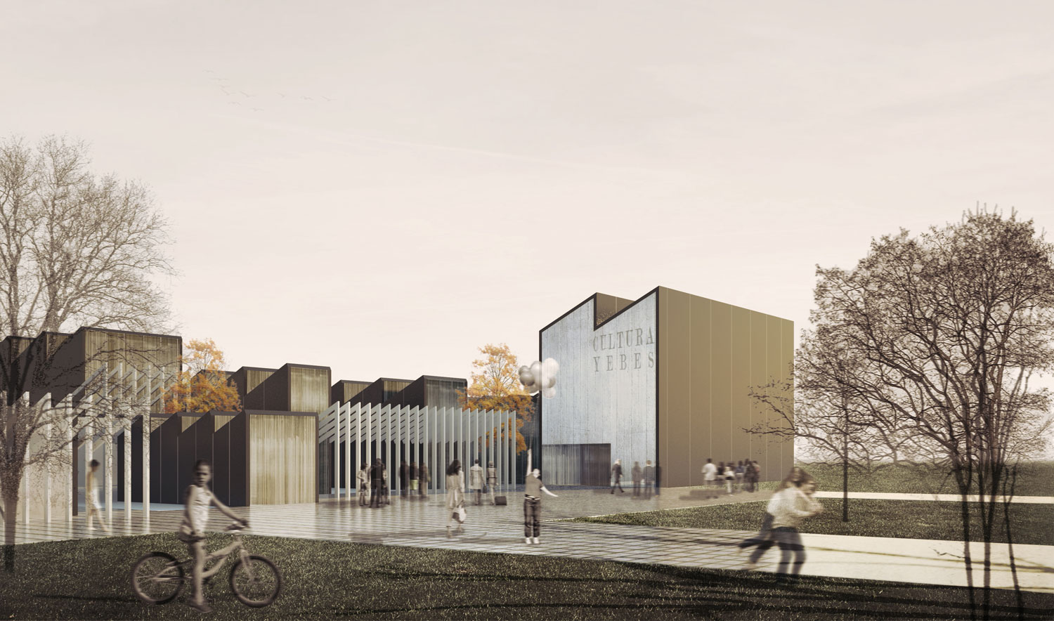 Nuevo edificio de Servicios de Yebes propuesto se basa en una construcción elemental de células de planta rectangular, de carácter multifuncional, articuladas entre sí de acuerdo a un conjunto de leyes complejas, estructuras de repetición aparentemente azarosas, que constituye un sistema abierto y flexible. Las sucesivas construcciones celulares, capaces de albergar indistintamente programas expositivos, informativos, administrativos, o de investigación, se organizan en torno a un gran espacio abierto y de acogida que permite la entrada, de forma diferenciada, a las diversas instituciones que integran el conjunto: Las Dependencias Municipales, Las dependencias Policiales y el aula de Cultura. Cada una de las células rectangulares de este sistema se construye como una caja de planta rectangular y cubiertas en diente de sierra que orientan a norte sus vidrios favoreciendo una entrada de luz idónea para el trabajo y a sur dispositivos de aprovechamiento de energía solar.