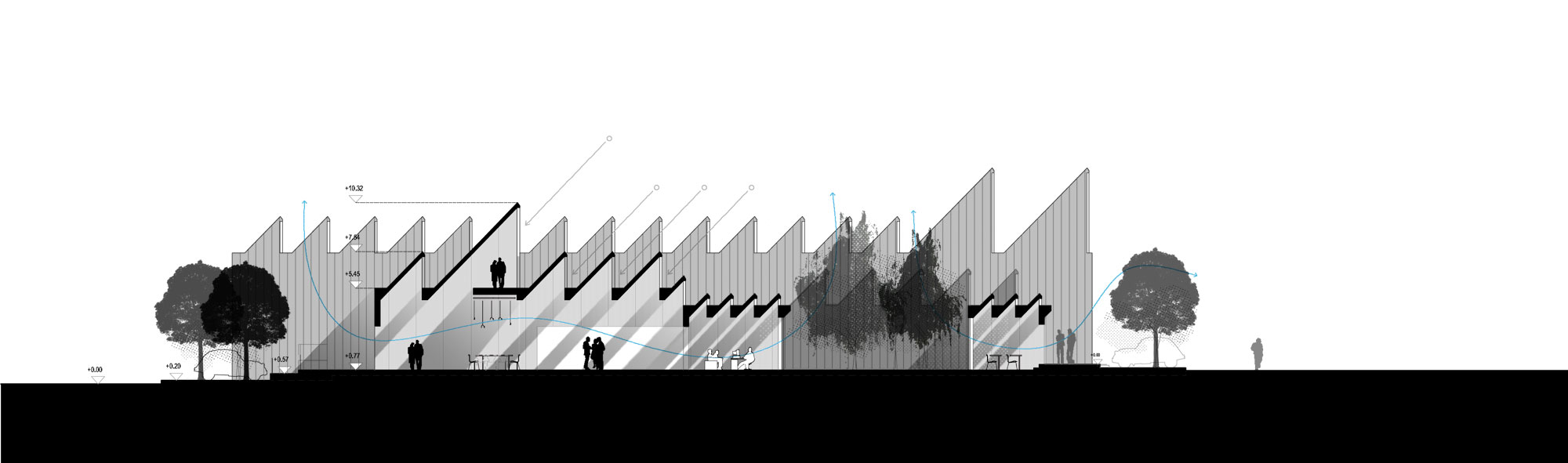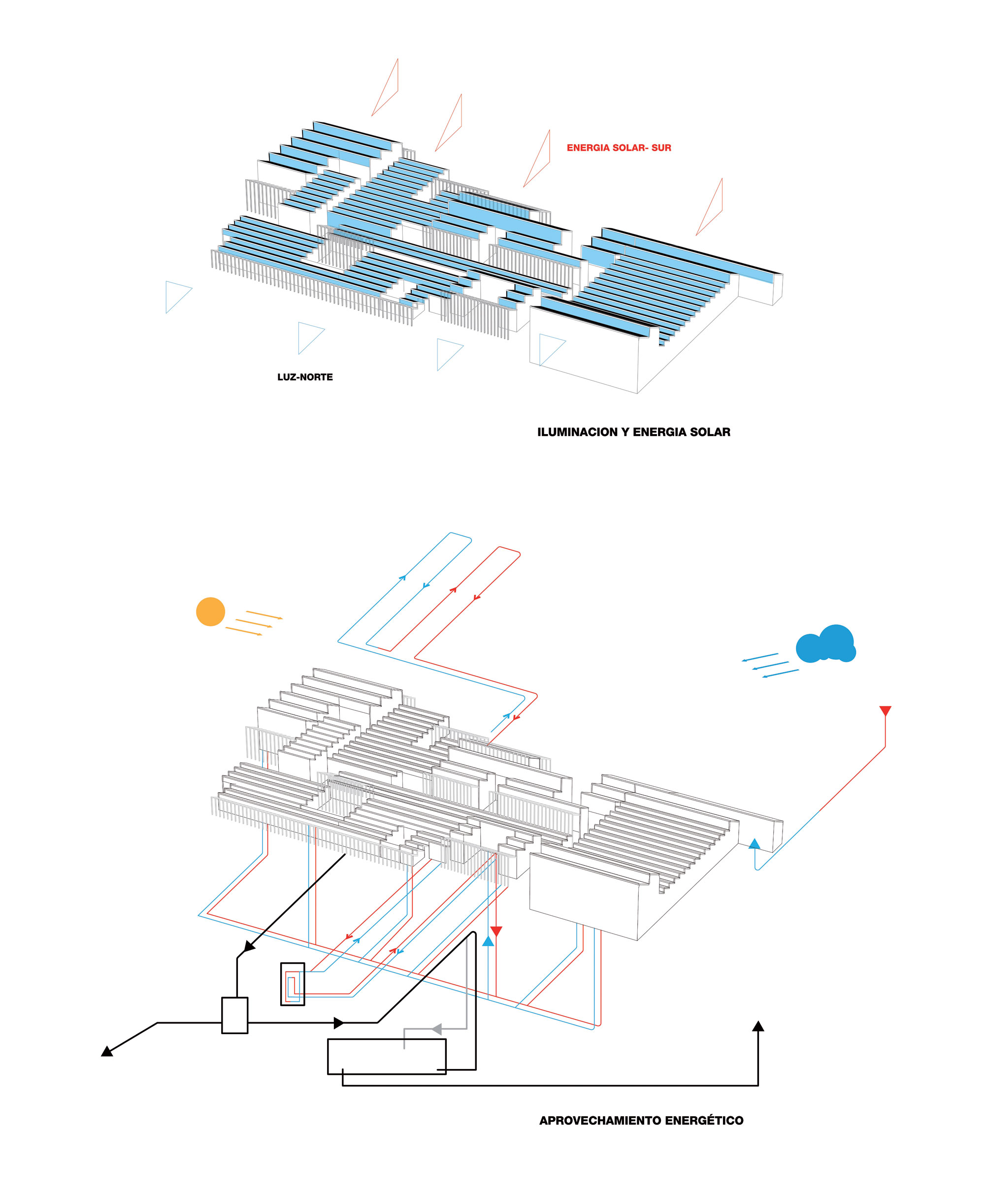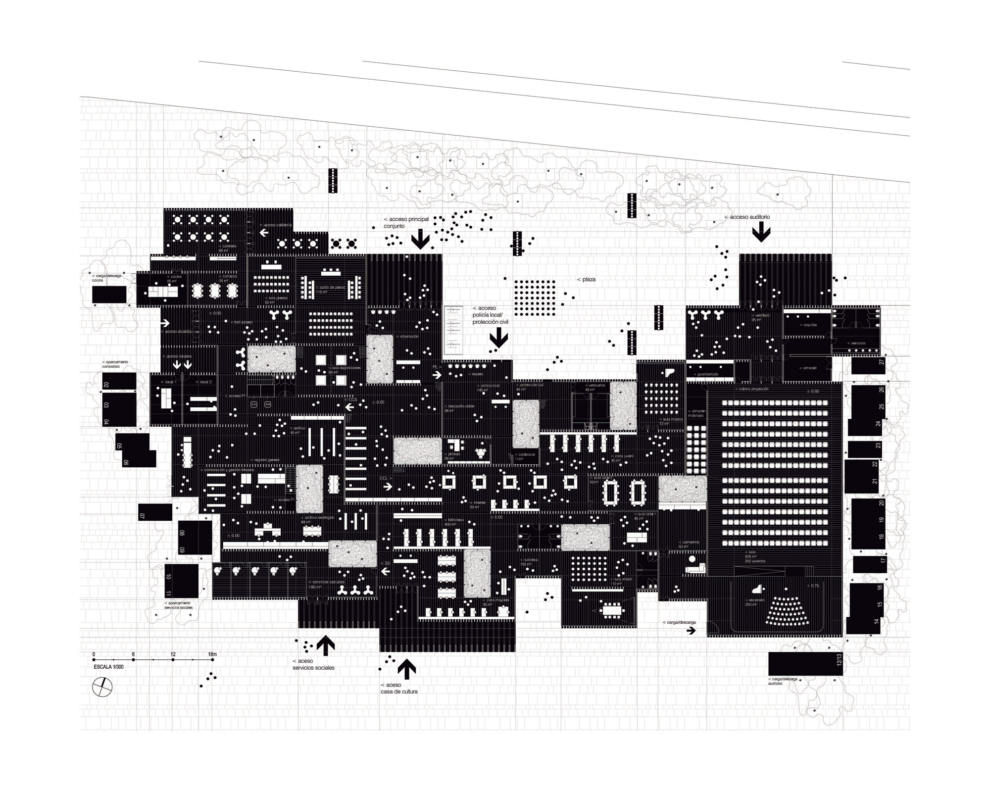 De este modo, se propone una construcción de un sólo nivel estructurada a partir de un sistema formado por células de planta rectangular, que, con un perímetro quebrado y una volumetría fragmentaria, trata de dinamizar un amplio territorio libre de edificaciones, de forma que, sin tener que recurrir a un icónico volumen unitario, constituya un elemento de referencia, foco de activación del área, estableciendo una adecuada relación con los elementos construidos del entorno. El conjunto propuesto, formado por un conglomerado de construcciones de pequeña escala que se abren a las diferentes orientaciones, a través de un arraigado sistema de patios.