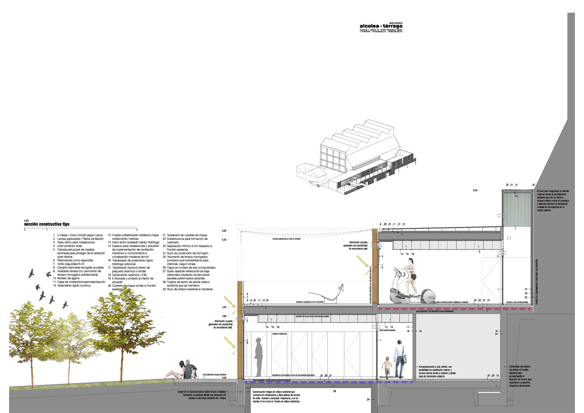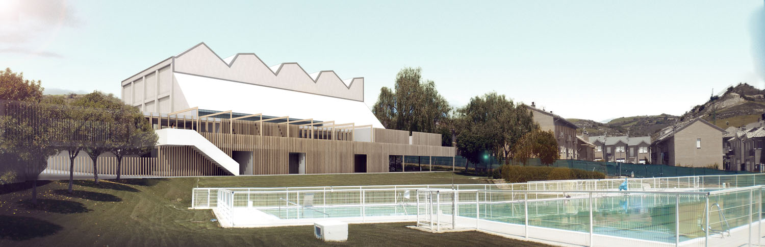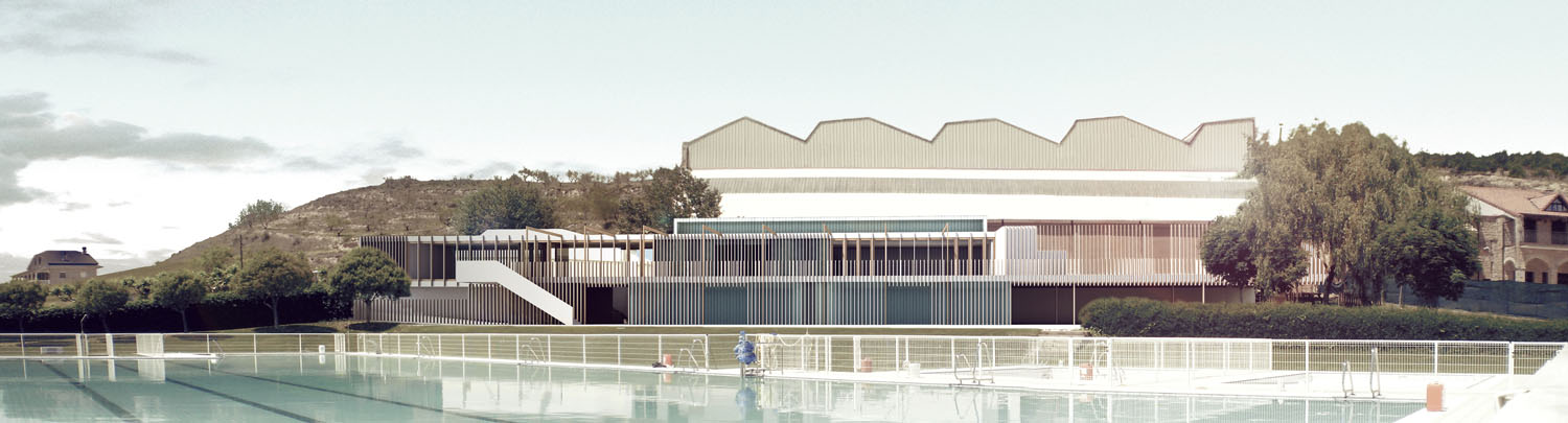 En la planta superior, a nivel del frontón, se resuelve un nuevo bar, una sala de musculación, vestuarios y almacén, además de una terraza solarium con vistas hacia la piscina y conectada con ésta. En la terraza se sitúa además una pista de Pádel. Se construye con un alto grado de prefabricación, con estructura de pilares de madera laminada y forjados prefabricados, lo que permite optimizar costes y disminuir plazos de ejecución. La madera laminada, además de necesitar poco mantenimiento, actúa como celosía protegiendo del sol directo del sur y dotando al complejo deportivo de un nuevo fondo construido, sencillo y de escala adecuada. Tratándose además de un complejo de iniciativa pública, se considera esencial seguir criterios ejemplificadores de integración en el entorno, medioambientales, de ahorro energético, de construcción sostenible y de buen uso del dinero público.