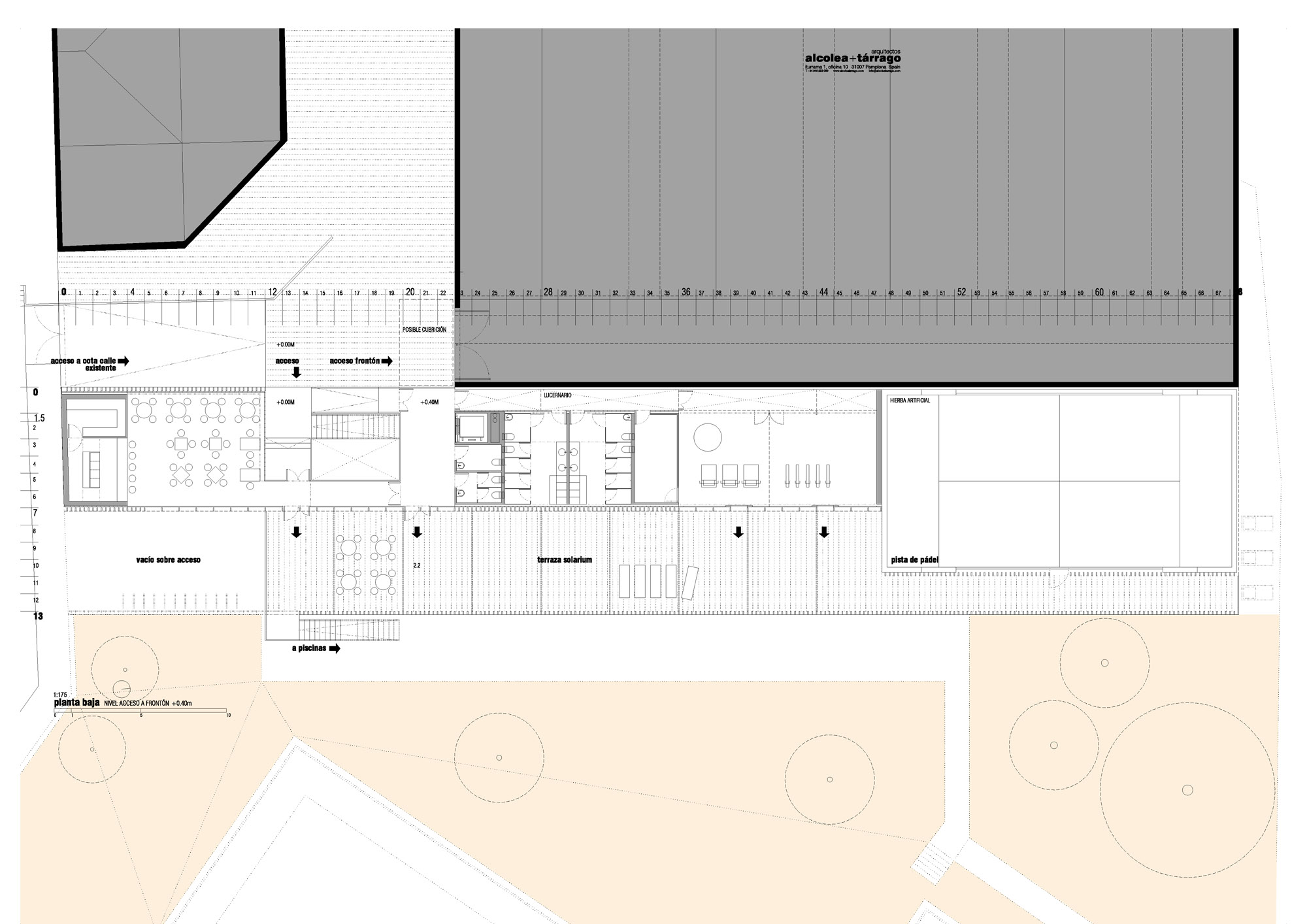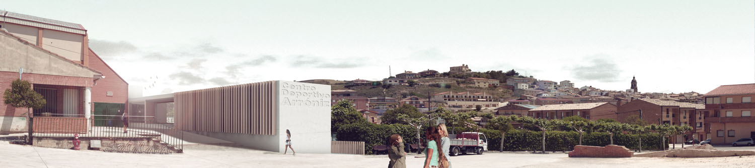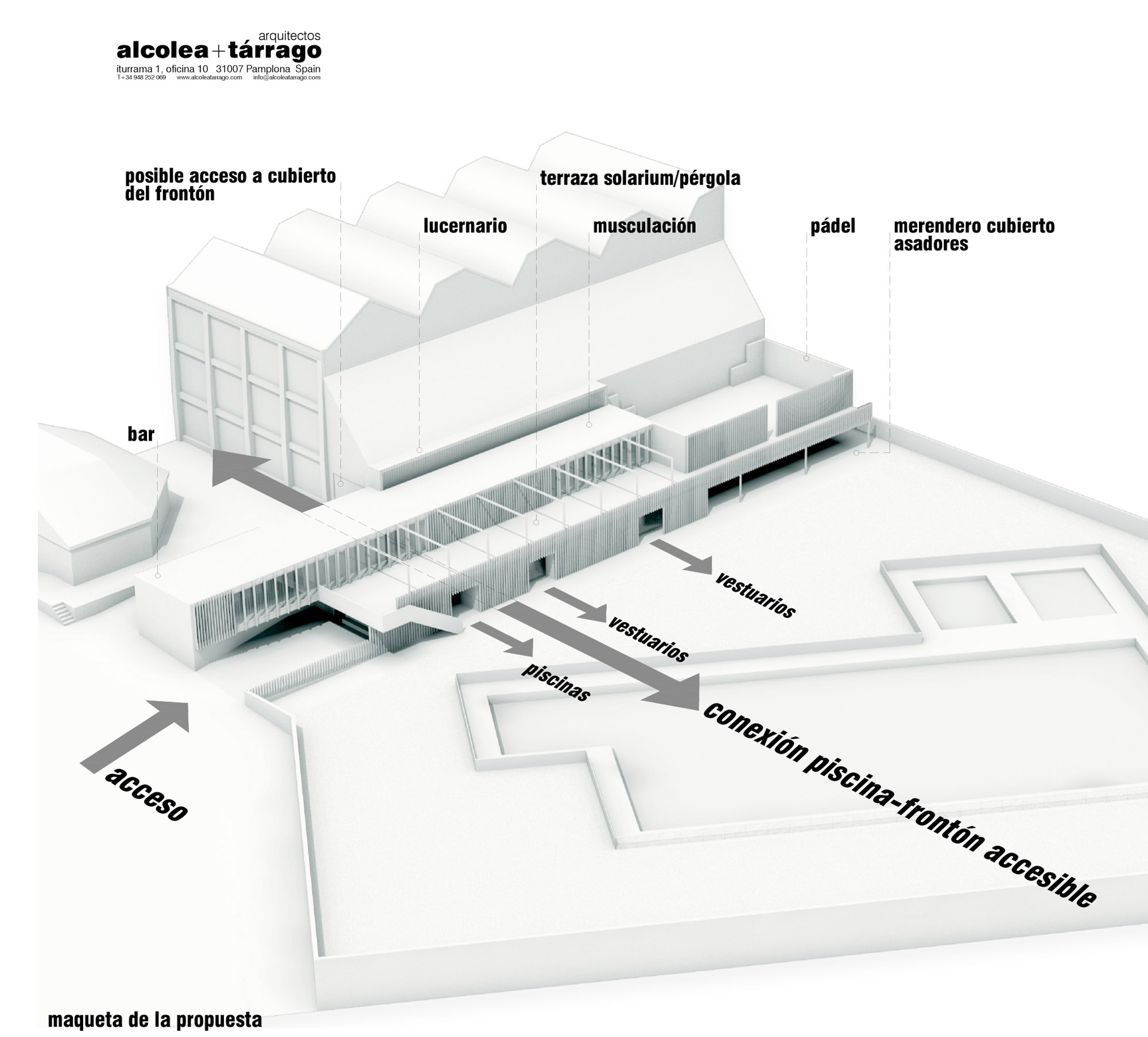 La propuesta, para un concurso, plantea un volumen único en la misma posición que un edificio existente de vestuarios en malas condiciones que debe demolerse pero mantiene íntegramente su sótano, que aloja las máquinas depuradoras de la piscina del complejo deportivo de Arróniz. El edificio se apoya contra un frontón existente y resuelve la conexión entre los dos niveles del solar: el inferior de salida a las piscinas y el superior de acceso al frontón. En la planta inferior, a nivel de piscinas, se ejecutan los vestuarios de grupos y un nuevo acceso principal, a la vez que se consigue un gran espacio cubierto de posible ampliación y de merendero cubierto.