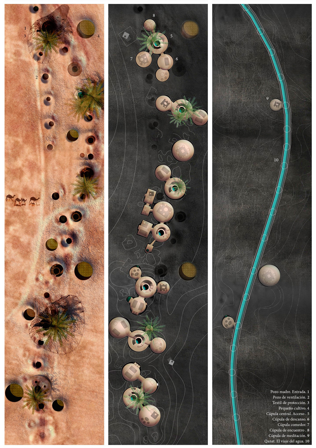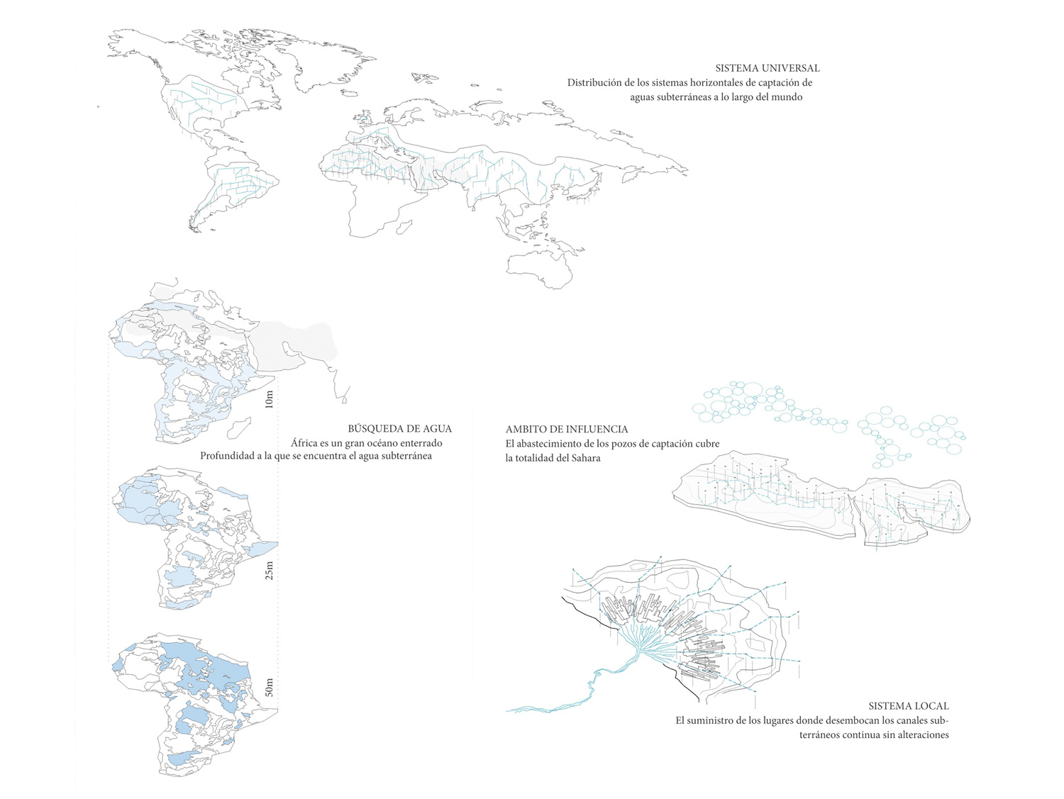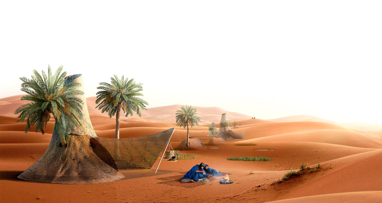 Se propone la reactivación de estas canalizaciones para generar nuevos modos de vida basados en la tradición y materialidad del Sáhara. Las viviendas, refugios que se adentran en el terreno, se apoyan en los pozos subterráneos que le dan soporte, habitabilidad y agua.