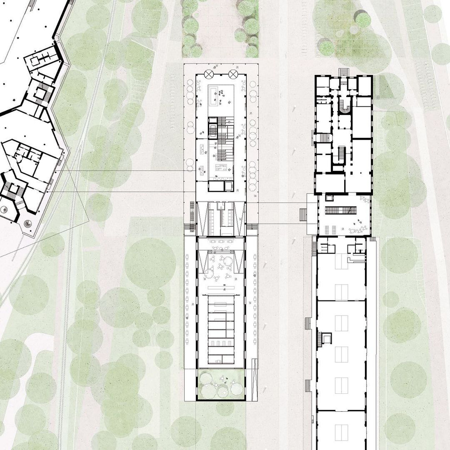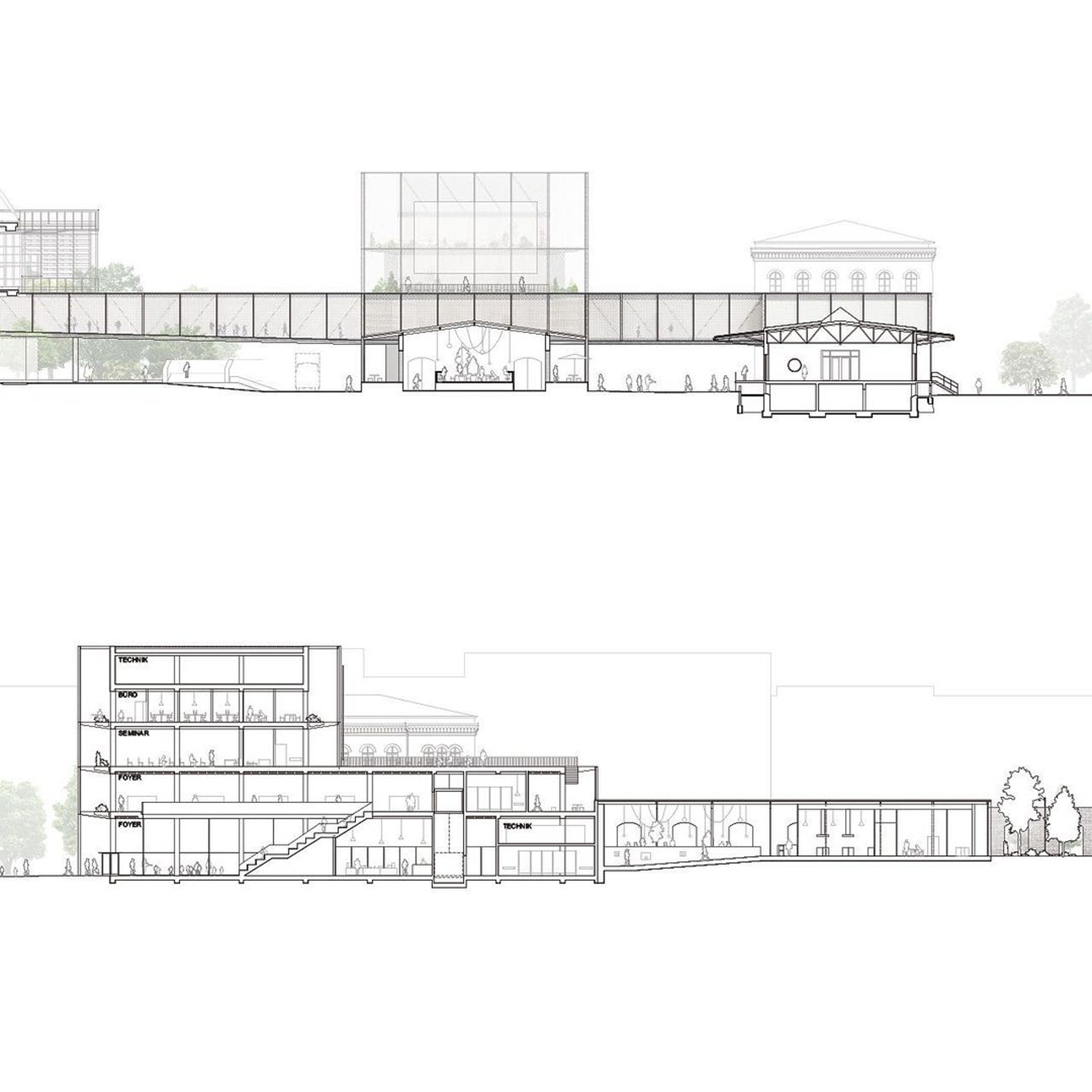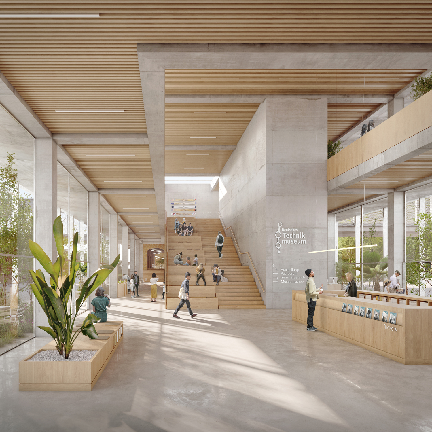 The new entrance building for the German Museum of Technology in Berlin sees itself as a mediator not only between the museum’s existing buildings, but also between the technology clearly anchored in the museum and the nature so present at the site. The open, inviting building with its green entrance plaza stands for a contemporary understanding of technology that does not want to fight nature, but rather cooperate with it. The two shells of the building create an intermediary level between inside and outside, linking the building to the green outdoor space and interpreting the motif of the overgrown ruins and the wilderness of the surrounding park. The building and urban nature are not mutually exclusive, but enter into a symbiosis. In its permeability, the buffer zone strengthens the accessibility of the building and formulates an inviting gesture towards the interior of the public first floor.