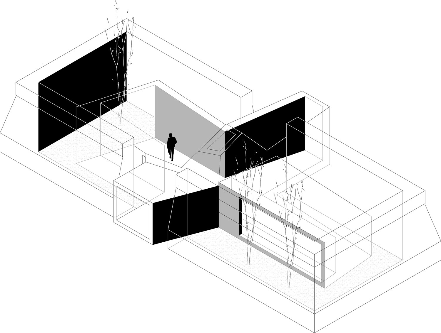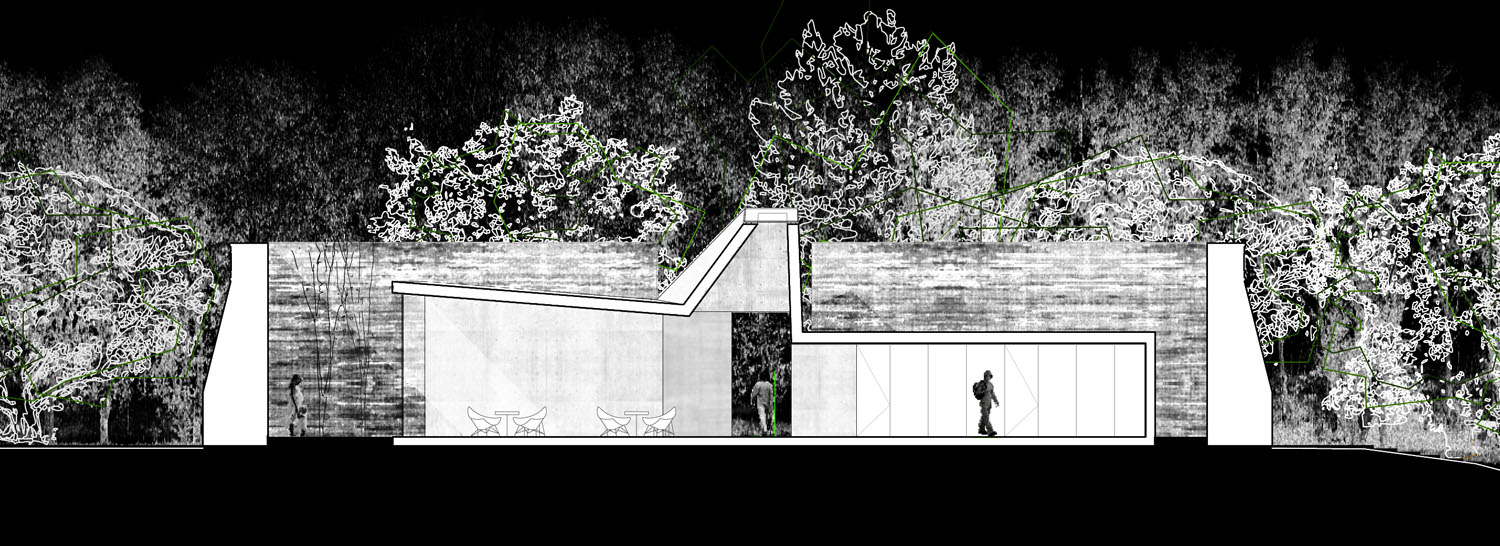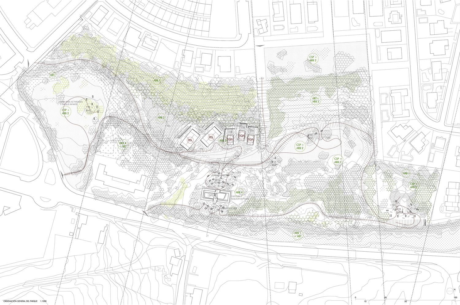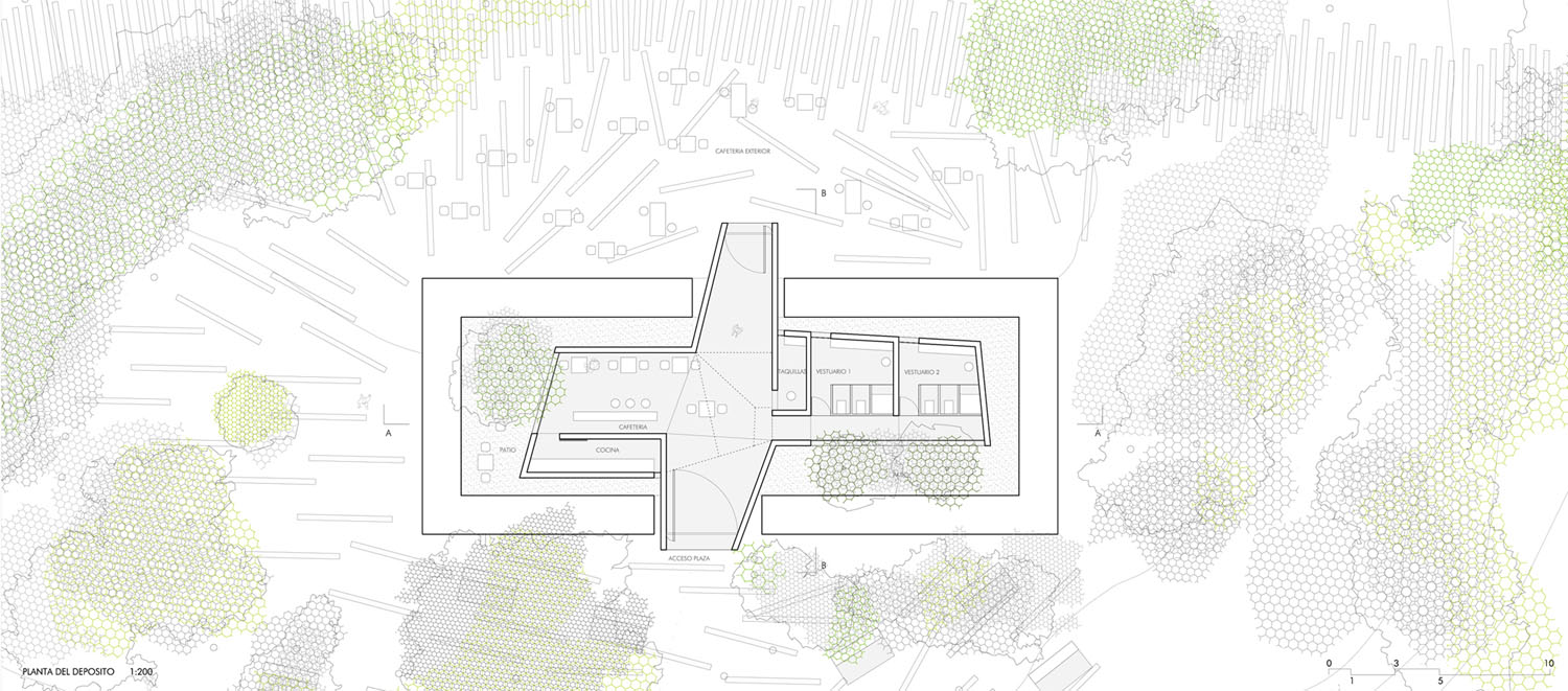 Sobre un antiguo depósito de agua en el parque de Fuencarral sale a concurso el proyecto de unas instalaciones deportivas que doten de este equipamiento a la zona, revitavilizando con ello el uso del parque. El proyecto integra la reforma del depósito de agua y del parque en el que habita. Se ha mantenido la vegetación del parque, y se ha aumentado su densidad y diversidad en aquellas zonas más despobladas, tratando los extremos del parque como bandas que aíslan del tráfico y del ruido de los alrededores. El tratamiento del parque se ha realizado en base a unas bandas vinculadas a la topografía del parque y a unos sectores relacionados con el entorno del mismo. El depósito mantiene su imagen original. Su transformación se centra en una pieza que se posiciona en su interior articulándose en unos patios intermedios a los que se abre el programa. El programa del que hablamos son las taquillas para alquiler de las pistas deportivas, los vestuarios y una pequeña cafetería. La pieza sale del depósito generando dos entradas y volcando parte del programa al exterior (terraza de la cafetería). Las pistas del centro deportivo se sitúan integradas y envueltas por el parque y su vegetación.