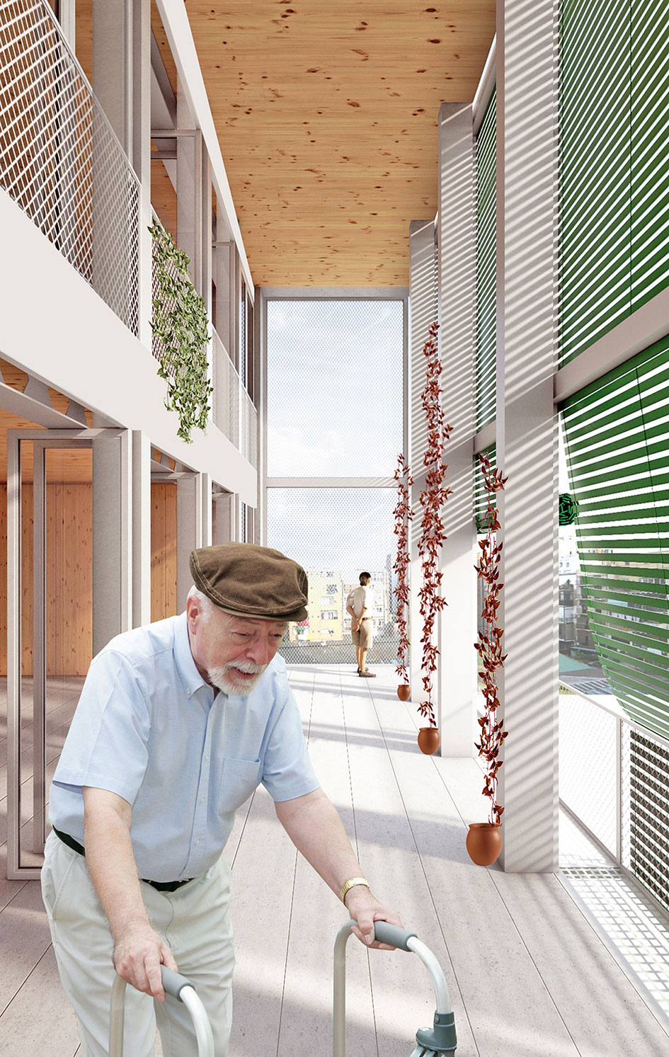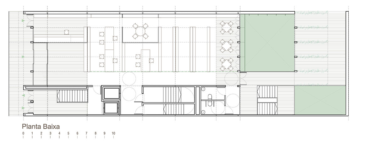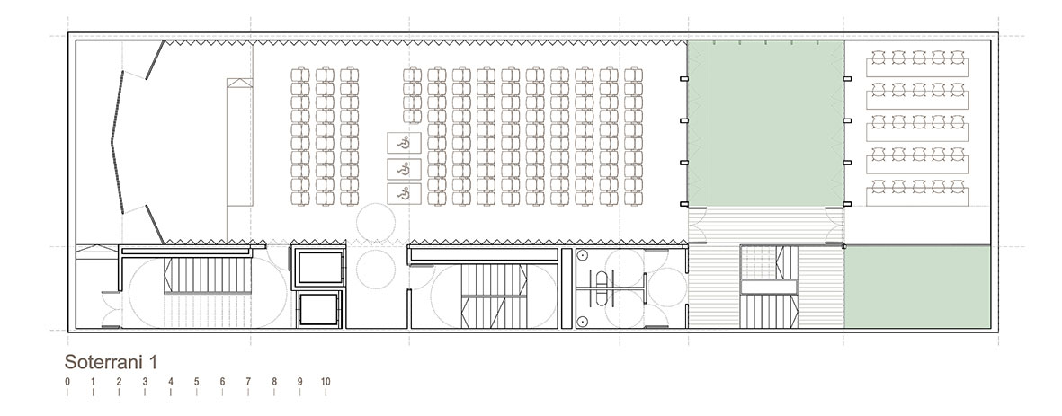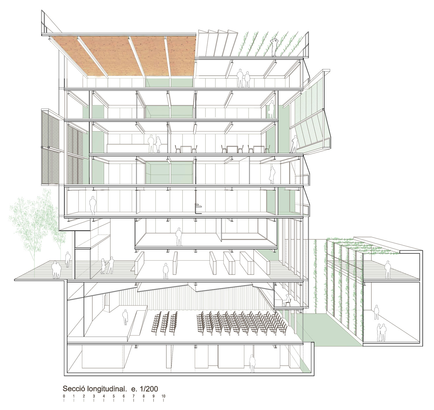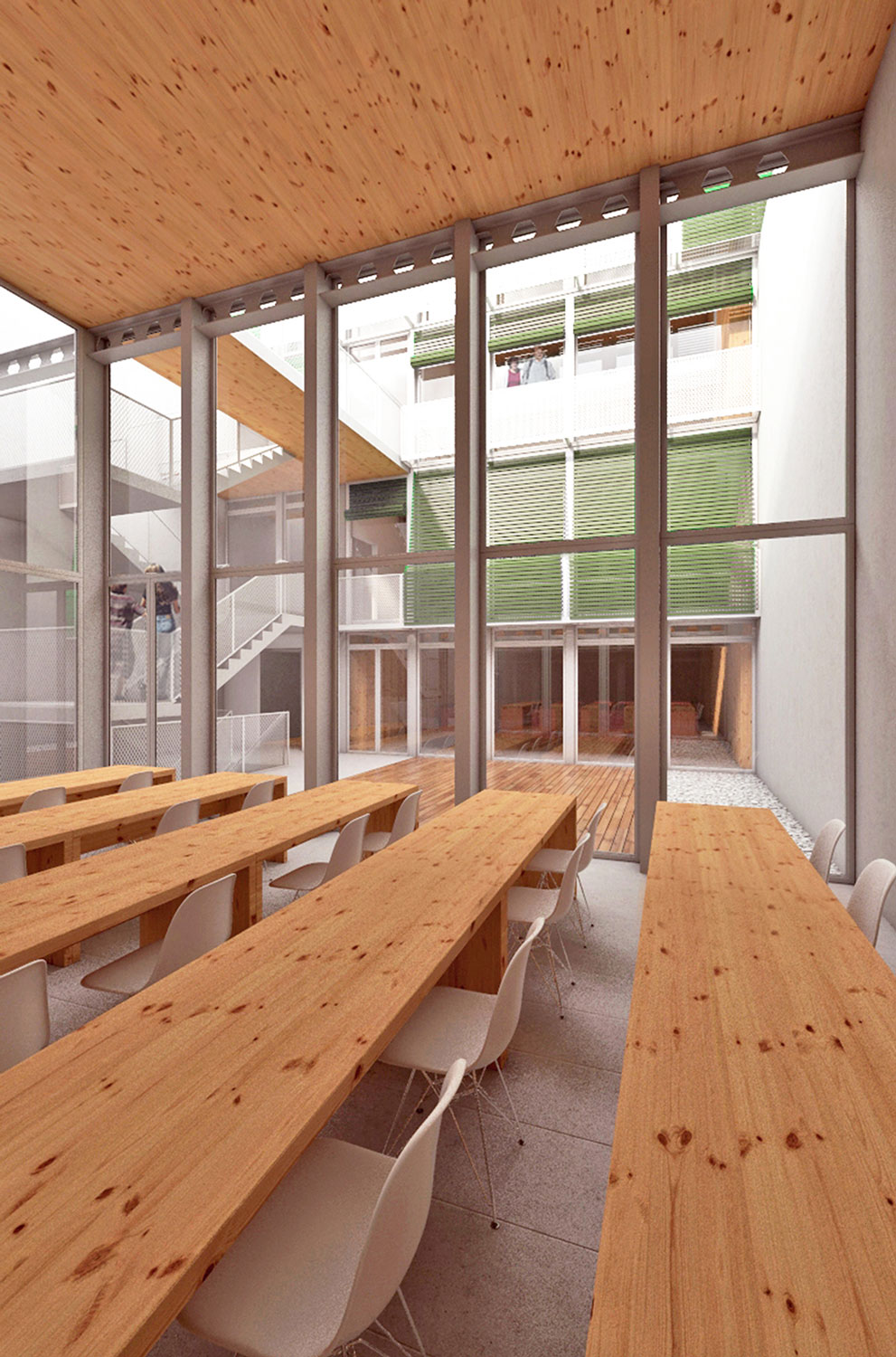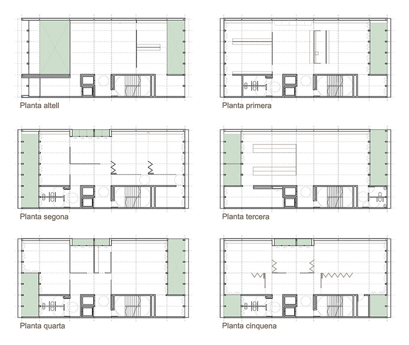 La riqueza de la arquitectura del ensanche no sólo se descubre a través de los mecanismos de las plantas, también leyendo sus secciones. Es aquí donde esta propuesta explora las posibilidades de los espacios que denominamos “In Between”. Sabedores de la importancia para el ensanche del tradicional patio de edificio que quiere acercar la luz a las crujías más centrales y que se comporta como una segunda fachada que la arquitectura incorpora para domesticar esta generosa edificabilidad alargada, se propone una organización que incorpore un sistema perimetral de vacíos para llenar aire y luz el edificio. Es aquí donde la propuesta recoge la rica tradición arquitectónica de los patios y de las fachadas al ensanche, y que se traduce con la investigación e interpretación de los espacios intermedios. Aquellos que para situarse entre “piel y cuerpo” disfrutan y procesan los caracteres de interior/privado y de exterior/público, convirtiéndose funcionalmente en el espacio intermedio, pero no necesariamente en medio del edificio. Flexibilidad y simplicidad son las variables que con mayor incidencia determinarán la eficacia de los distintos espacios. Proyectamos en base a un organismo constructivo y funcional fundamentado en las mínimas leyes organizativas. Todos los espacios; despachos, salas de reunión y áreas de encuentro tendrán luz natural y ventilación exterior directa y buscarán además su prolongación en alguna de las espacios “in between» de sección y ubicación variable, pequeñas islas de relación y descanso que permiten controlar climáticamente el edificio de manera natural.