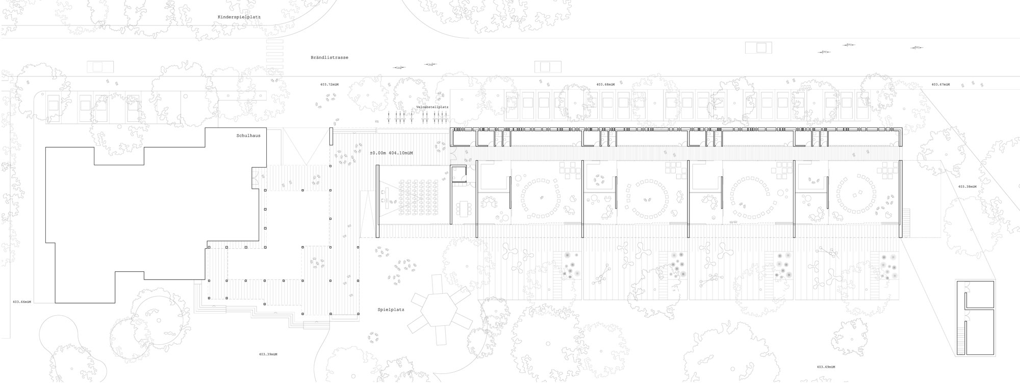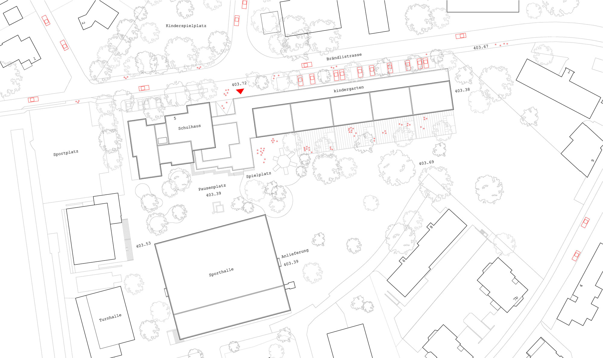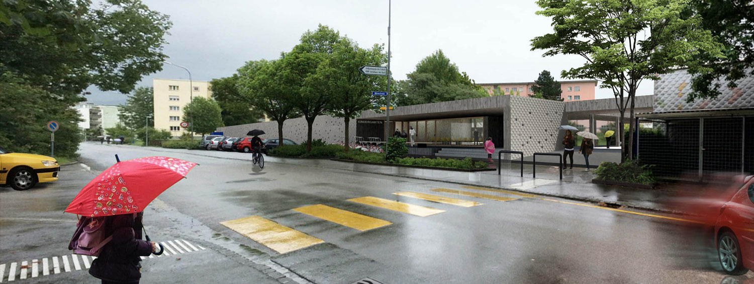 Über der Hochwasserschutzhöhe besetzt das Gebäude die Grundstückskante zur Brändlistrasse hin sowie die nordöstliche Ecke des Wettbewerbsperimeters. Das neue Gebäude reagiert auf die aktuelle städtebauliche Situation: Mit der Positionierung der neuen Kindergarteneinheiten entlang der Strasse bildet das neue Gebäude in Zusammenspiel mit dem bestehenden Schulhaus die neue Strassenfassade des Schulareals.