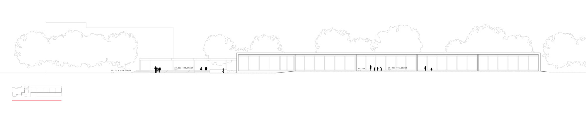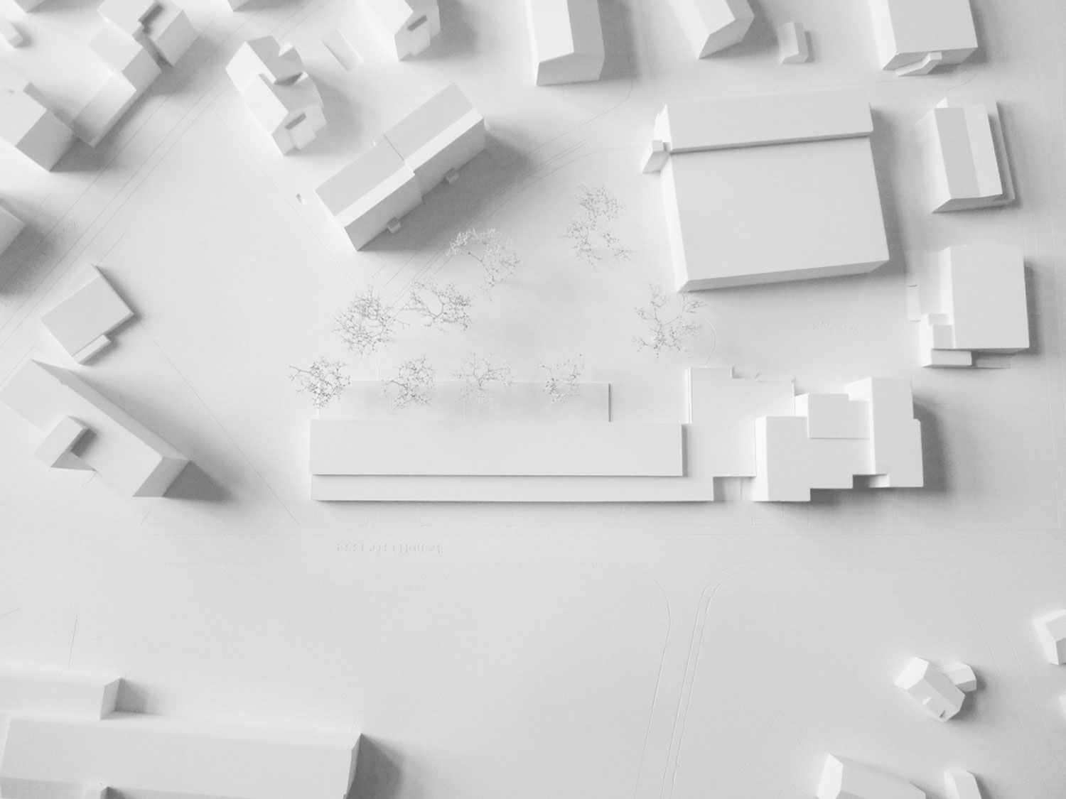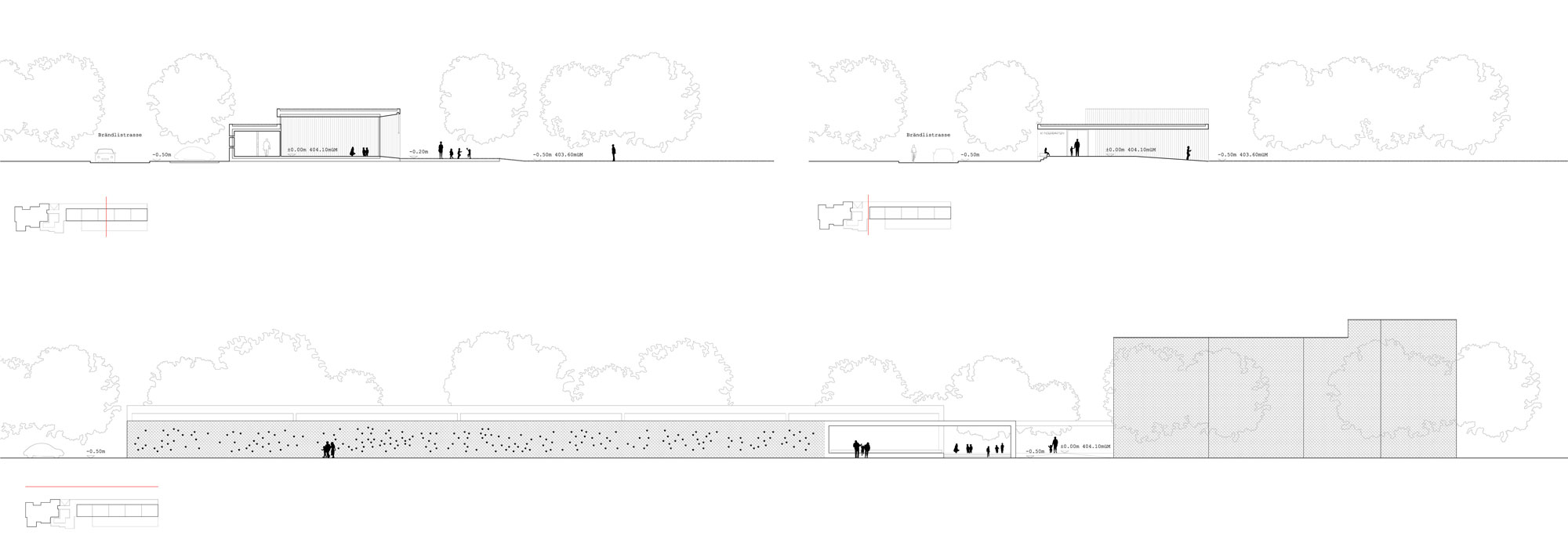 Über der Hochwasserschutzhöhe besetzt das Gebäude die Grundstückskante zur Brändlistrasse hin sowie die nordöstliche Ecke des Wettbewerbsperimeters. Das neue Gebäude reagiert auf die aktuelle städtebauliche Situation: Mit der Positionierung der neuen Kindergarteneinheiten entlang der Strasse bildet das neue Gebäude in Zusammenspiel mit dem bestehenden Schulhaus die neue Strassenfassade des Schulareals.