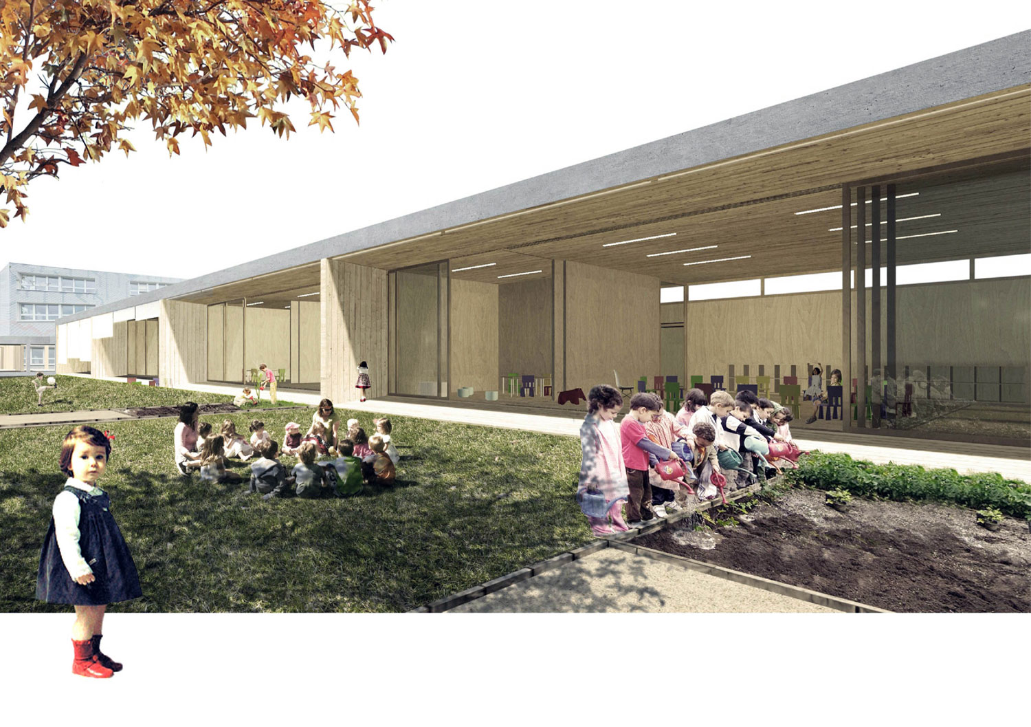 Mit der Erstellung des Gebäudes an der Nordkante der Parzelle bleibt die Südseite frei erhalten, um zu ermöglichen, dass die Kinder den Ausblick ins Grüne haben. Die Aussenanlagen sind als eine Verlängerung des Klassen- und Gruppenraums geplant, um die Beziehung zwischen aussen und innen zu betonen.
