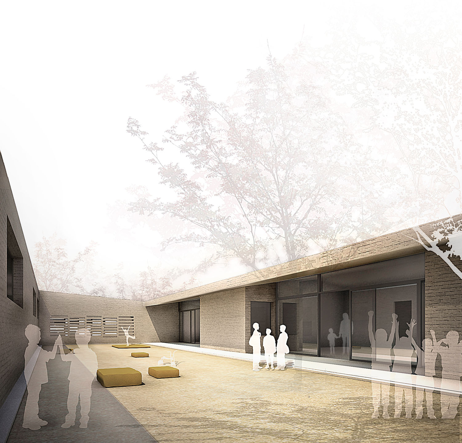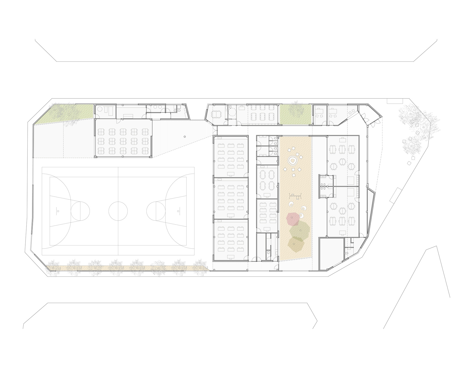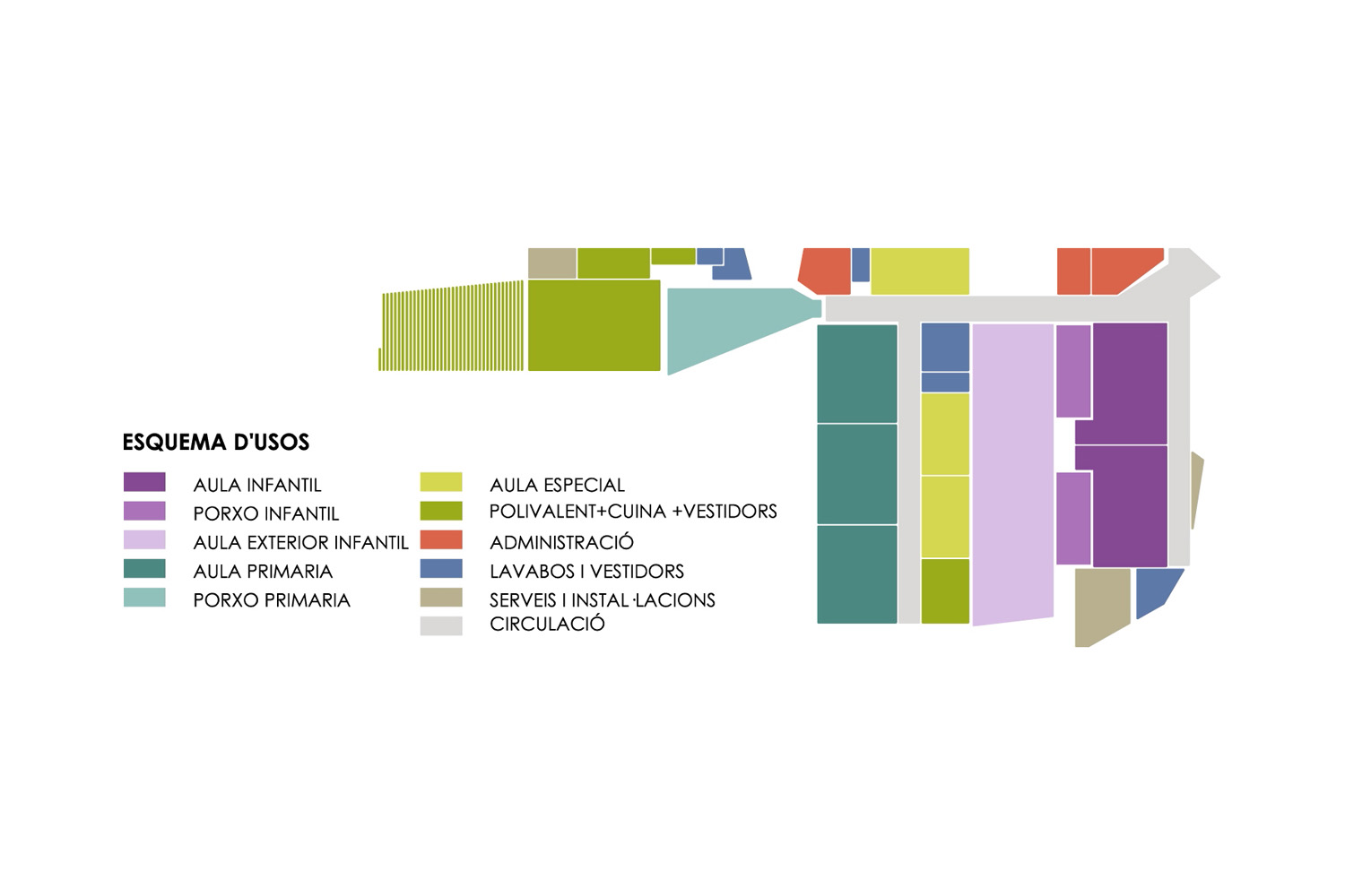 – El projecte pren l’estructura tipològica de casa pati d’una sola planta per tal de configurar els seus espais i d’aquesta manera, adaptar-se a un entorn caracteritzat per unes edificacions que esgoten els límits edificables i que segueixen les alineacions dels vials. El solar es tanca amb un mur perimetral que amaga i protegeix tant els patis de l’escola com els seus espais interiors. Aquest, quan es necessari es perfora per tal d’aconseguir ventilació, llum o transparències visuals entre l’espai públic i l’escola i adopta de manera contínua tant les alçades de l’edificació com l’alçada de la tanca dels patis.