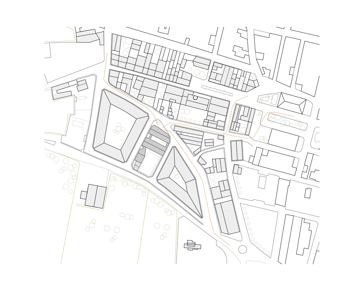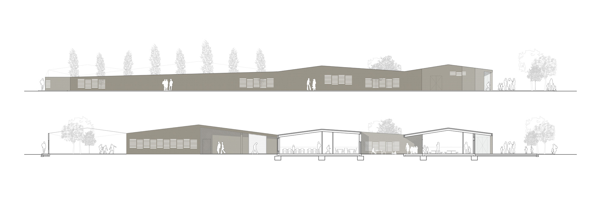 – Les cobertes del projecte són inclinades a dues aigües per tal de vincular la seva forma i funcionament a les cobertes de l’entorn.