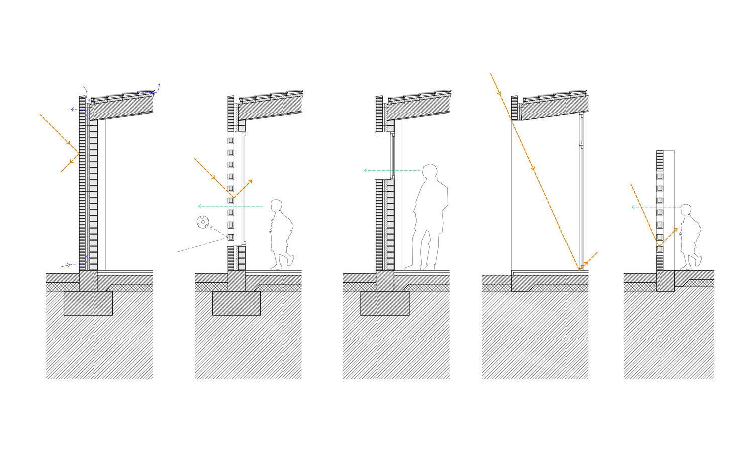 Els tancaments exteriors es plantegen com un sistema continu i adaptable a les diferents situacions en les que es troba: opac / obert i protegit / obert i orientat a nord / porxo / tanca / … Es planteja una façana ventilada. Per la seva duresa com pel seu poc manteniment, la fulla exterior d’obra vista és un element òptim per fer de límit del solar i per crear, mitjançant gelosies, bones proteccions solars, tanques semitransparents o privacitats. Les cobertes també es plantegen ventilades i s’acaben amb una teula ceràmica plana.