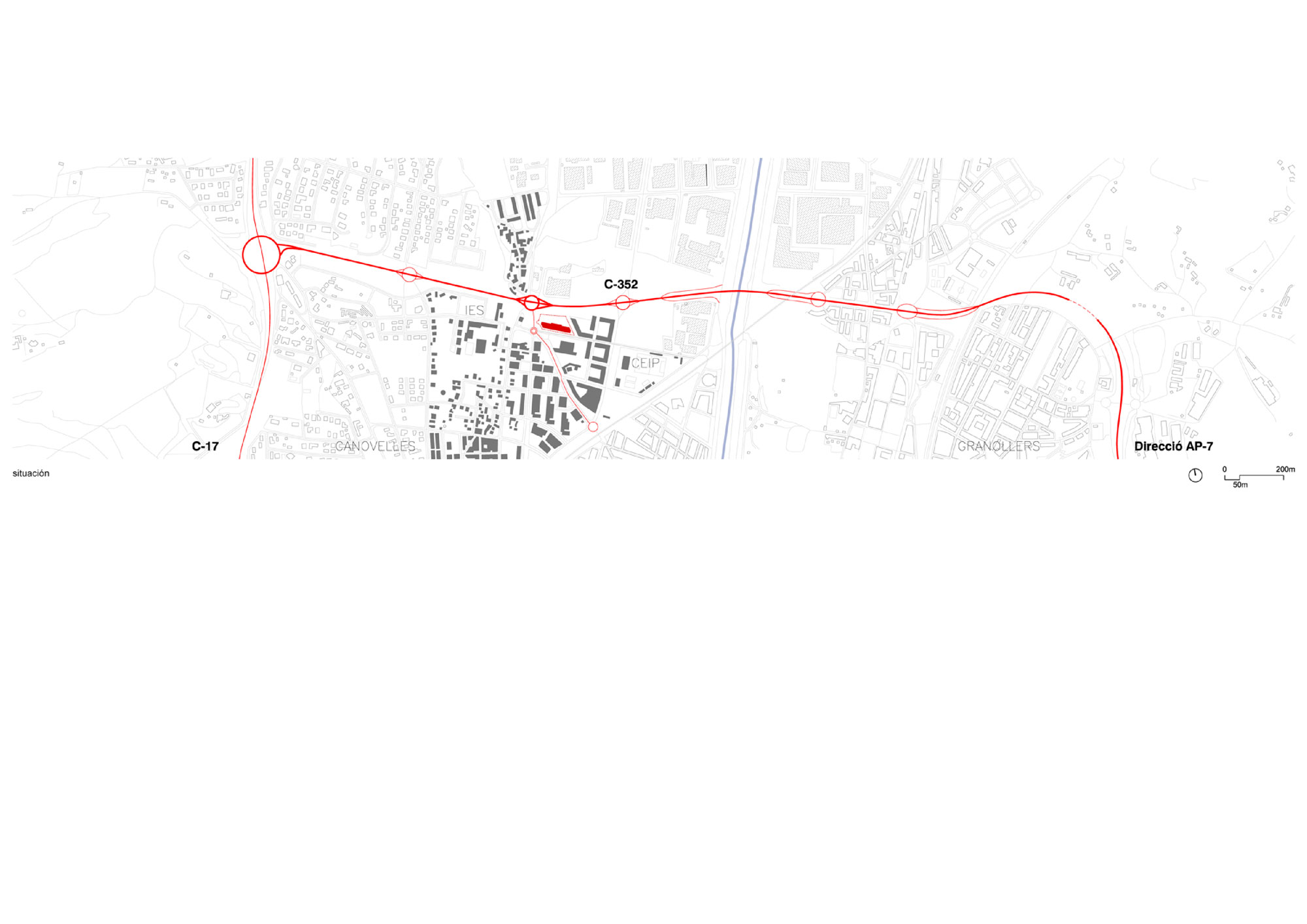 Canovelles es un pueblo históricamente rural. Hoy el solar se sitúa entre el núcleo más antiguo y los nuevos crecimientos industriales, cerca de la autovía C-352. Alejamos la escuela del tránsito y el ruido de la circulación rodada de la autovía y la pegamos al lado sur del solar. Las aulas de primaria miran hacia el patio, que actúa como filtro acústico y visual. La escuela se alinea a la calle de Santa Madrona, dando continuidad a las fachadas de los futuros bloques de vivienda y consolidando el entorno. Desde esta calle se accede a la escuela, ensanchando la acera hasta la rotonda para poder garantizar la seguridad de los niños en la entrada y salida del recinto.