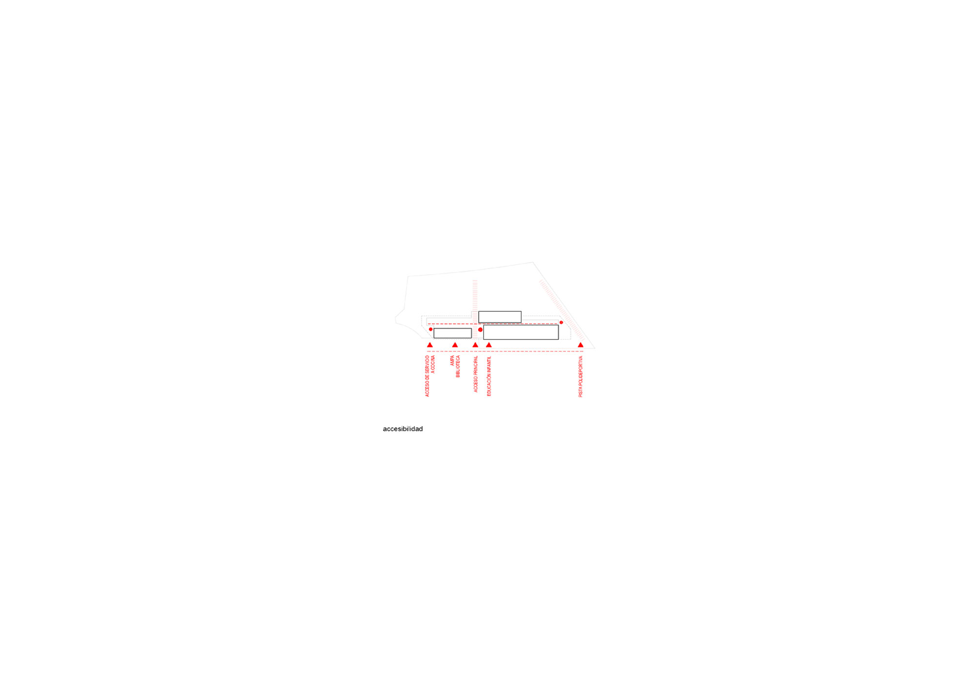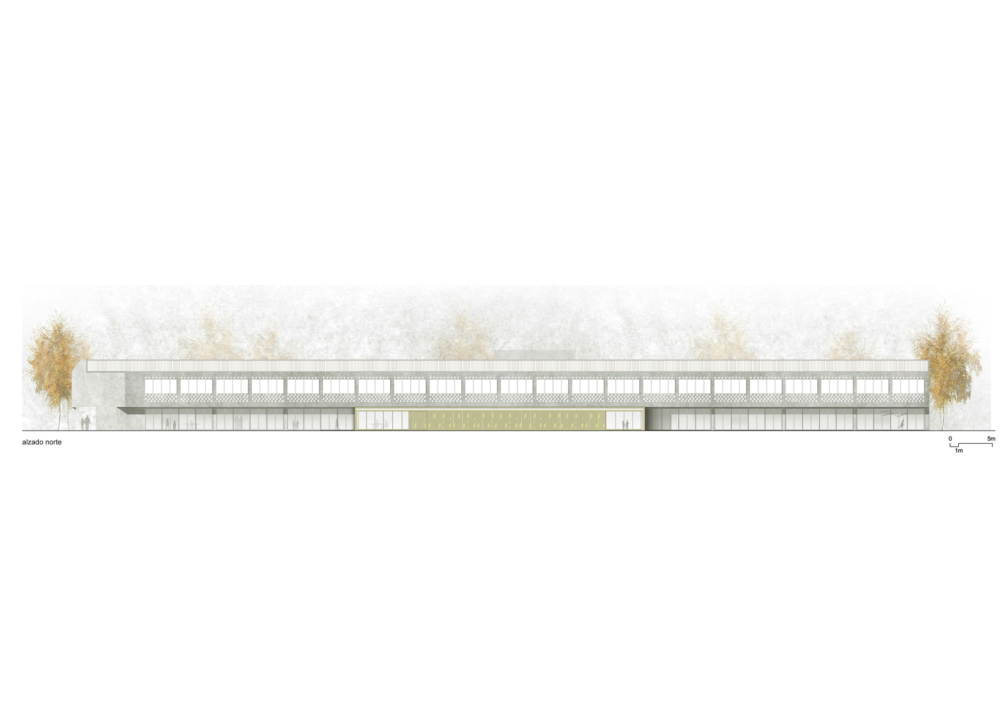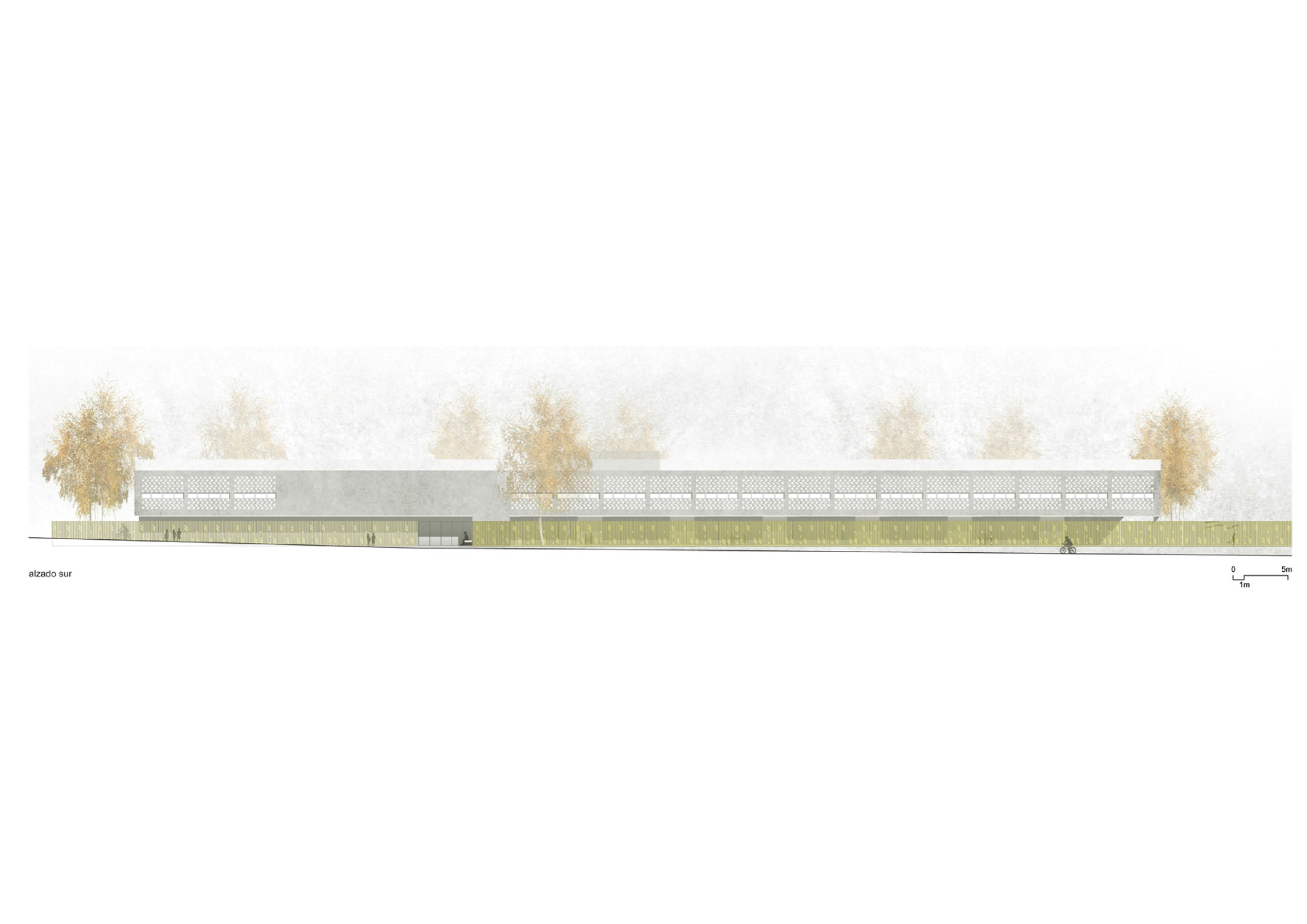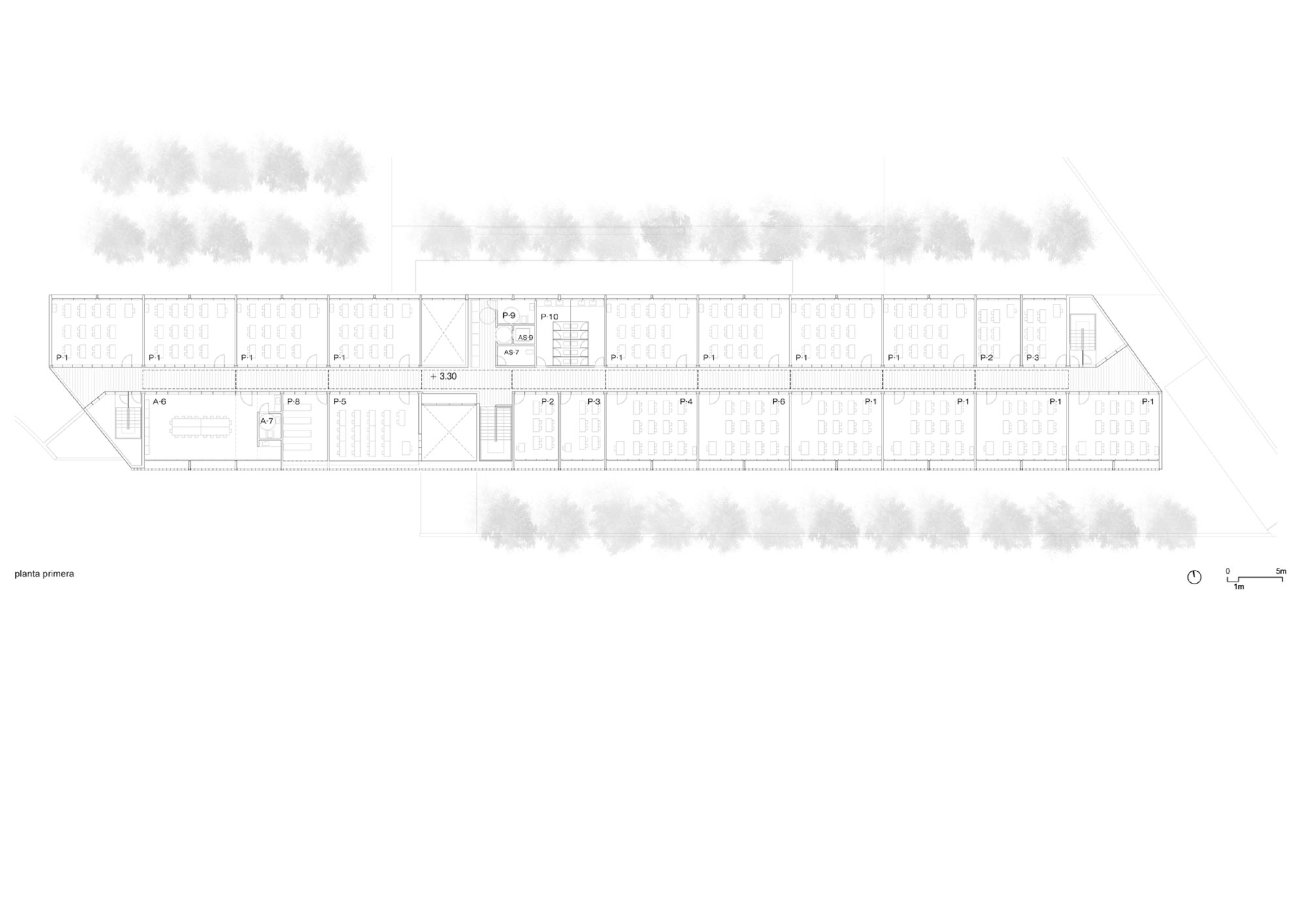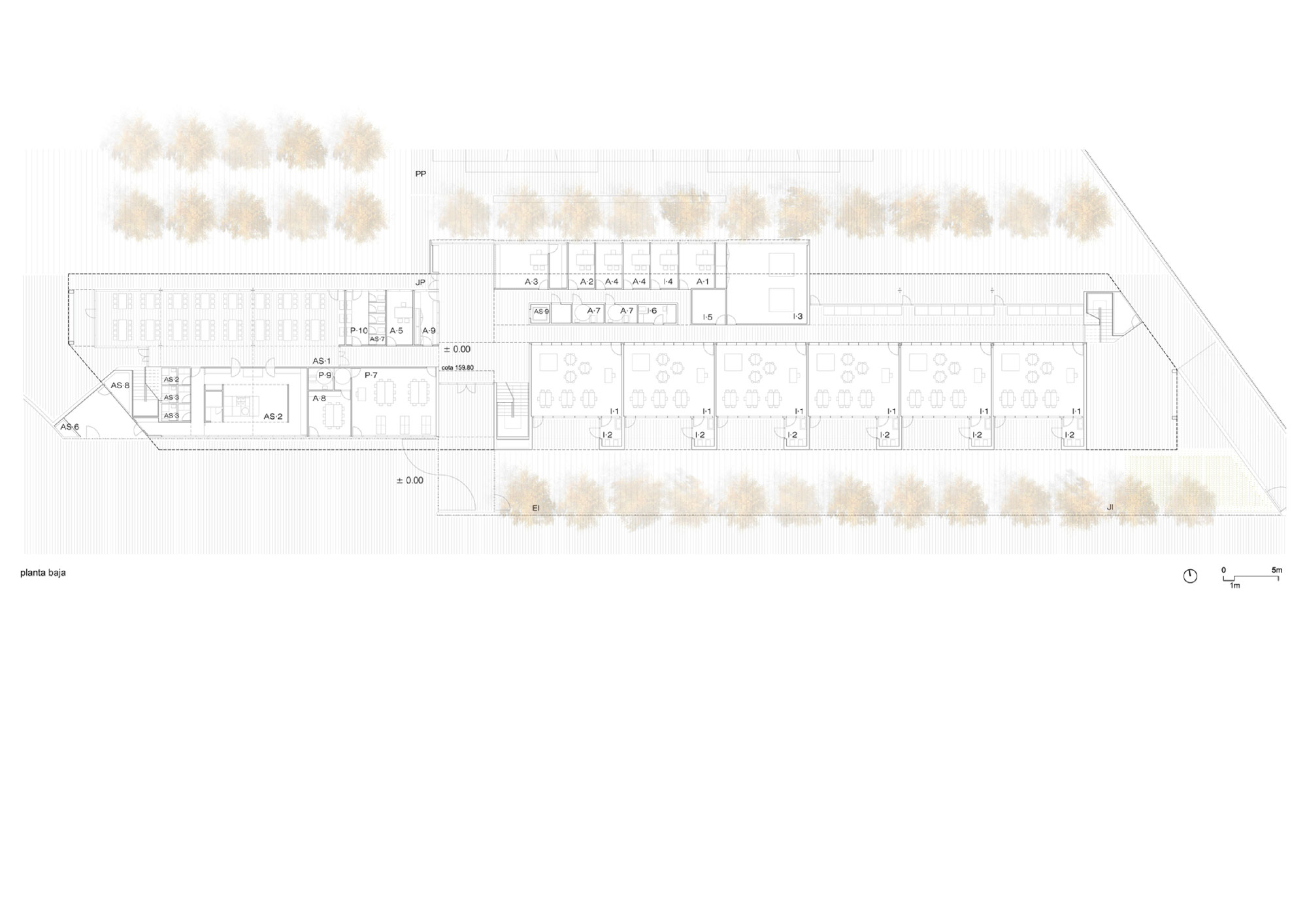 La escuela se organiza en dos plantas muy compactadas, situando el área infantil en la planta baja y el área de primaria en la planta primera. El resto de programa se desarrolla todo en la cota de acceso. Desde la entrada se controla y se distribuyen todas las áreas programáticas. Se prevé el acceso exterior independiente al área infantil para facilitar la entrada y la recogida de los niños más pequeños. La biblioteca y AMPA también tienen acceso directo y autónomo desde el exterior. El área de servicios (comedor y cocina) disponen de una entrada independiente desde la calle y alejado del acceso principal a la escuela. Finalmente, y también desde la calle, pero desde el otro extremo del solar, se prevé el acceso a las pistas. El edificio permite segregar fácilmente la línea 1 de la 2, así como la sala del gimnasio. En caso de que la segunda línea se construya en una fase posterior, este crecimiento se ha previsto en los extremos para poder sectorizar las obras y garantizar que éstas sean accesibles desde la calle y evitar interferir en el día a día de la escuela.