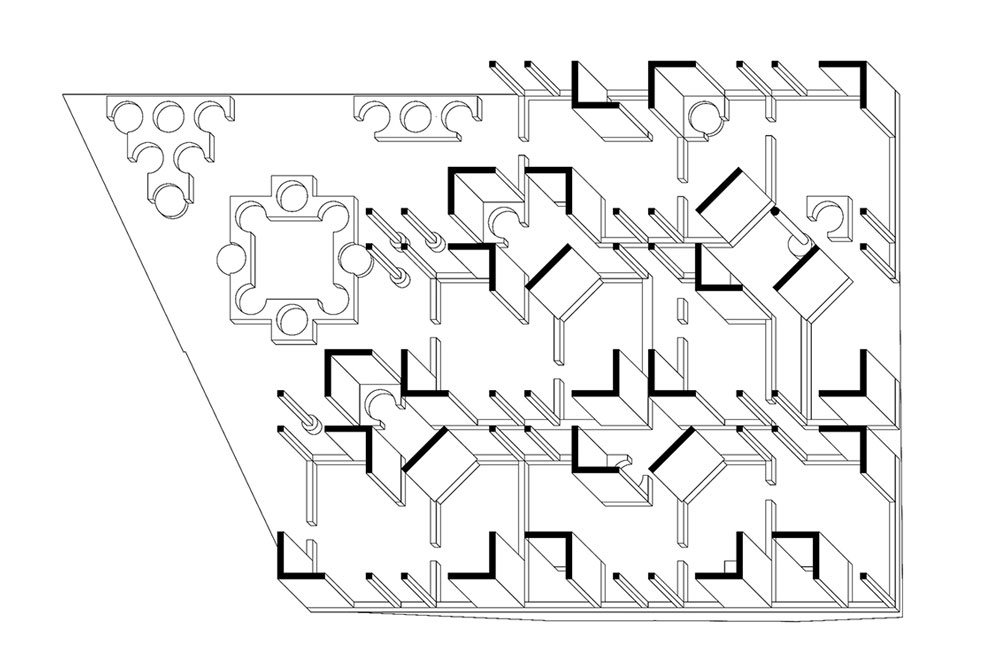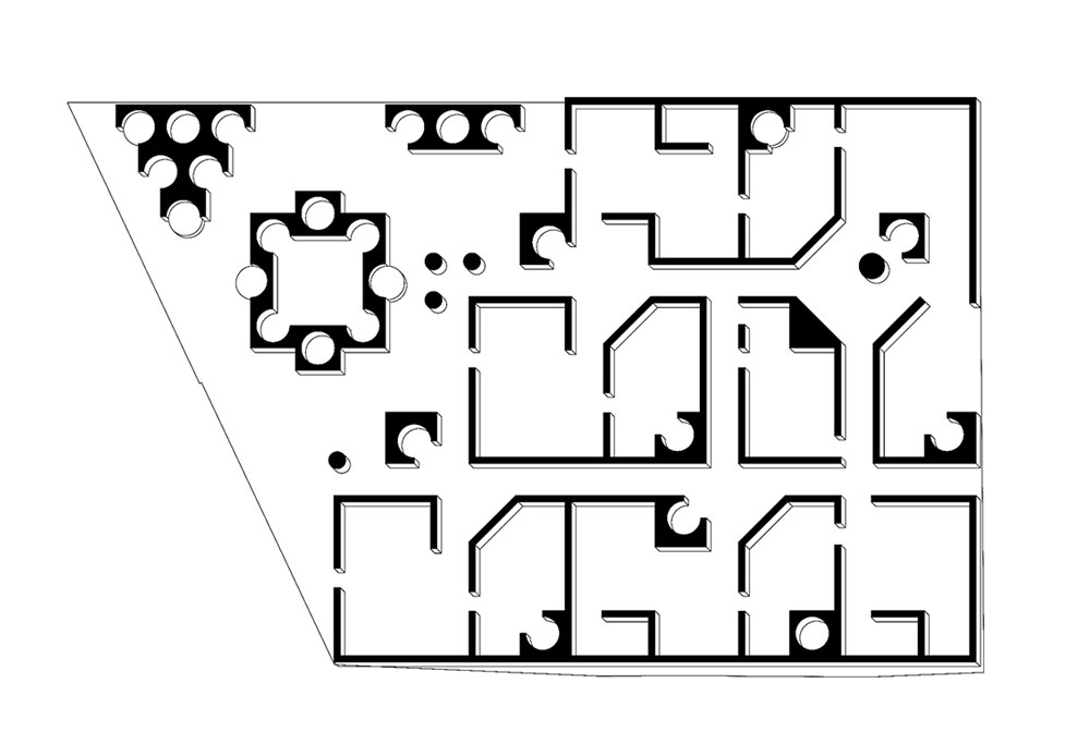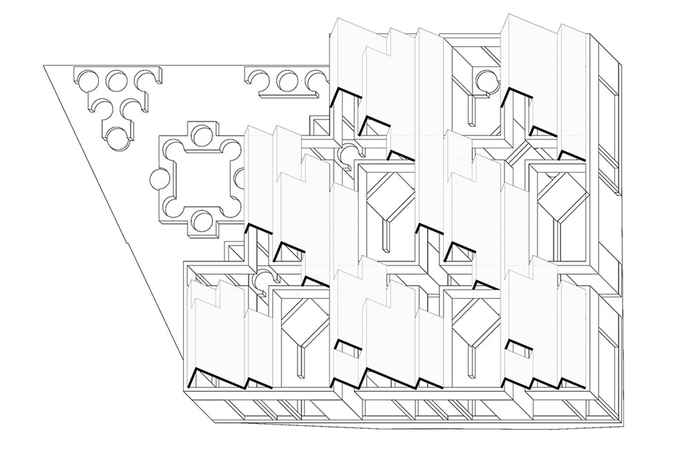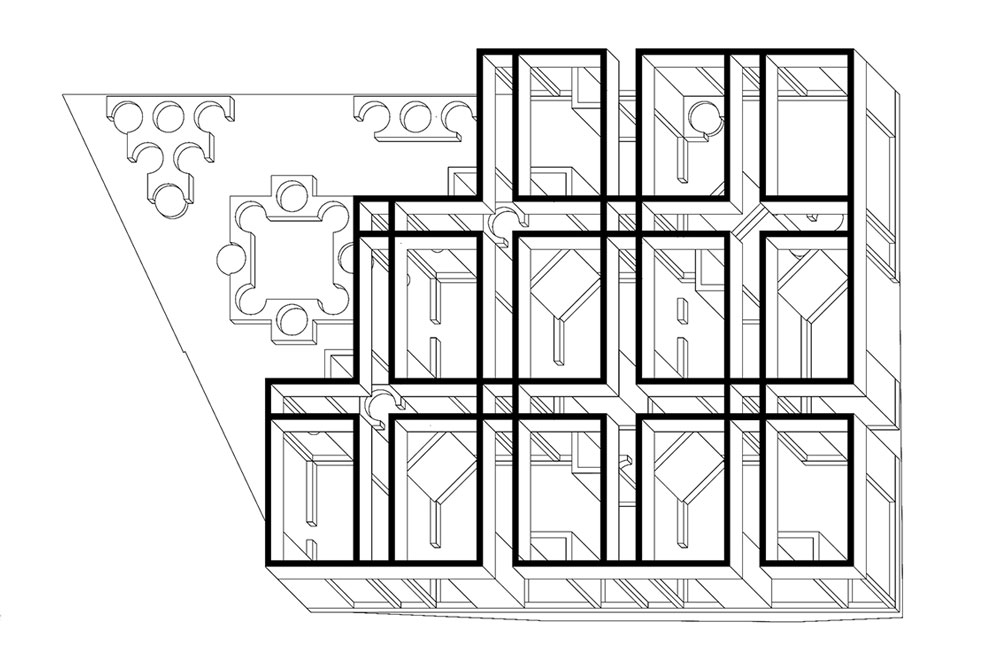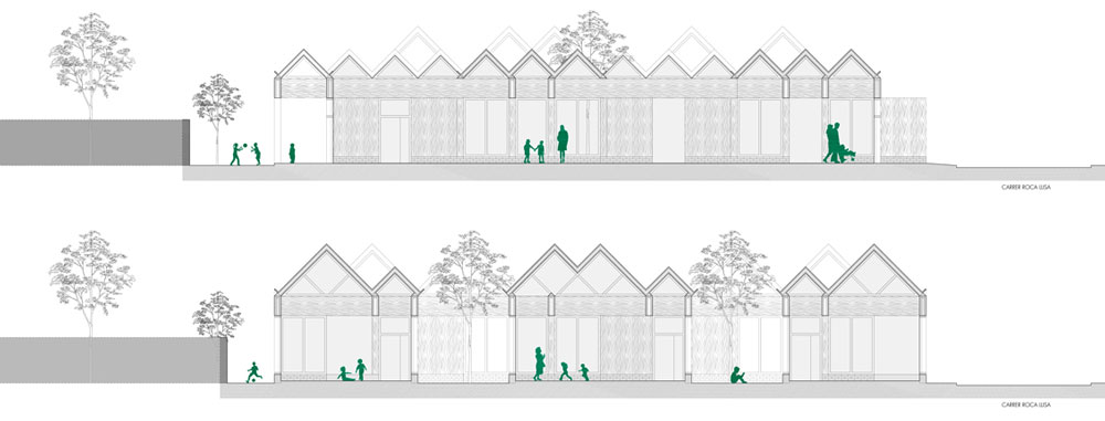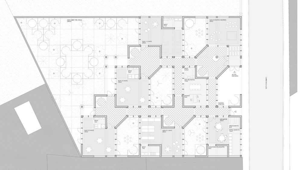 La caracterización de estos espacios intermedios se resuelve mediante lucernarios y a través de la definición cuidada de los puntos de cruce o nodos del sistema, en los que se despliega y queda visible el sistema estructural. Estos espacios de cruce son colonizados por un mobiliario pétreo que admite múltiples usos: bancos de espera, lugares de reunión, espacios de juego. El suministro de luz natural y de aire se maximiza con el fin de crear un ambiente estimulante para el aprendizaje. Los espacios destinados al profesorado se localizan en una posición central, próximos al acceso a la escoleta. El aula de usos múltiples y el comedor se ubican en el perímetro del edificio, frente a la calle, permitiendo un acceso independiente a los mismos fuera del horario escolar. La definición del sistema en planta posibilita una extensión futura de la escoleta hacia el sur, resultando muy fácil proponer una ampliación de una o dos aulas con sus correspondientes patios.