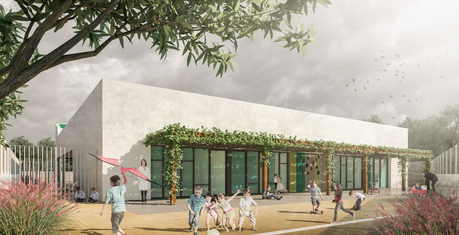 La naturaleza es un concepto que los sociólogos, así como los docentes, la han considerado fundamental en la educación de los niños. No es de extrañar, que este tipo de equipamientos se llamen también “jardín de infancia” o Kindergarten. Por ello mismo, la vegetación y los árboles, se utilizan en el proyecto como un elemento constructivo más. Además, se utiliza metafóricamente la geométrica y colores de los bosques para que el conjunto del edificio se aproxime más a este concepto, la naturaleza. Ello se puede presenciar en la verticalidad de las carpinterías, así como en sus colores verdosos y marrones verticalizados de la fachada, muy presentes en la entrada. Se ofrece un porche de hoja caduca como elemento de protección solar en verano. También se prevén zonas arboladas.