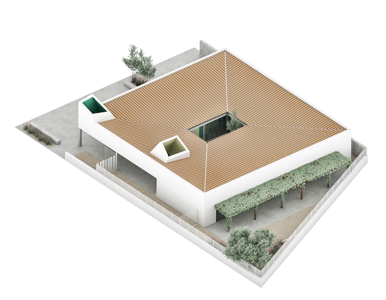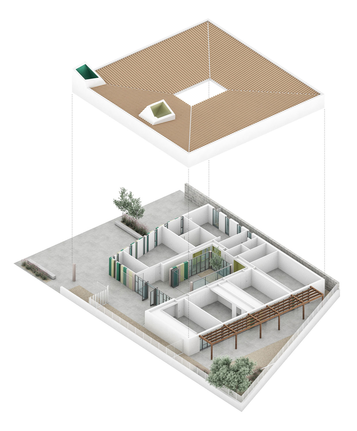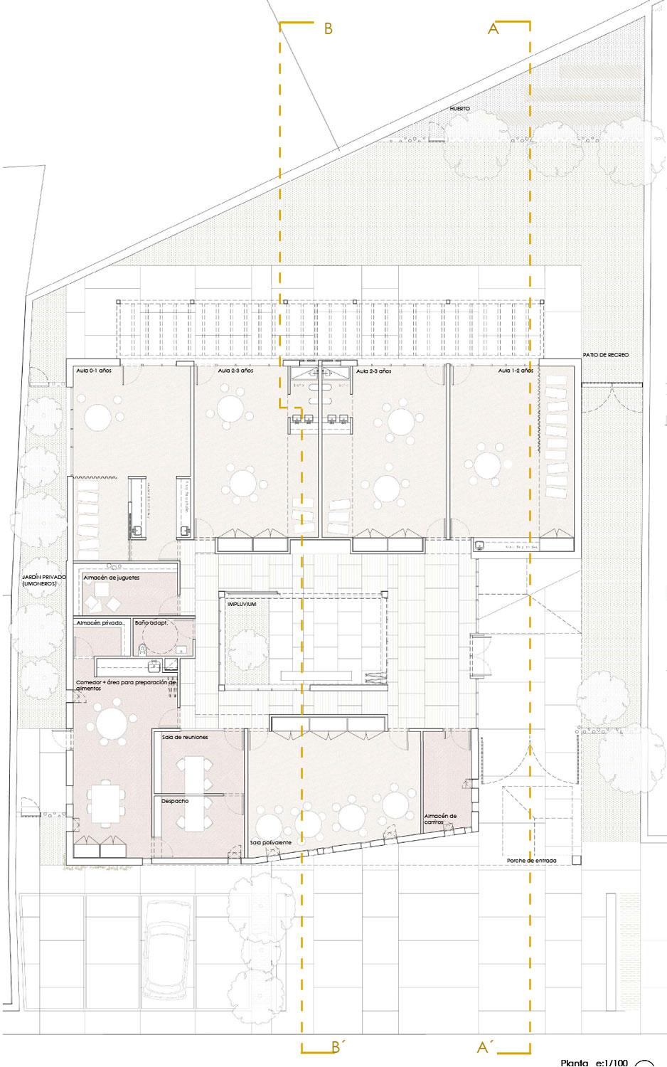 Toda la escoleta se estructura respecto un patio central, imitando a los impluviums romanos. Además, centralizando todo el espacio común en un mismo punto central, minimiza la superficie necesaria de espacios comunes interiores. Este patio, nos aporta luz a todas las zonas comunes, concentradas alrededor de él. Además, nos permitirá tener ventilaciones de aire cruzadas, y servirá para que toda el agua pluvial de la cubierta se pueda almacenar en un aljibe subterráneo. Este impluvium, permite estar totalmente abierto, para que se fusione con los pasillos tangentes a él, y consiguiendo así, un vestíbulo mayor, o incluso una nueva aula común. El patio central, el impluvium, es la esencia de este proyecto.