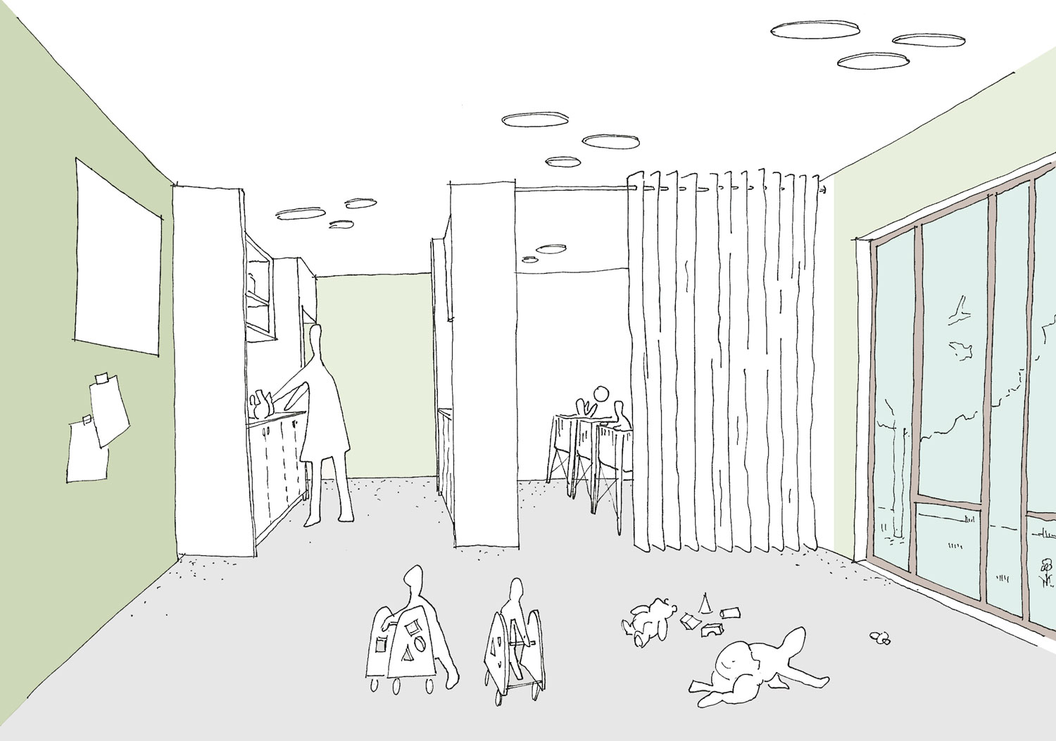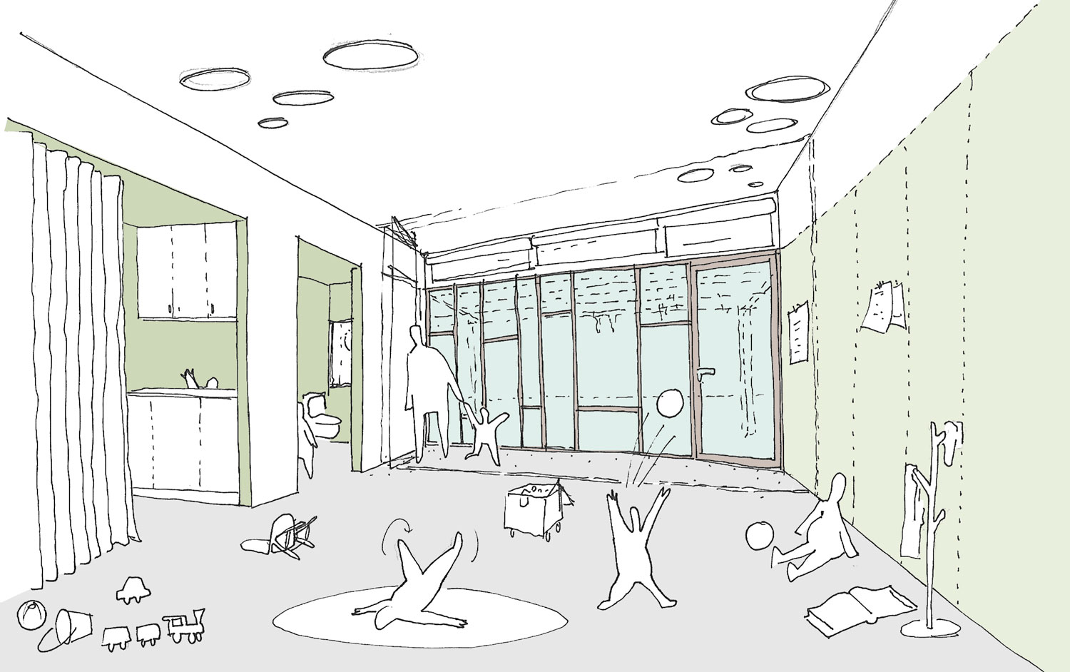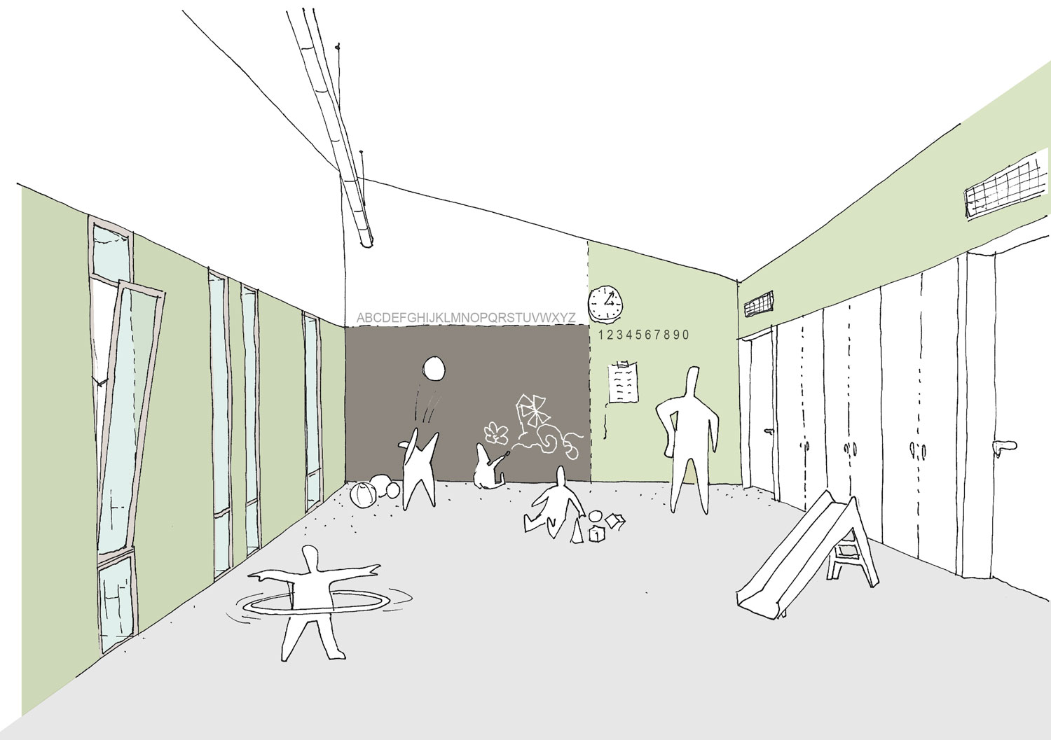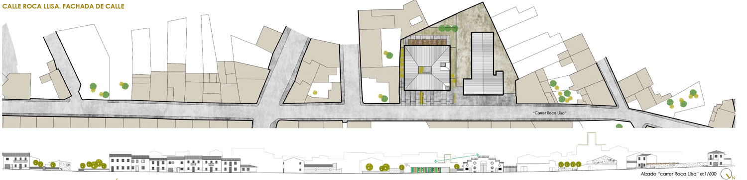 Un centro de primer ciclo de educación infantil (“una escoleta”), supone un equipamiento donde tiene gran importancia la relación con el espacio público, debido a que su uso implica una agrupación de niños entrando y saliendo a determinados momentos del día, así como sus padres tienen que esperarlos. La propuesta parte como preferencia, generar un espacio público. Este nuevo espacio que se le regala a la población, pretende fusionarse con la dilatación urbana de la calle “Roca Llisa” generada por el edificio colindante, cuyo uso es de oficina y almacenaje. La Escoleta se propone como un volumen libre en la parcela, para que se mimetice con el edificio colindante y así generar un mismo espacio público. El edificio funciona todo el en planta baja, de cubierta inclinada, en su mayor parte sostenida por tabiques conejeros (así evitar problemas de goteras), donde en su interior se ubicarían las maquinarias de instalaciones necesarias.