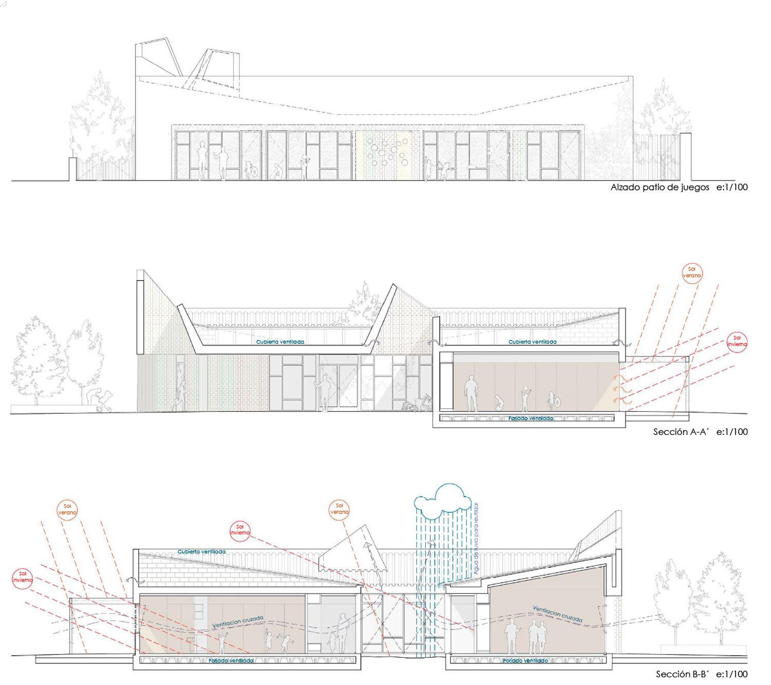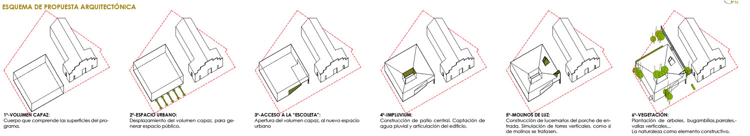 Llubí es población de molinos, “construcciones verticales y puntuales por el hombre que aprovecha los recursos naturales como el aire, para generar grano, energía…”. El concepto de molino, se metaforiza en la “Escoleta” por medios de lucernarios que se encuentran en el porche de entrada y espera de los padres. Capturan la luz solar, para trasladarla a este espacio orientado por defecto a Norte como consecuencia del emplazamiento. Por otro lado, con los dos lucernarios que imitan a dos molinos, se monumentaliza este nuevo equipamiento, compitiendo con el edificio colindante de fachada característica ya comentado, y así, generar un espacio público más equilibrado. Como consecuencia se revaloriza la calle Roca Llisa.