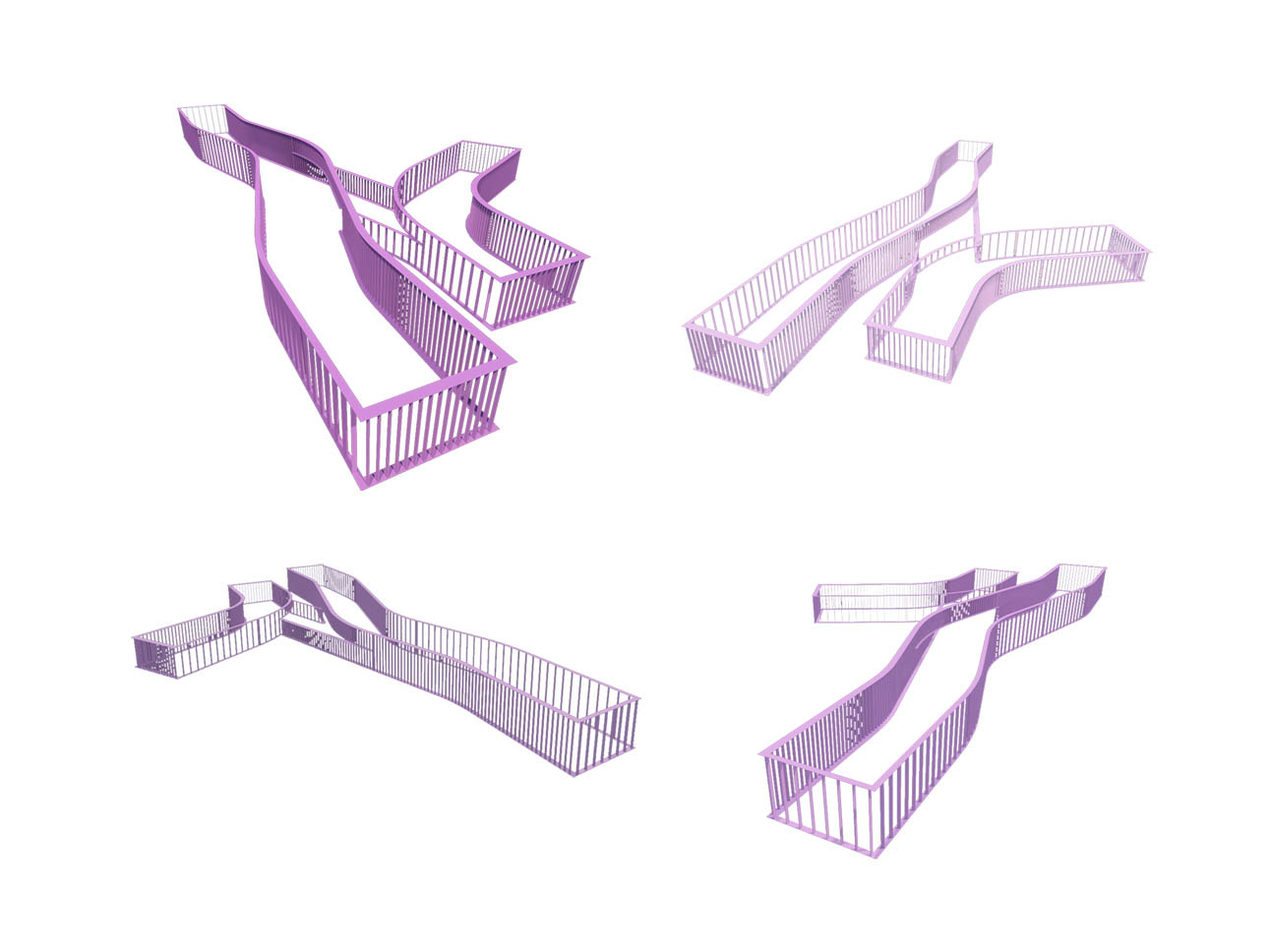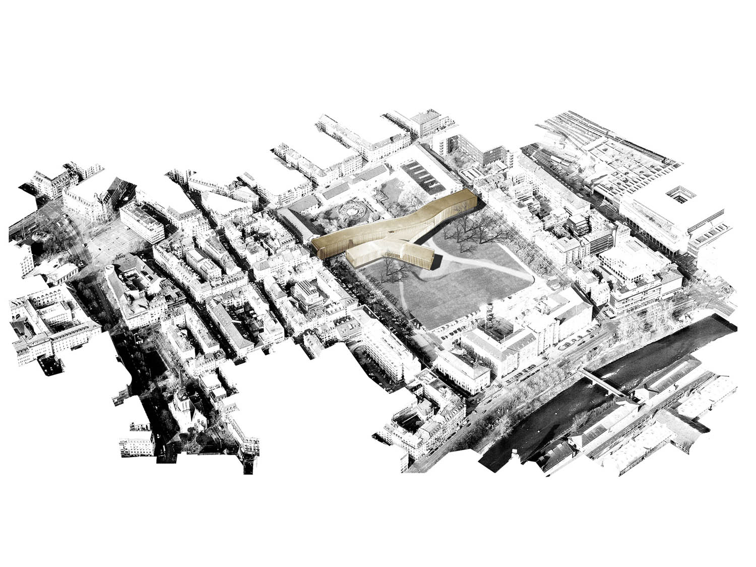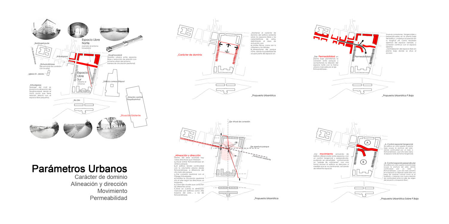 ”Matener el carácter de dominio sobre el espacio Libre”, completando la anchura total del solar, y respetando la doble linea de árboles existentes; ”Nueva alineación y dirección de la propuesta” mediante un eje director de proyecto perpendicular al existente entre antiguas edificaciones del solar provocando una nueva conexión entre espacios libres y Rotwandstrasse, que aumenta la profundidad de relación entre entorno y espacio libre Norte, y crea un punto de referencia visual en la calle; Crear “permeabilidad en planta baja” entre el espacio norte, sur y entorno, focalizando el espacio en función de el uso peatonal; Dar “movimiento al edificio”, produciendo el volumen en función del espacio libre analizado y la trama urbana del eje Rotwandstrasse en sus diferentes niveles, conformando un paisaje de volúmenes para tener referencia del edifico dentro del solar. En base a la propuesta urbanística y el programa del edificio, se propone un edificio formado por tres volúmenes lineales curvilíneos, partiendo de la nueva alineación y conformandose dos de los volumenes en función de la trama urbana del eje de Rotwandstrasse, dejando el tercero como elemento de conexión.