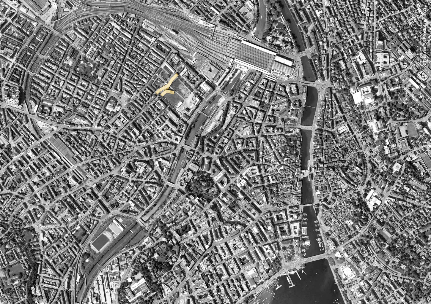 Se sitúa en el distrito de Langstrasse en un solar de gran superficie, donde destaca la presencia del edificio Zeughausareal, como una pieza alargada controlando y dividiendo en dos el espacio libre en toda su anchura (185m). El edificio supone una barrera urbana visible unicamente desde el solar, que reduce de relación entre tramas y espacios del entorno, y espacios libres del solar (Norte y Sur, de diferente carácter). El espacio libre Sur (parque abierto) permite la relación entre el mismo entorno, las fachadas de los edificios son visibles en todo momento y las calles que conectan se empapan de este gran espacio. El espacio libre Norte (parque limitado) se cierra en si mismo, porque los accesos a este parque no conectan directamente con las calles del entorno limitando la conexión entre trama urbana-espacio libre, creando una relación cerrada entre los edificio, que unicamente se abre en el pasage Kräuelgasse, donde su profundidad de conexión es de una isla de la trama. Rotwandstrasse, es la calle más importante que interactua en el solar, funciona como eje de conexión entre diferentes puntos urbano: el parque sur del solar, Zeughausareal cuya alineación se debe a este eje, el parque dela Iglesiade St. Jakobs, el antiguo edificio Bezirksgebäude, y la importante via Badenerstrasse. Esta calle se conecta con el espacio libre Sur continuando su visual hacia las fachadas de las edificaciones del parque, teniendo relación tangencial con Zeughausareal, y reforzando la barrera urbana.