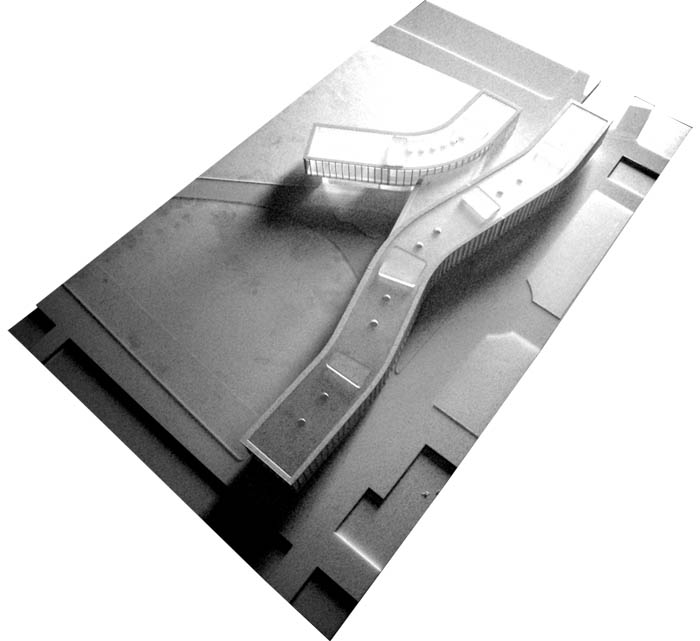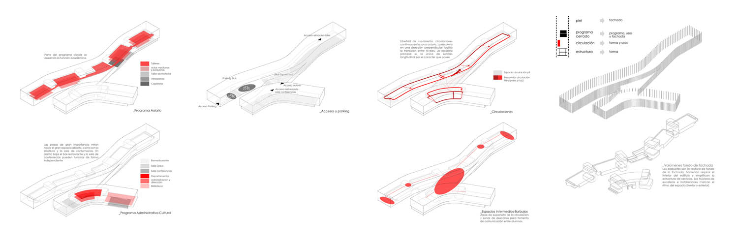 El edificio se desarrolla bajo una fachada de sentido vertical, (que marca el ritmo y la continuidad sinuosa de la forma, convirtiéndose en elemento regulador en las diferentes partes del proyecto), y apoyandose en las diferentes plantas. Por cualquier lado que se mire, el edificio siempre ofrece aspectos diferentes, y sin embargo es una forma continua de fachada, una totalidad fluida. La idea de uso de la escuela es fomentar el diálogo entre alumnos, y es por ello que el espacio de circulación adquiere una gran importancia con un gran espacio corazón del proyecto (exposiciones-hall), al que le salen arterias de circulación, hasta llegar a espacios de respiración. En el aulario la circulación se produce de forma continua conectando los pasillos de circulación de los dos niveles con escaleras (abiertas y cerradas) de una sola dirección, produciéndose circulaciones en forma de ocho inclinados. Las escaleras son elementos transportadores, sales de la planta hacia la escalera, entrando en una atmósfera cerrada horizontalmente (escalera cerrada) y abierta cenitalmente (escalera abierta) para salir de ella y aparecer en otro espacio, otro nivel, reforzando la idea de niveles. Los diferentes partes del programa se agrupan en paquetes para crear espacios burbuja o de respiración debido a la gran longitud del edificio dando profundidad a la composición de fachada. Esta fachada interior es de listones de madera con tonalidades de color diferentes en cada paquete para crear referencia espacial dentro del edificio. Esta agrupación en paquetes permite simplificar la organización de las instalaciones del edifico, existiendo en cada paquete un núcleo de instalaciones vertical junto a una escalera de incendios que sirve también como referencia espacial y distribuyen las instalaciones del edificio por falsos techos y suelos técnicos. Los paquetes están formados por un sistema de piezas que se repiten y combinan en función de la necesidad del paquete. Las esquinas del edificio estan achafalanadas con diferentes radios de giro para dar fluidez a la circulación y para difuminar las esquinas en composición de telón de fondo de la fachada.