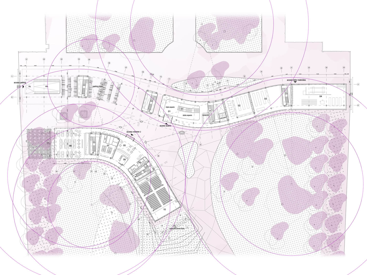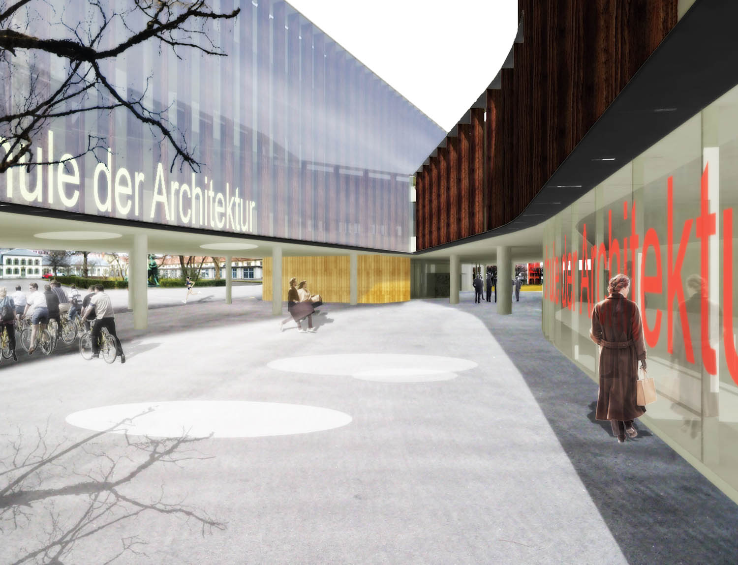 En base a la propuesta urbanística y el programa del edificio, parte de la necesidad de crear relaciones diferentes en varios niveles con el entorno. “La idea es crear una envolvente mediante una trazada continua o Cinta, como elemento de orden entre el volumen del edificio y las diferentes necesidades urbanísticas con el entorno”. Se desarrolla tres niveles sobre rasante: planta baja (zocalo), planta 1 y planta 2 (ritmo), que respetan la altura de los edificios del espacio norte. La planta baja busca la permeabilidad entre espacios con un paso importante que ocupa la planta baja de dos volumenes desde Rotwandstrasse, (se obtiene un punto de chaflan que crea una relación tangencial con el espacio libre sur bajo el acceso y una relación perpendicular con el espacio libre norte bajo el aulario). Permite crear profundidad de campo entre pilares y árboles. El programa de la escuela se propone en dos volúmenes (aulario, y área administrativa-cultural), conformando el edificio a nivel formal en dos geometrias conectadas por un tercer volumen, adquieriendo un carácter curvilíneo, consiguiendo movimiento del edificio sobre sí mismo. Bajo el elemento puente se producen los dos accesos al edifico, (aulario, y auditorio y bar-restaurante, pudiendo funcionar este paquete de programa de forma independiente).