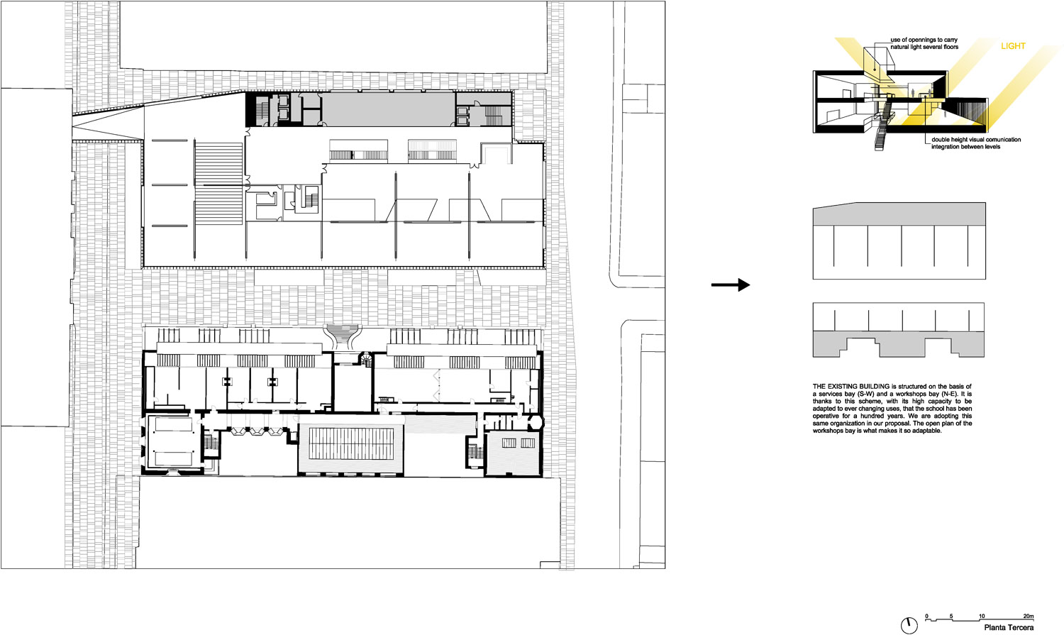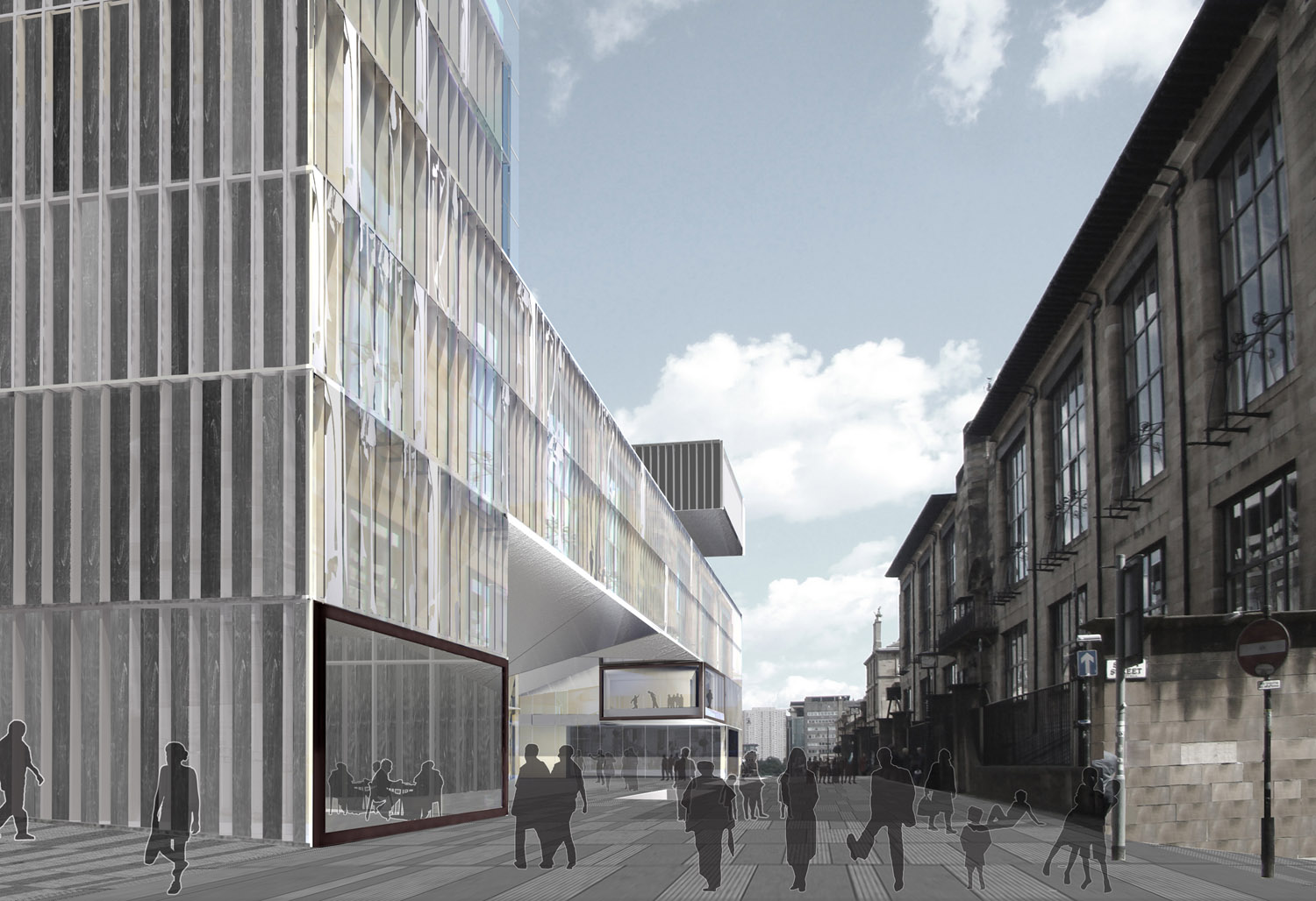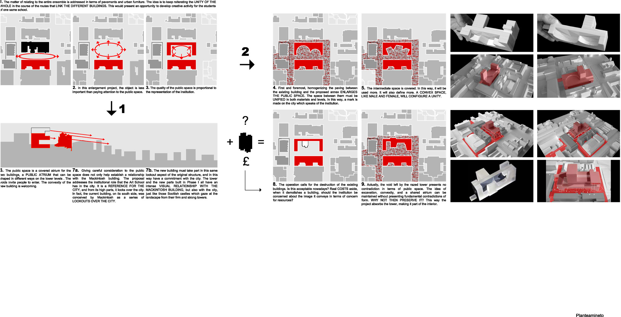 El proceso de proyecto se puede estructurar en tres grandes decisiones que, naturalmente, han de resultar coherentes entre sí dotando a la propuesta de la unidad necesaria. El espacio público como mecanismo estructurante y organizador de la arquitectura misma que dota al conjunto de una dimensión y una significación acorde con la importancia de la institución que es la Escuela de Arte de Glasgow. La organización de los talleres y en general del programa sigue unos criterios organizativos similares a los existentes en el actual edificio de Mackintosh que se ha demostrado eficaz para la adaptación en el tiempo.