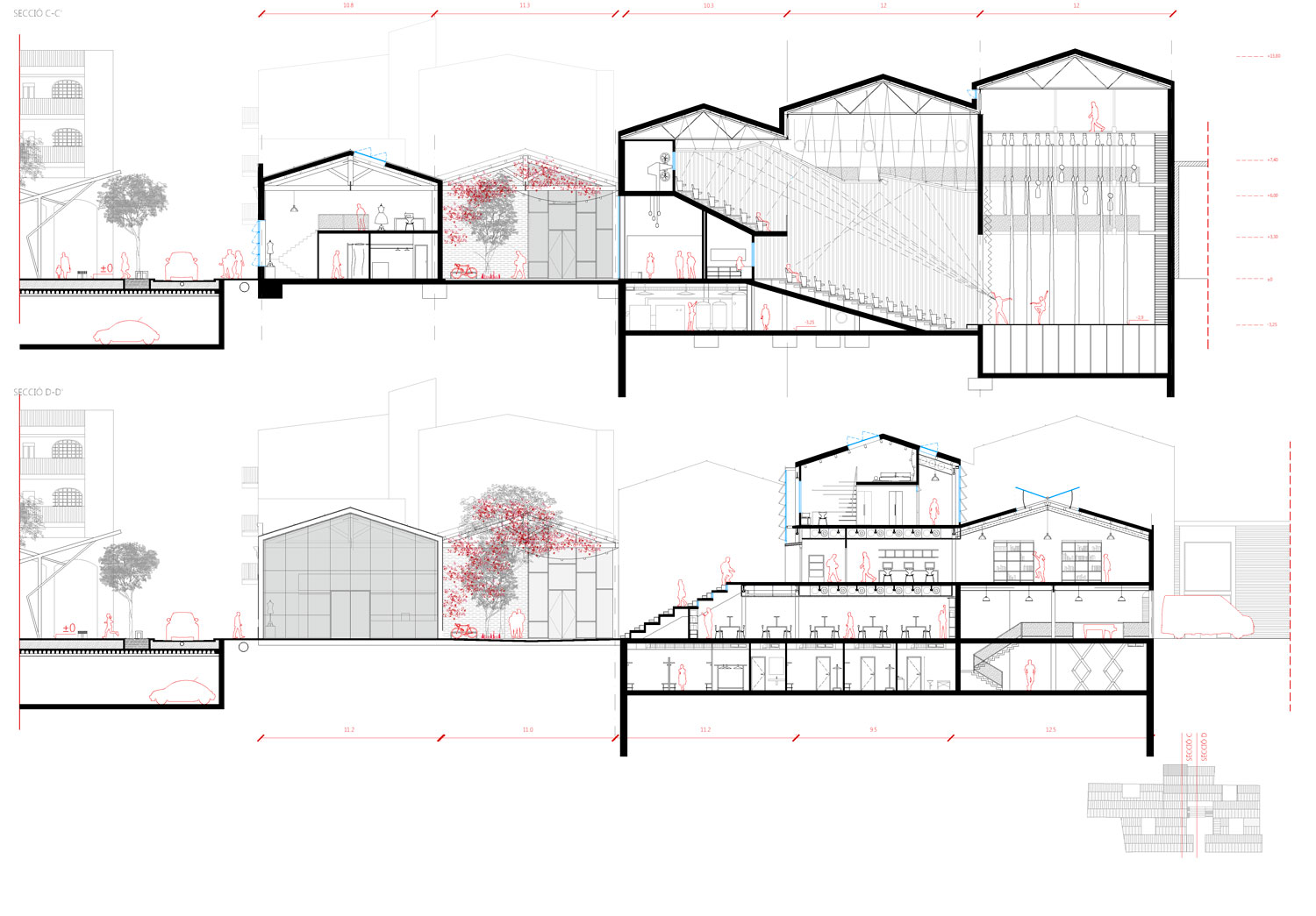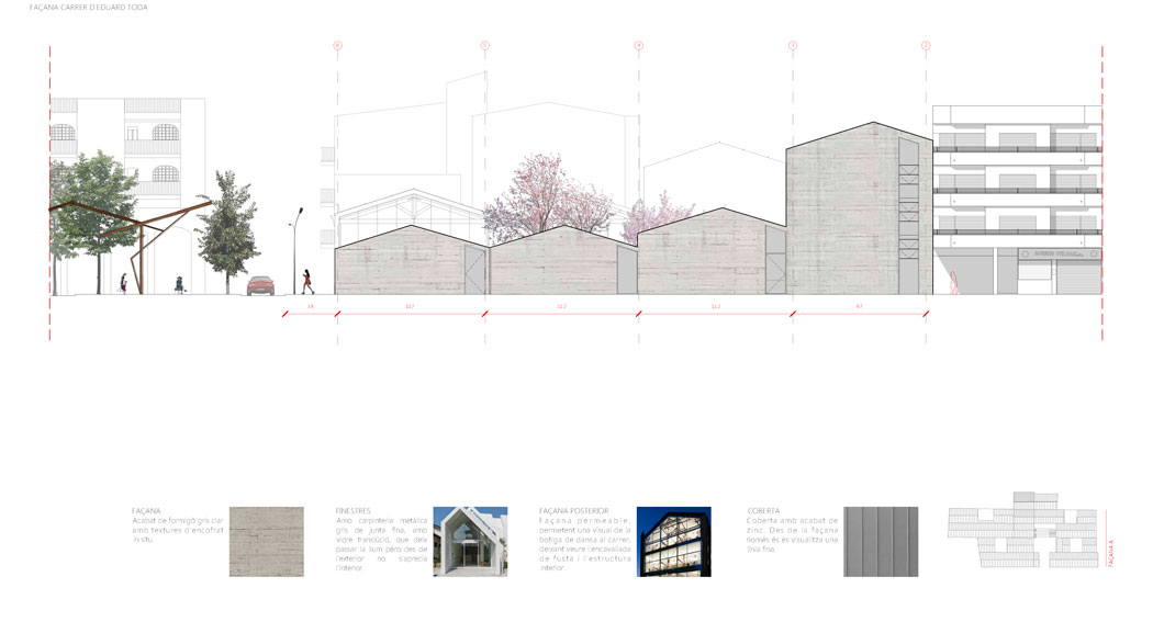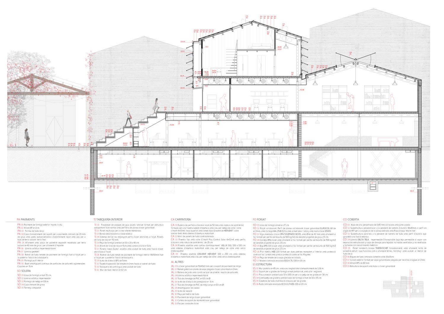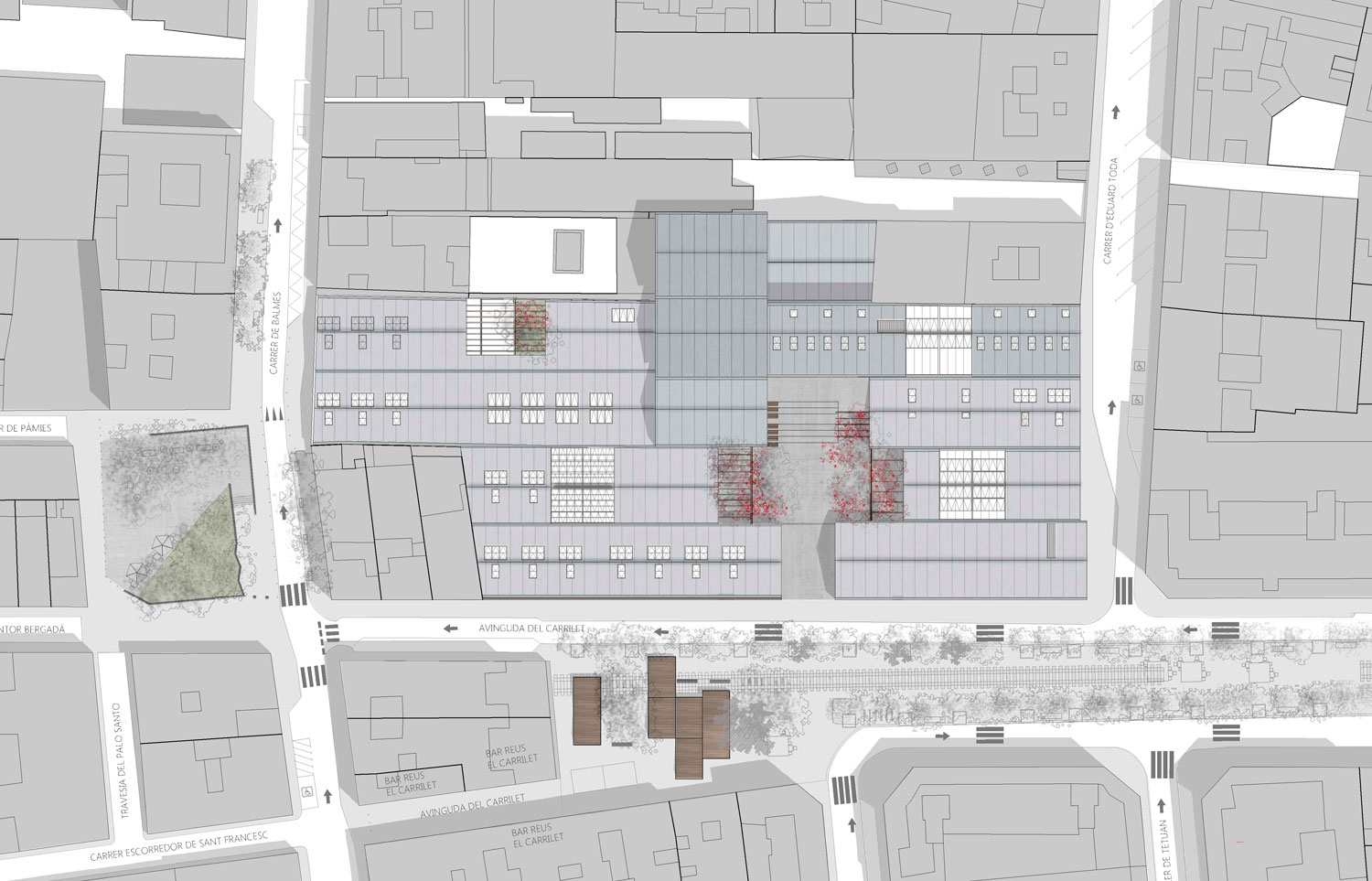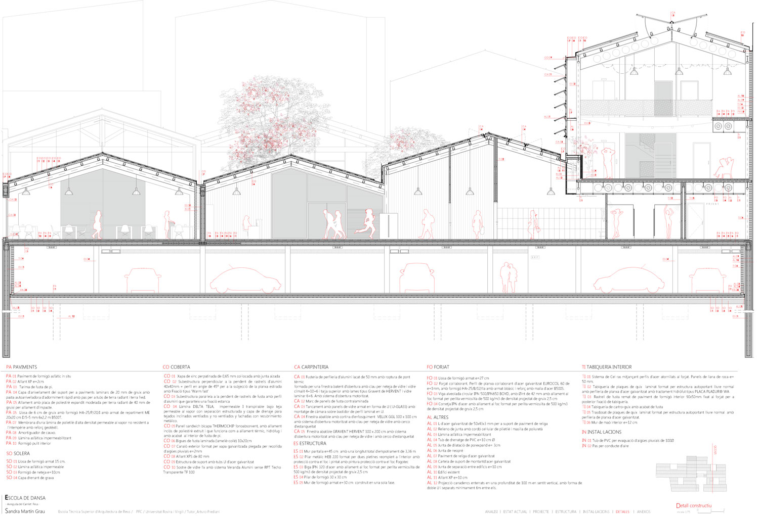 ☉ Escuela de Danza El Carrilet is an academic project by Sandra Martín for ETSA Reus designed in 2016. It is located in Reus Spain in an urban setting. Its scale is medium. Key materials are concrete metal and polycarbonate. Concepts such as adaptable reuse climate adaptation courtyard stripe and sloped roof are explored.