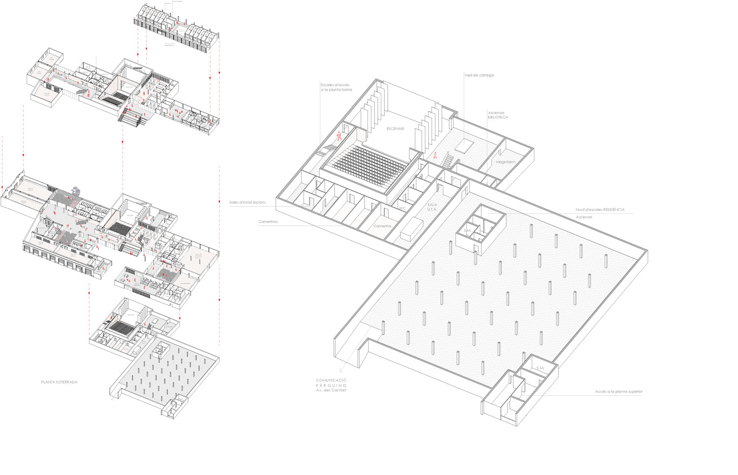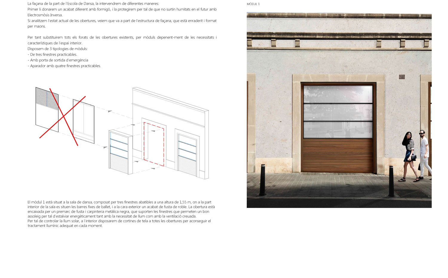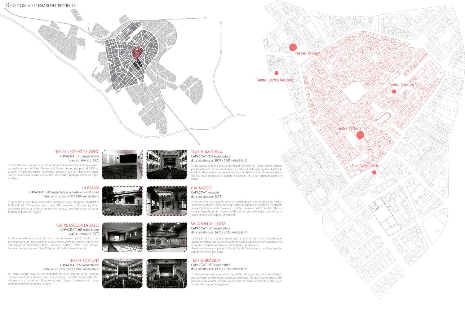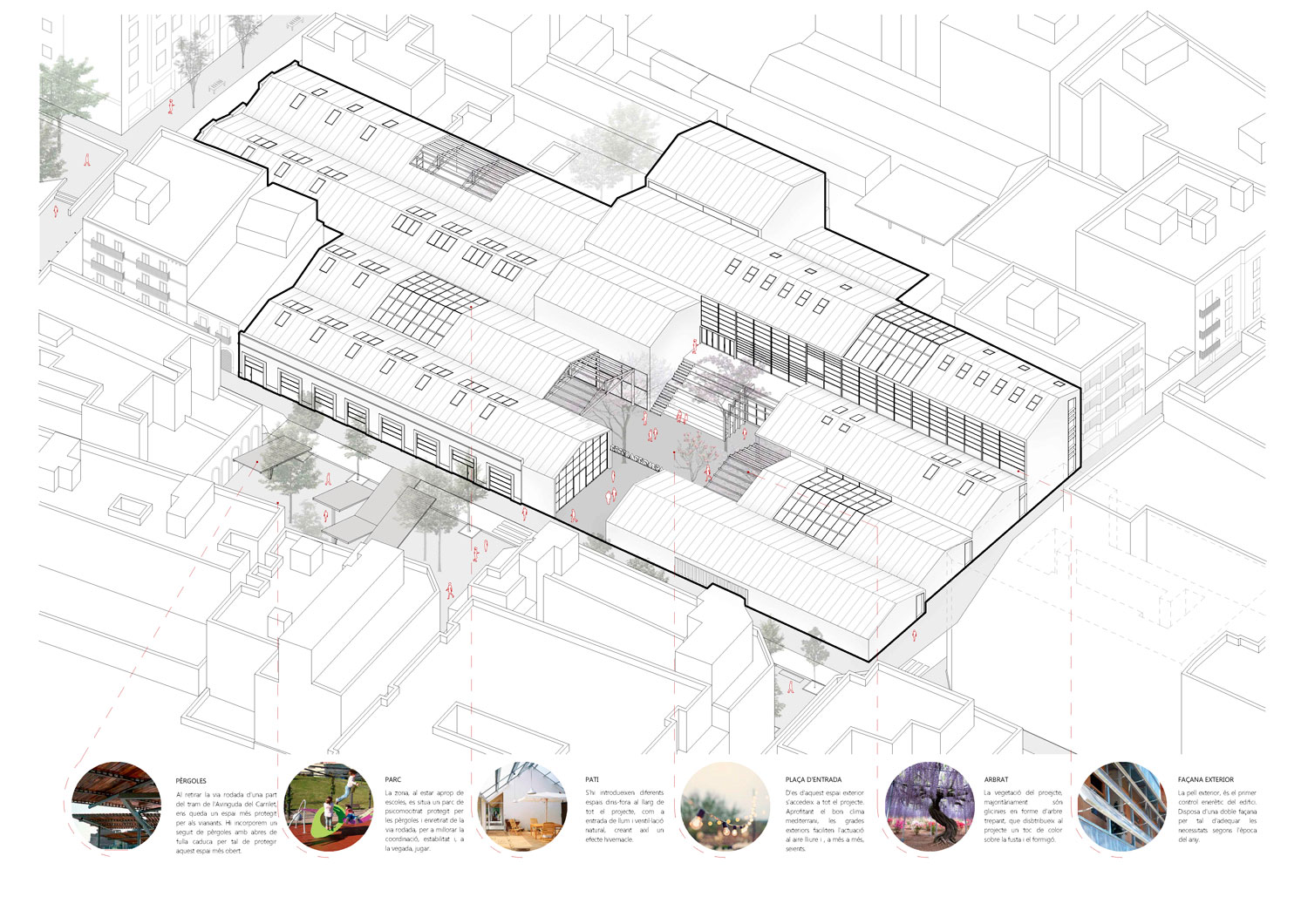 Además, Reus acoge una red de artes muy potente. Este proyecto, intenta convertir el espacio en desuso en un nuevo evento cultural y urbano a través de la rehabilitación y ampliación de las instalaciones existentes, y la redefinición de su relación de la avenida del ferrocarril con la plaza. Mi propuesta es la creación de una escuela de Danza con un plan de estudios superiores, que dará el refuerzo que la ciudad de Reus necesita. La enseñanza que se imparte en la escuela de Danza dura 4 años, y ofrece la formación especializada tanto a bailarines como coreógrafos y pedagogos. Por otra parte, el equipamiento se puede dividir en tres partes,