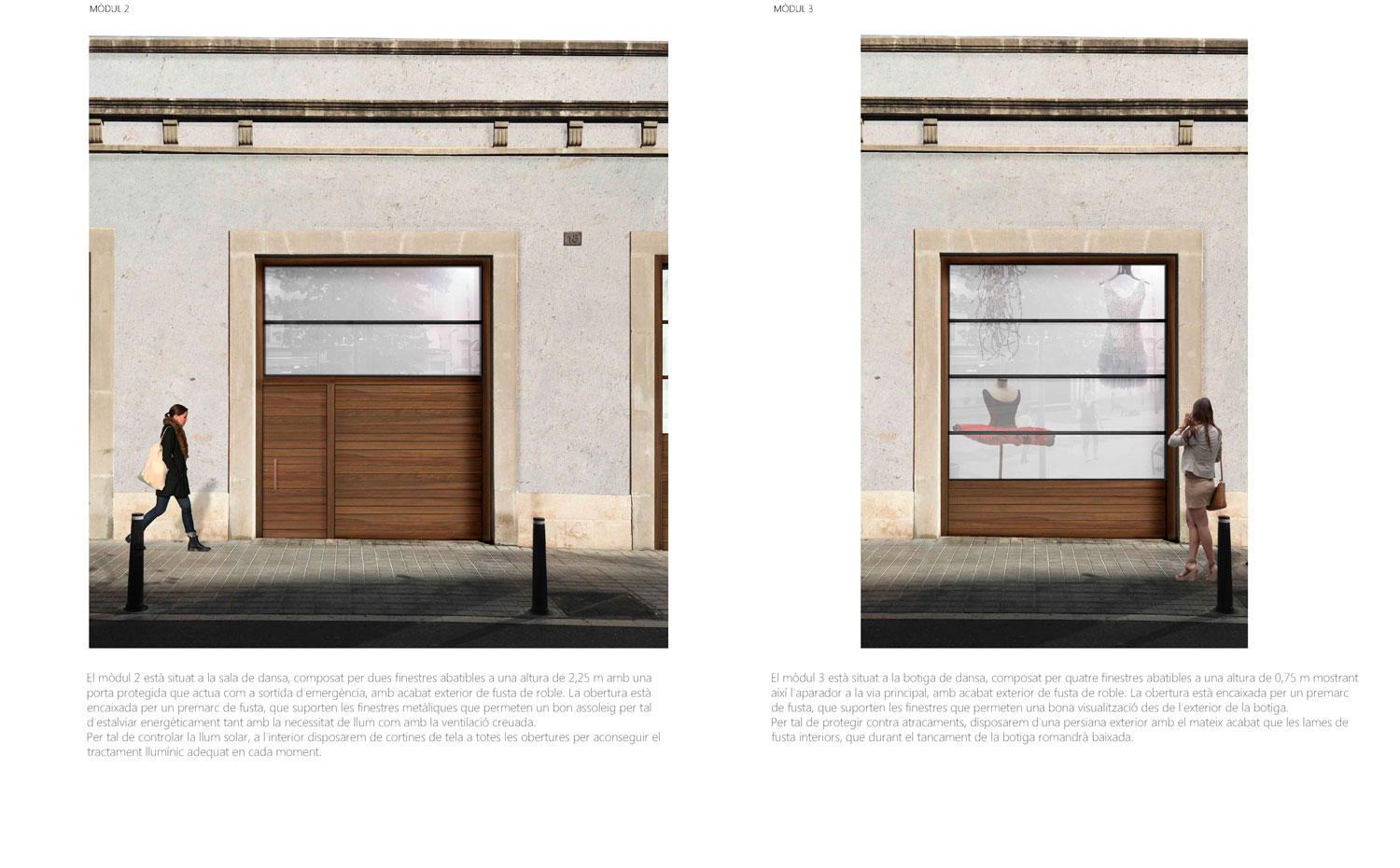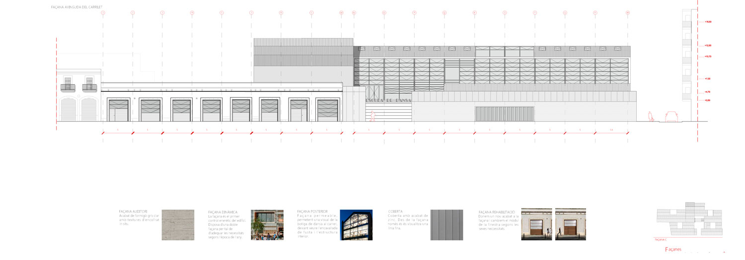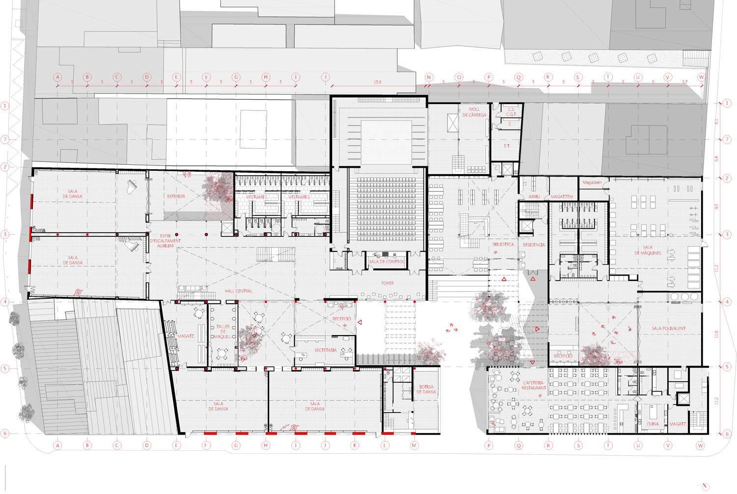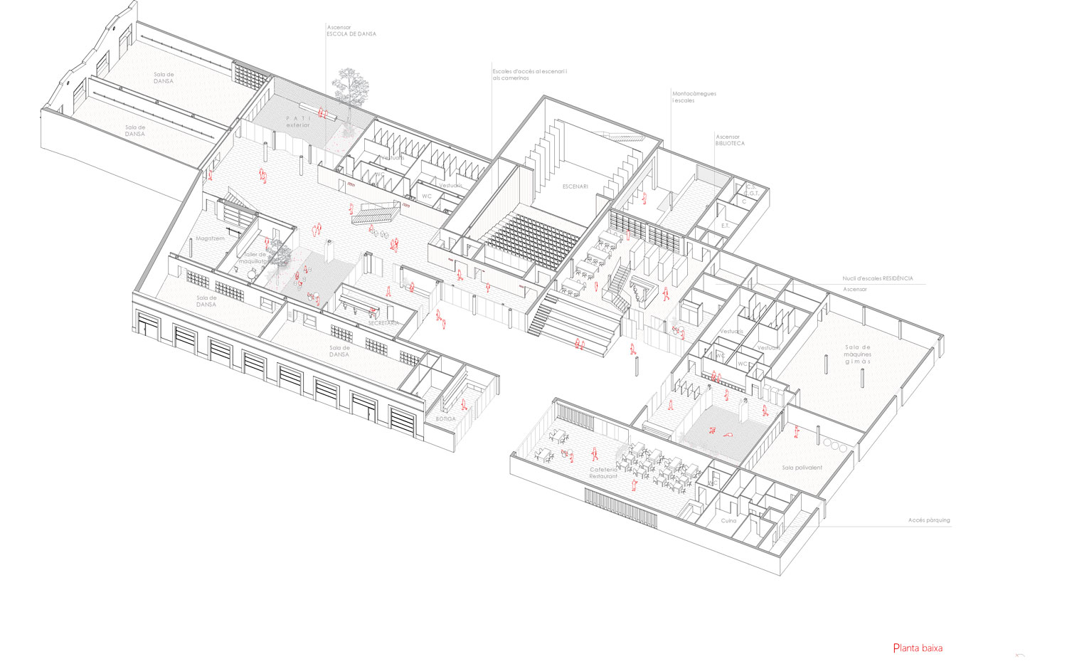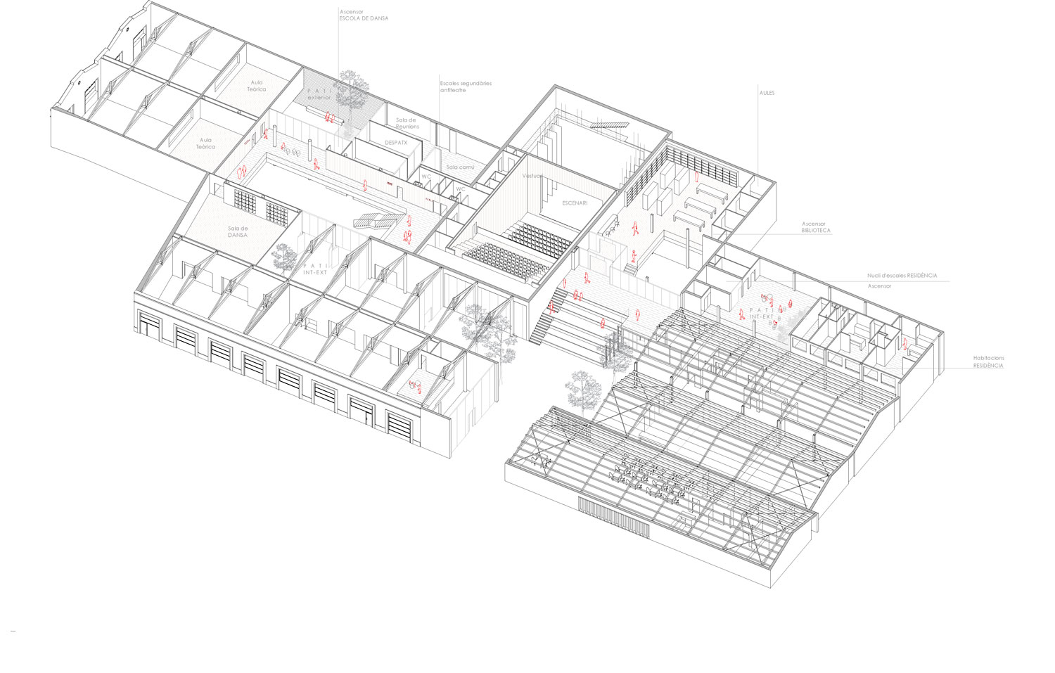 El programa contará con una Cafetería-Restaurante, un gimnasio para que los bailarines puedan mantenerse en forma, un pequeña Residencia de estudiantes con habitaciones de corta o larga duración, una Biblioteca-fonoteca especializada con la materia, la escuela de danza y un teatro de capacidad de 312 personas que cubra las necesidades que necesita Reus como ciudad que acoge diferentes festivales a nivel internacional, como el Cos (festival de movimiento y teatro Gestual), el Trapezzi, la semana internacional de la Danza, Festival de Blues, Jazz, etc. Hablando de estrategias climáticas, se propone un giro del ciclo energético que reduce la demanda y el consumo, y así contribuye a reducir las emisiones de CO2 a la atmósfera y aumente el confort de los usuarios con los recursos del entorno. El edificio se divide en 3 tipos de climas asociados a diferentes intensidades de uso: