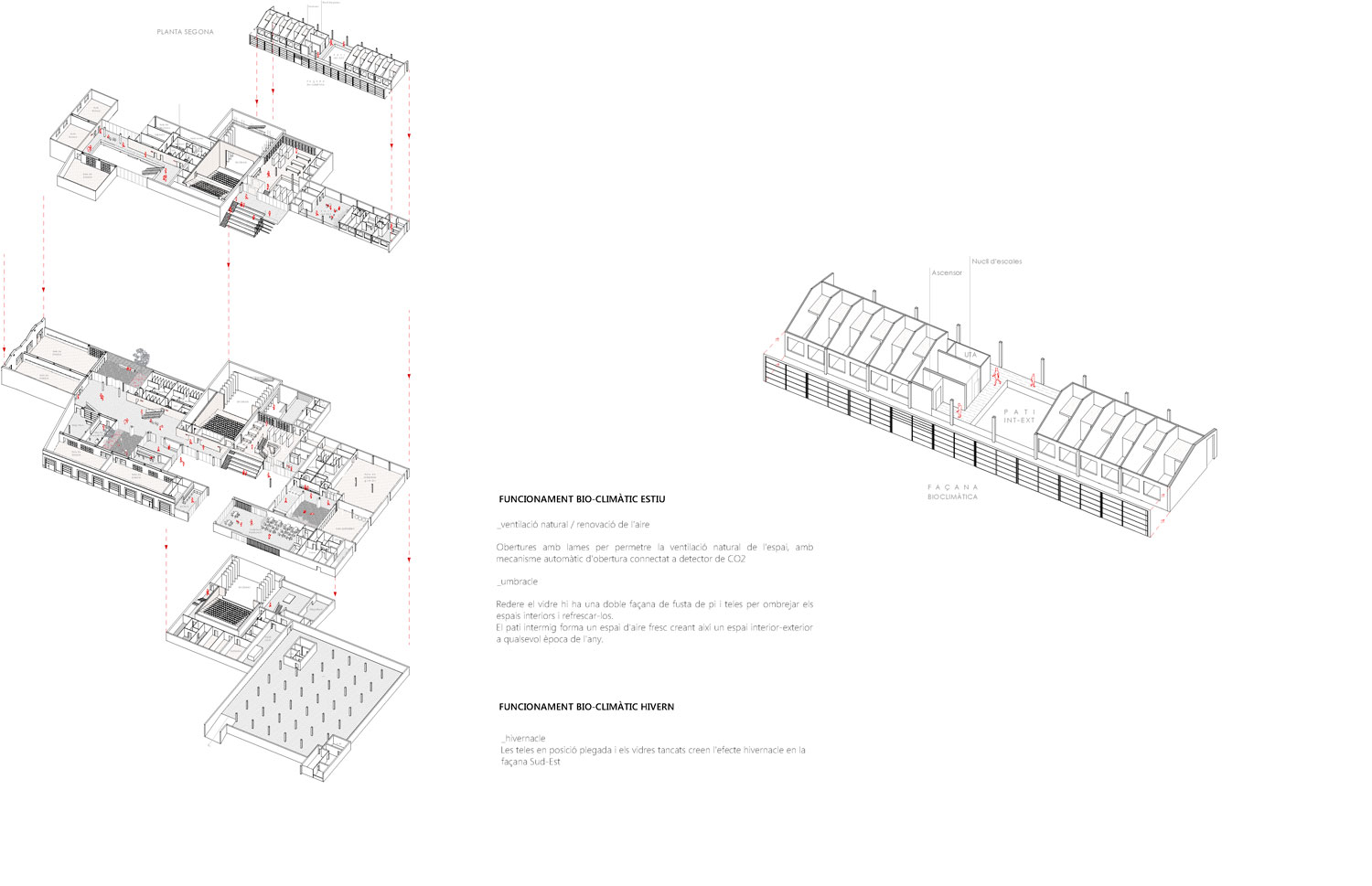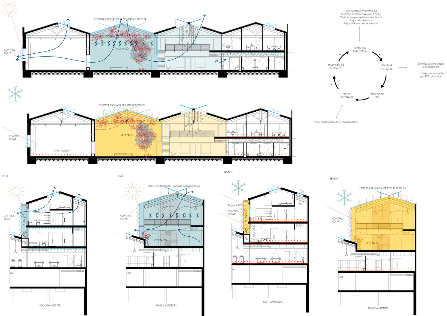 El comportamiento del edificio se motoriza mediante un sistema de control automático y se programa para favorecer al máximo el comportamiento pasivo y minimizar el uso de energías no renovables. Entre la zona climatizada y exterior, se genera un espacio intermedio llamado «microclima», que hace que se genere una reducción de la demanda energética del edificio. En invierno aprovechamos la máxima radiación solar que obtendríamos a través de la fachada SURESTE y de la cubierta a través de la incorporación de lucernarios y patios. En verano regularemos la entrada de luz con cortinas para evitar que entre la luz del sol directamente al edificio, y crearemos ventilación cruzada para que haya corrientes de aire para refrescar más rápidamente. En los casos que nose pueda garantizar la ventilación cruzada, colocaremos ventiladores para garantizar el movimiento del aire. De otro lado, la estructura del proyecto se puede dividir en tres partes: