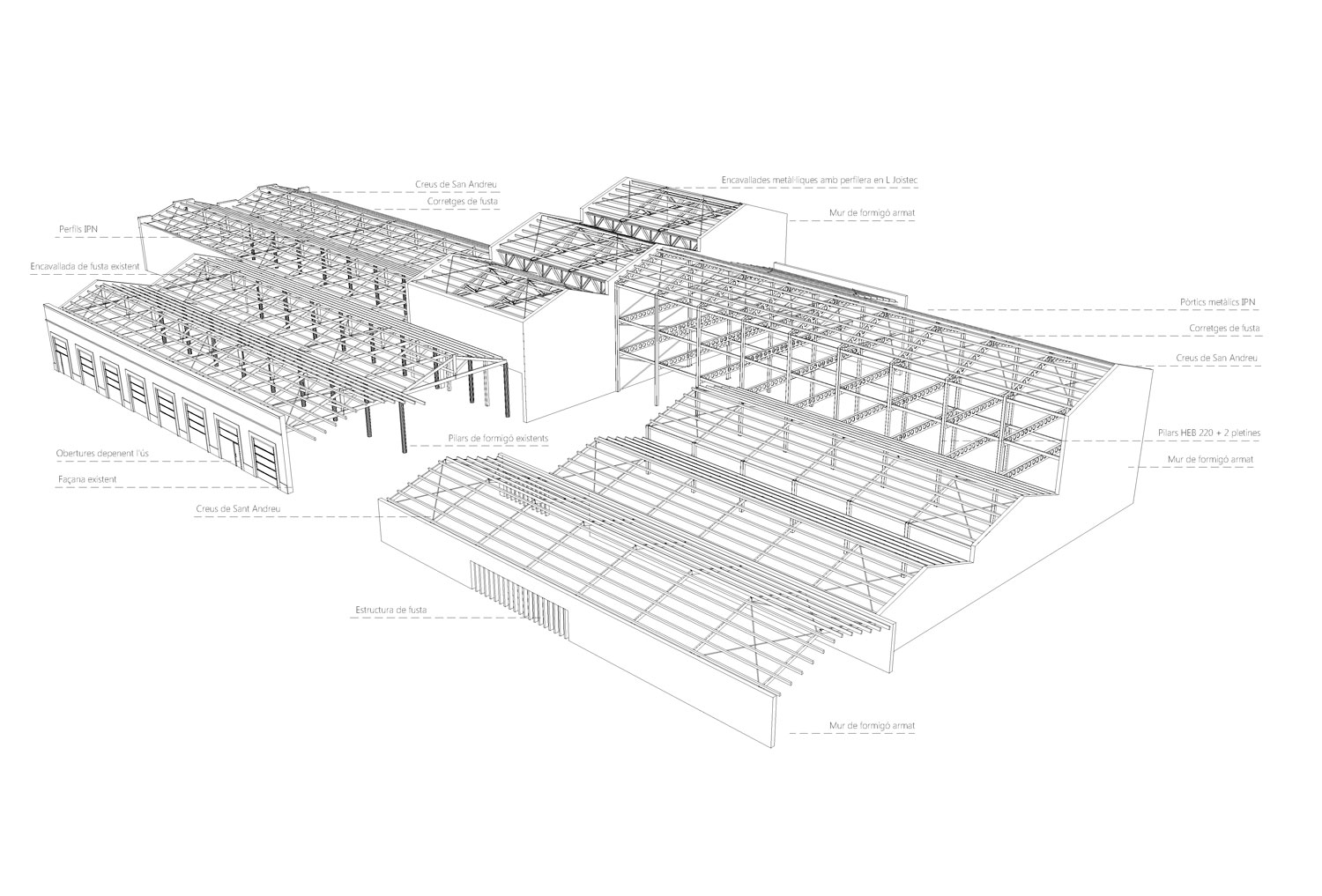 – Toda la obra nueva, que consta de pórticos separados 5 m entre ellos soportados por pilares metálicos compuestos por HEB 220 unido con dos pletinas metálicas, y vigas alveolares circulares IPN 450 o BOYD 650. Por otra parte, colocan cruces de san andreu para rigidizar toda la estructura.