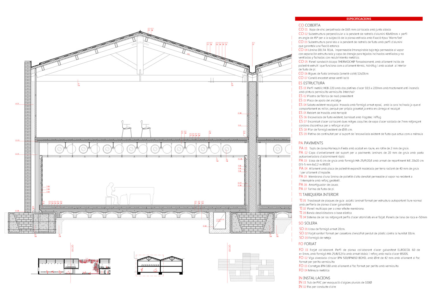 – La rehabilitación, que consta de pilares de 35 m de Ø, donde algunos son empresillaados con pletinas de acero, que soportan una cercha de madera y correas de madera.