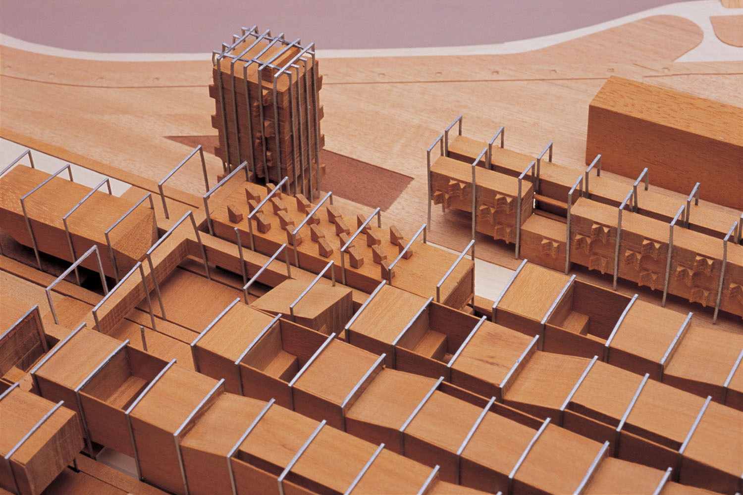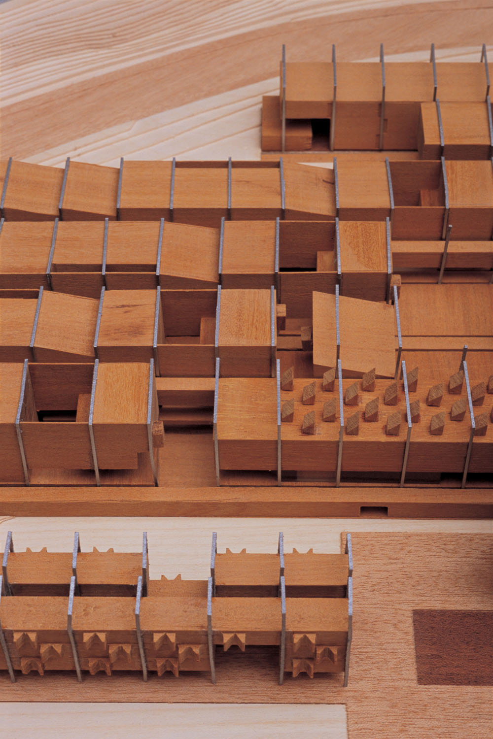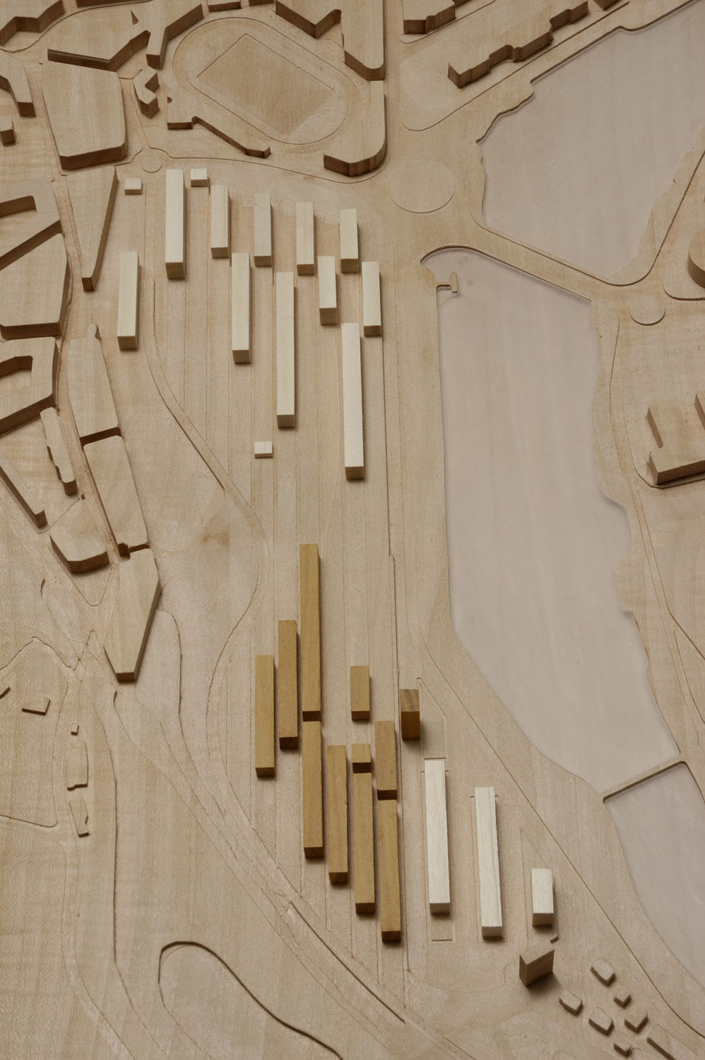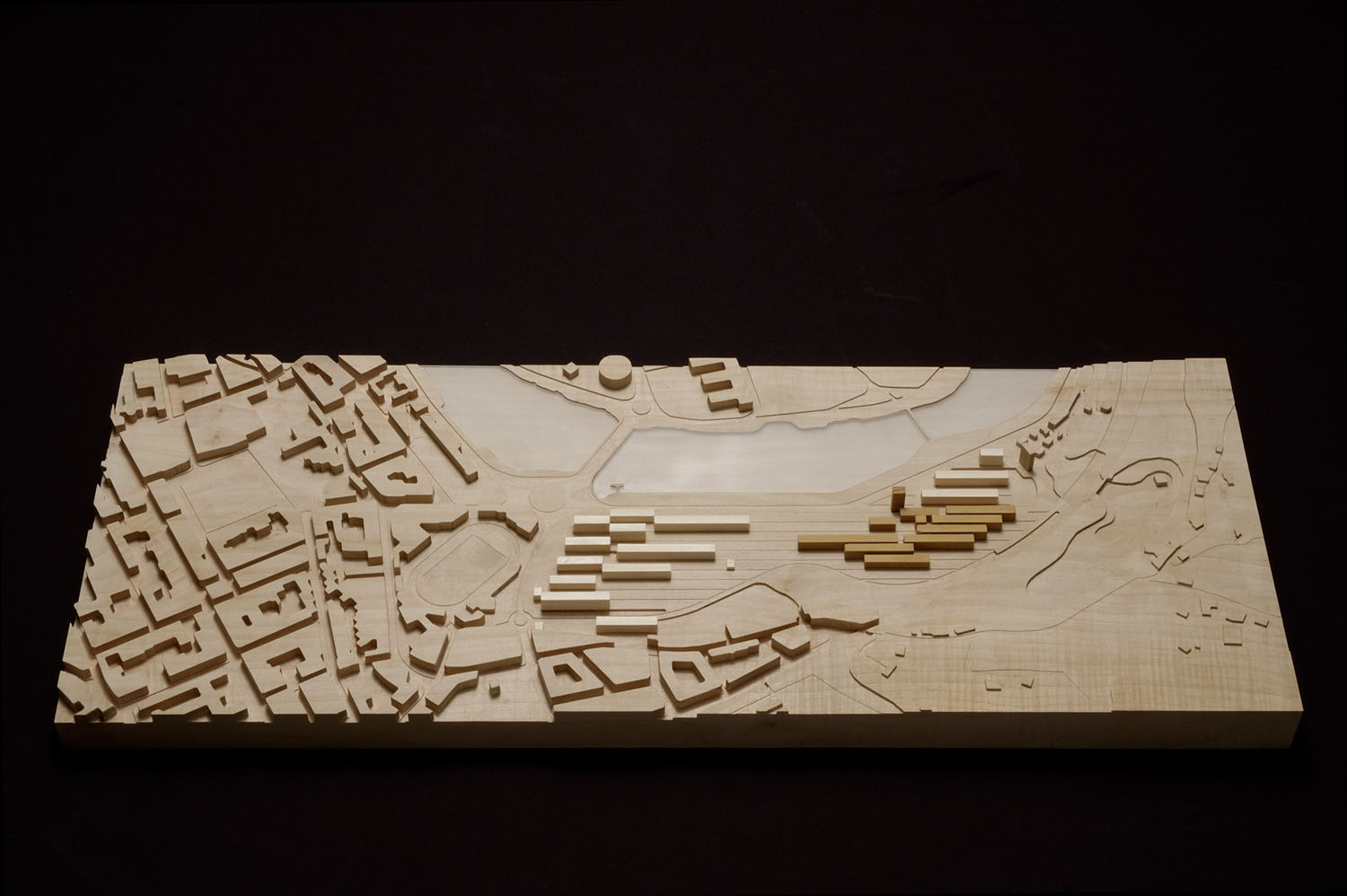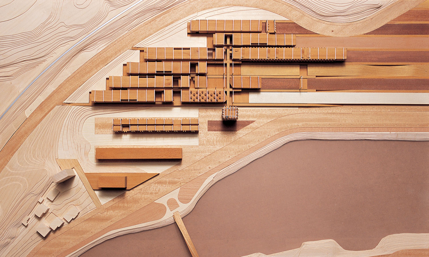 El podio/parque se configura a partir del moldeado del terreno y de la geometría de los recorridos que se establecen desde la ciudad: más próximo de esta, y como modo de complementar el área del campo de juegos existente, se localiza un conjunto de edificios preferentemente destinados a vivienda; en el lado opuesto, queda implantado el Edificio de las Artes, exactamente en el lugar donde existe un meandro más del río y donde la topografía comienza a tornar difícil la construcción; por el medio, se disponen algunos pequeños edificios de equipamiento que, al establecer una puntuación, definen un ritmo, casi una respiración, que mide la escala del conjunto. Se exploran perspectivas, alineamientos, encuadramientos, distorsiones, compresiones y distensiones espaciales, movimientos y pausas – todo en un encadenamiento en el que, como en la ciudad, lo que cuenta es el espacio disponible entre las cosas y no propiamente las cosas en sí mismas.