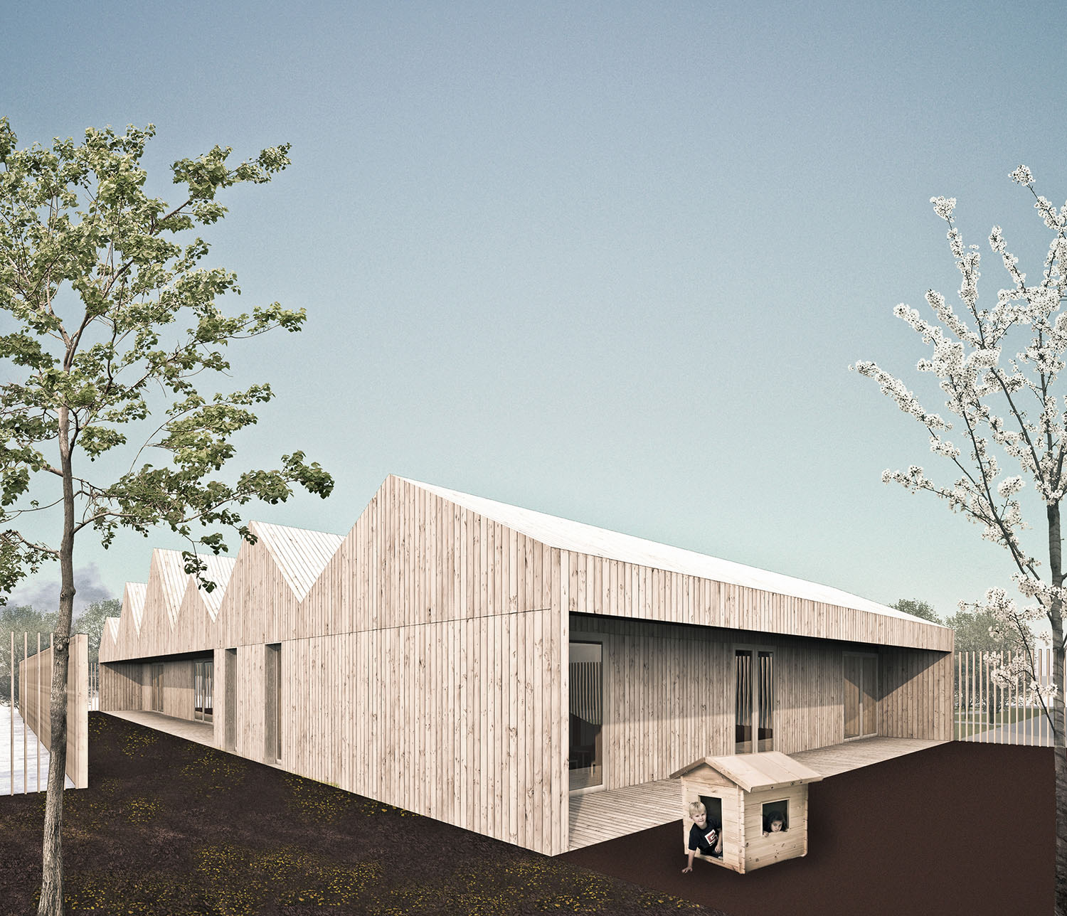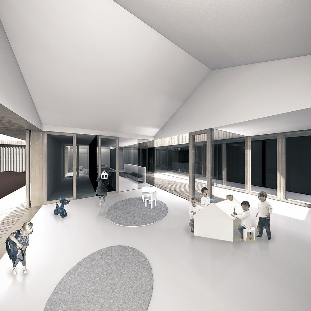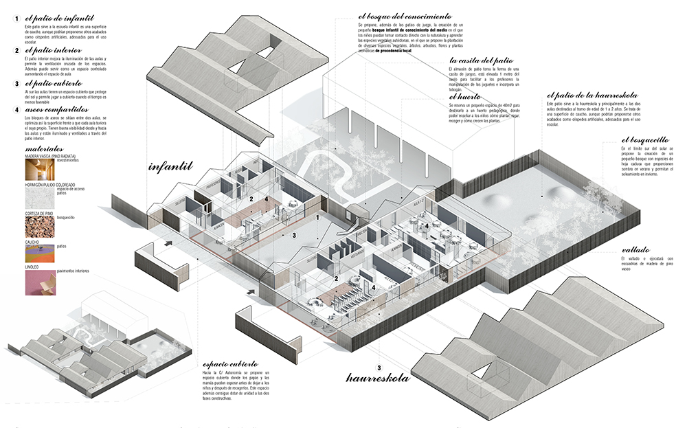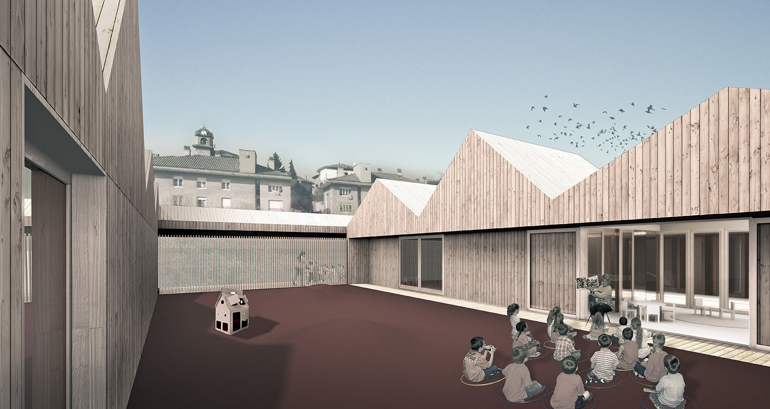 Los primeros años de nuestras vidas son cruciales para el aprendizaje y desarrollo personal y el ambiente arquitectónico puede tener un papel decisivo: reproducir una forma consolidada de manera tan temprana en los niños, que su percepción identifica como el espacio básico, parece un modo adecuado de abordar el proyecto. Las dos piezas en las que debe resolverse se conciben a partir de la repetición de un elemento con referencias formales claras e inequívocas a los arquetipos asociados históricamente con la arquitectura y la casa, con el que los niños se sienten identificados. Este elemento arquetípico repetido puede además resolverse con técnicas constructivas próximas a la prefabricación, por tanto reduciendo costes y plazos de ejecución. El recurso a la madera como sistema estructural y de revestimiento, por otro lado, no sólo desarrolla esta idea infantil de refugio o cabaña en el bosque, sino que vincula el proyecto de manera decisiva al entorno próximo de los montes y bosques extensos de Zaldibar y hace que su construcción pueda plantearse desde presupuestos sostenibles y de producción integrada y local.
