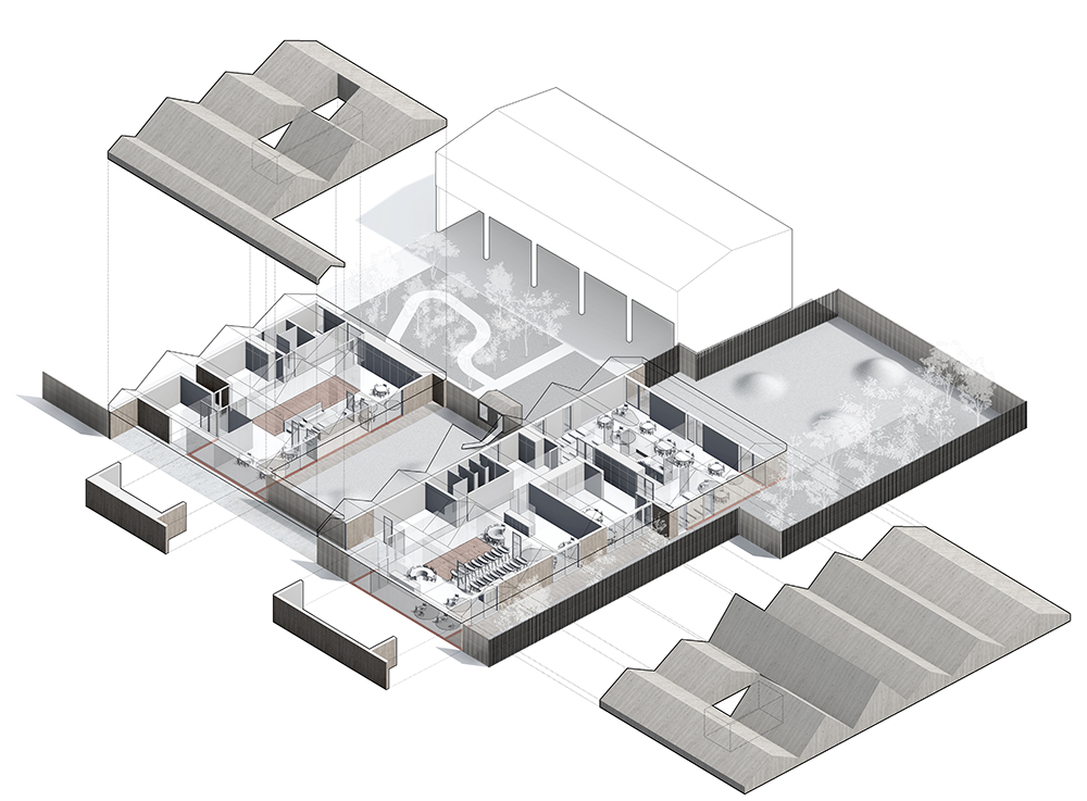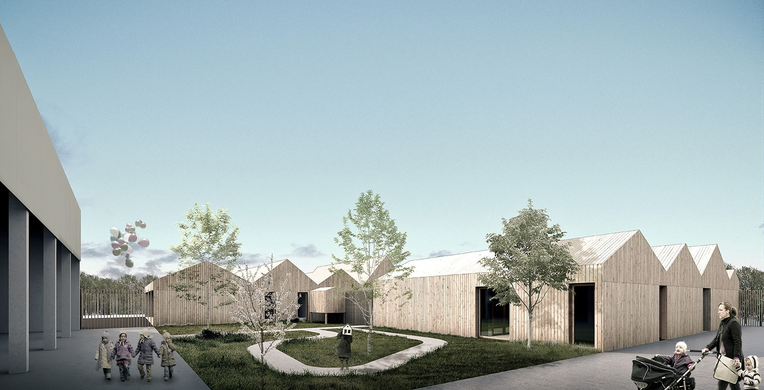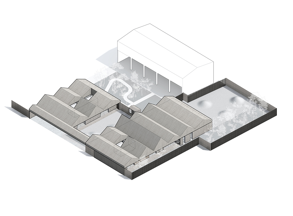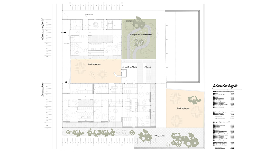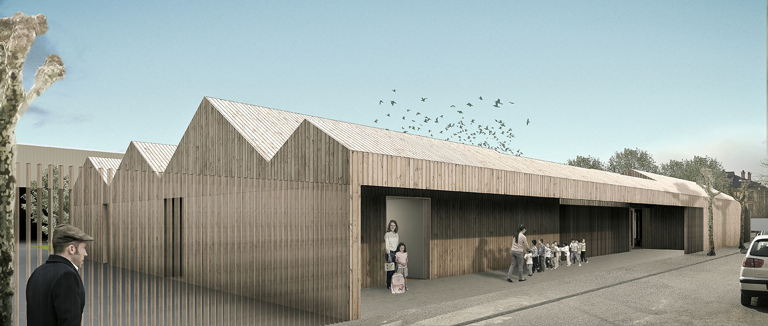 Los primeros años de nuestras vidas son cruciales para el aprendizaje y desarrollo personal y el ambiente arquitectónico puede tener un papel decisivo: reproducir una forma consolidada de manera tan temprana en los niños, que su percepción identifica como el espacio básico, parece un modo adecuado de abordar el proyecto. Las dos piezas en las que debe resolverse se conciben a partir de la repetición de un elemento con referencias formales claras e inequívocas a los arquetipos asociados históricamente con la arquitectura y la casa, con el que los niños se sienten identificados. Este elemento arquetípico repetido puede además resolverse con técnicas constructivas próximas a la prefabricación, por tanto reduciendo costes y plazos de ejecución. El recurso a la madera como sistema estructural y de revestimiento, por otro lado, no sólo desarrolla esta idea infantil de refugio o cabaña en el bosque, sino que vincula el proyecto de manera decisiva al entorno próximo de los montes y bosques extensos de Zaldibar y hace que su construcción pueda plantearse desde presupuestos sostenibles y de producción integrada y local.