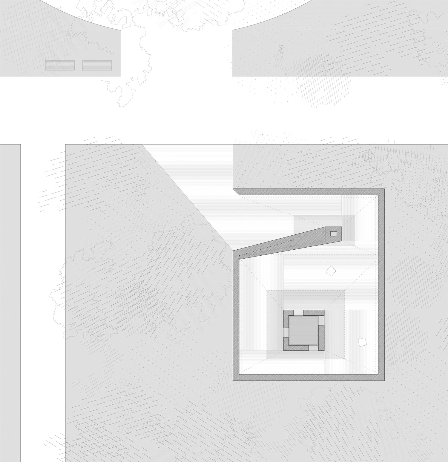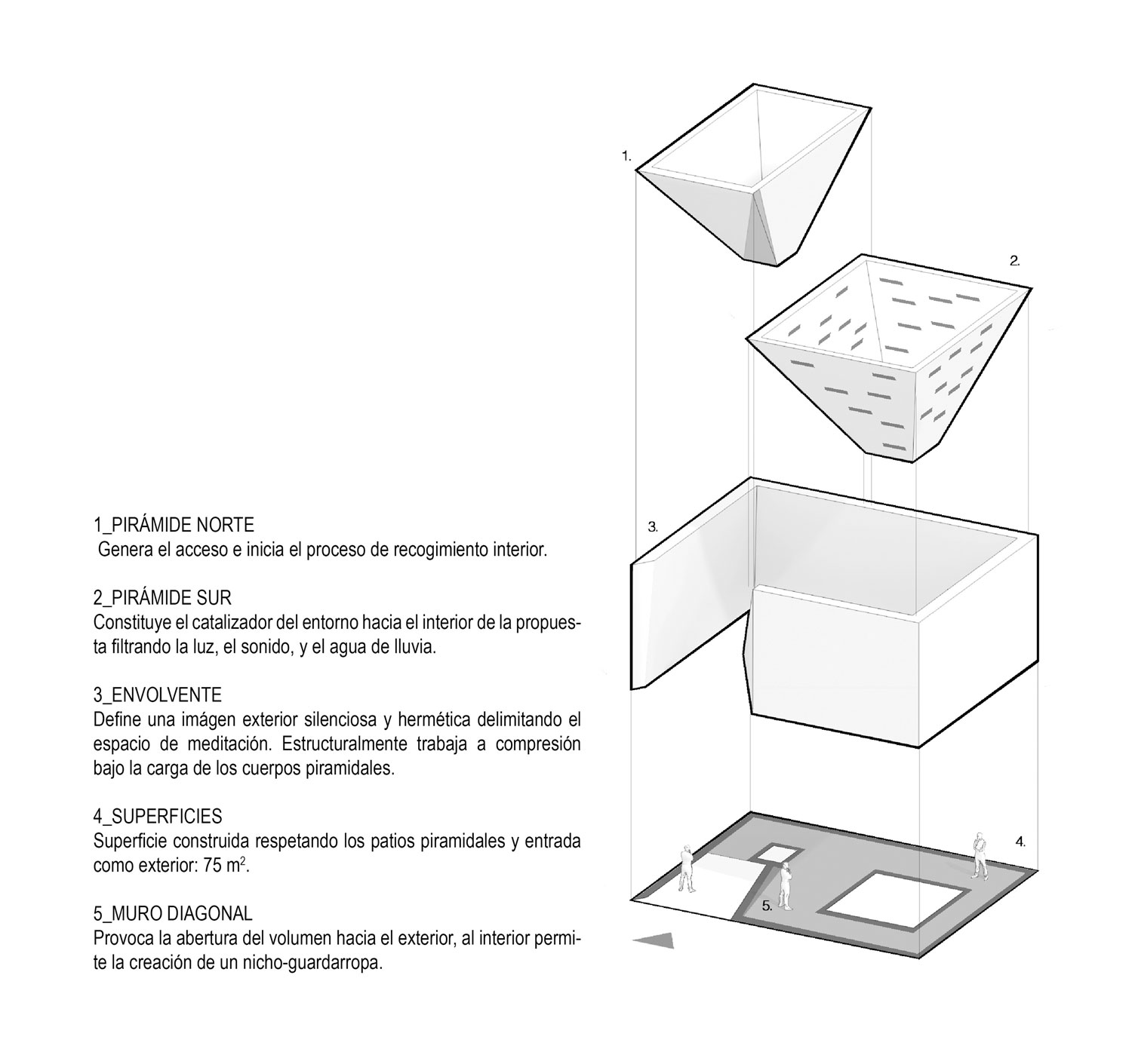 Comprendiendo el cementerio de Malmö como una intervención en la que los diferentes edificios se han ido construyendo de manera progresiva en el tiempo y manteniendo todos ellos su condición de piezas aisladas con identidad propia, la propuesta busca ser un elemento más en dicha intervención. Se manifiesta como un volumen silencioso y puro únicamente alterado en su cara oeste, donde se localiza la entrada. Dos pirámides invertidas serán las encargadas de generar el espacio interior, la primera crea el acceso y la segunda introduce la luz. La formalización espacial responde a la técnica constructiva del material empleado: una pieza cerámica maciza.