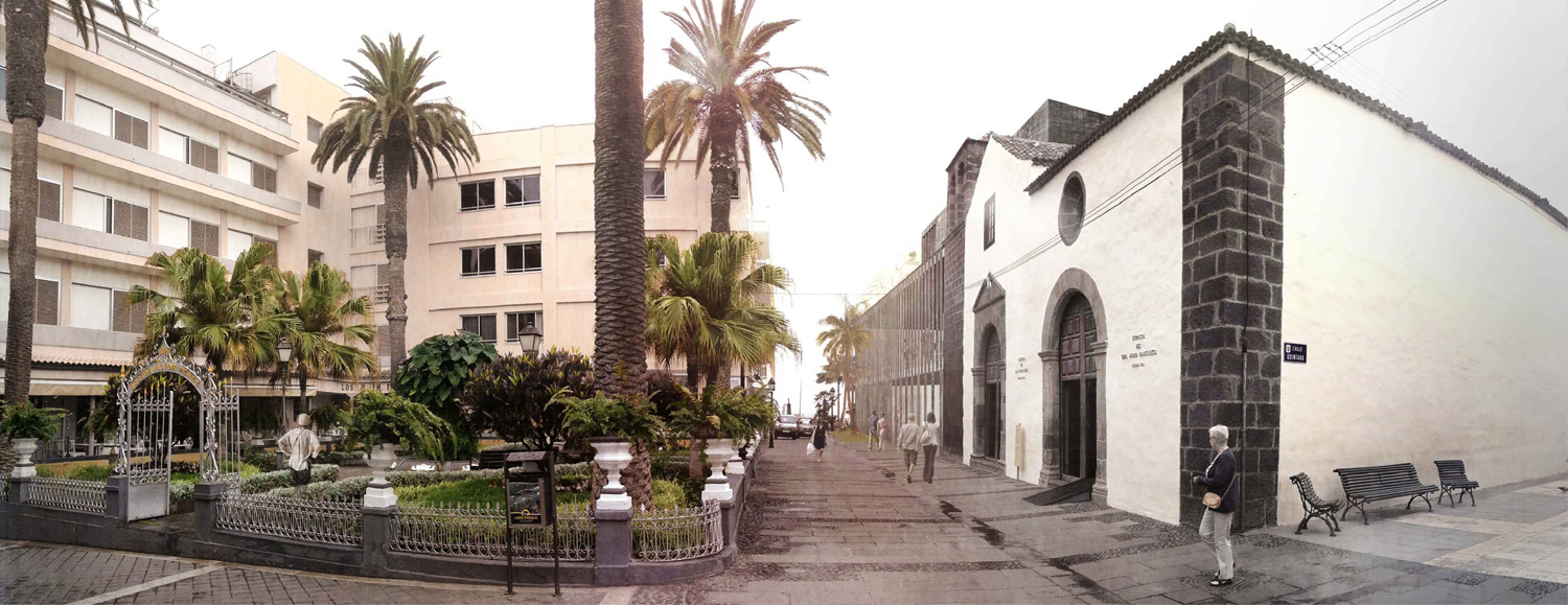 Desde el exterior, el edificio aparece como un volumen neutro de color oscuro, casi negro. Del color de la arena de las playas y las rocas que configuran el espectacular paisaje del Puerto de la Cruz. El proyecto no trata de relacionarse con su entorno residencial más cercano, pero sí con la materialidad de la torre de la contigua Iglesia de San Francisco y con el territorio natural. Una vez en el interior, el edificio se transforma en un espacio inundado por la luz natural, transpirable, que respira. Espacios intermedios, terrazas, fachadas permeables y lucernarios; todos estos elementos potencian la relación con el exterior, y permiten aprovecharse al máximo del privilegiado clima de la isla. Desde estas terrazas se puede ver y oler el mar, cercano, a escasos metros de donde nos encontramos. En la parte más alta del edificio, aparece un mirador, que enmarca y permite contemplar la línea del horizonte entre el océano y el cielo.