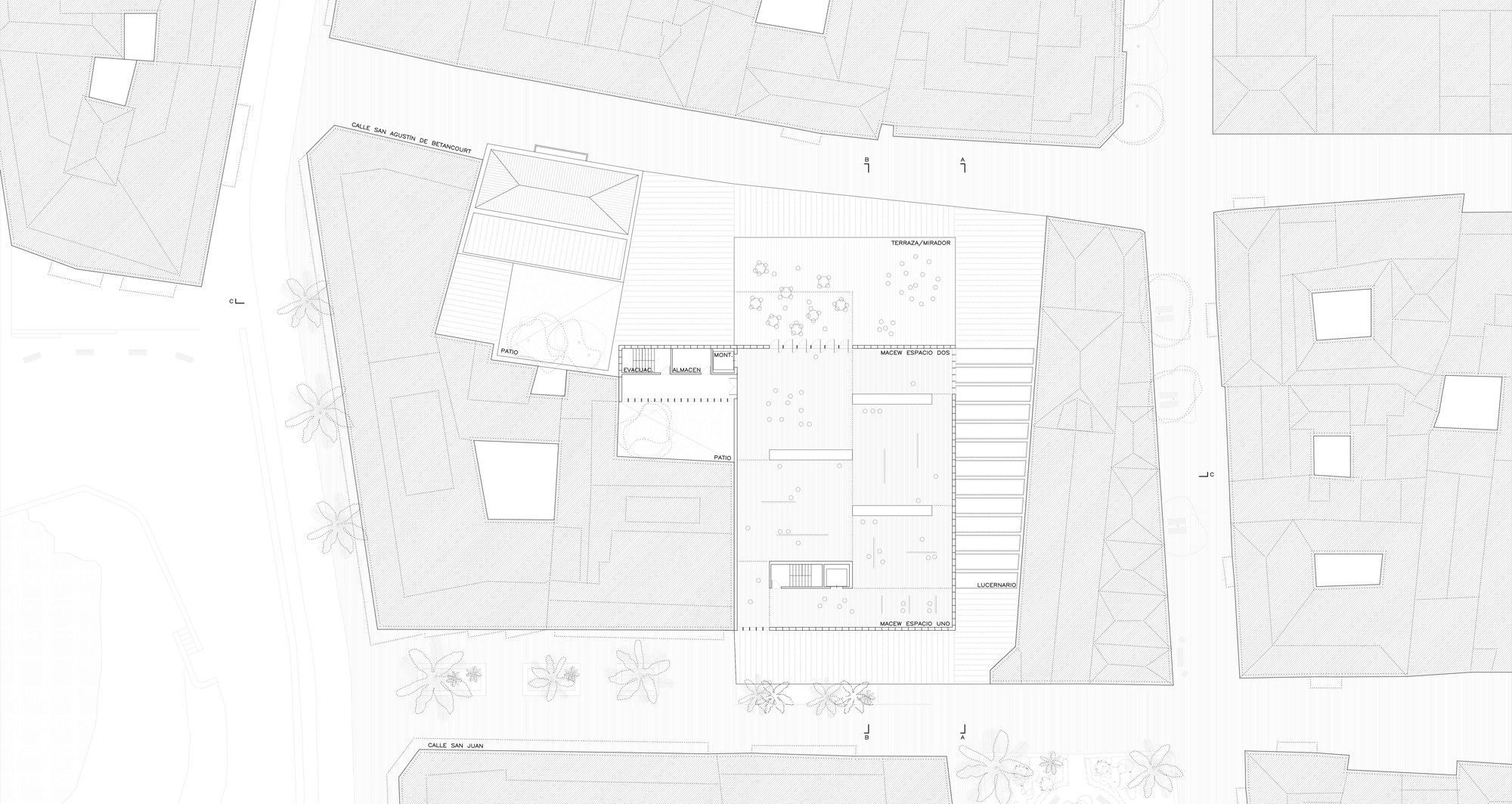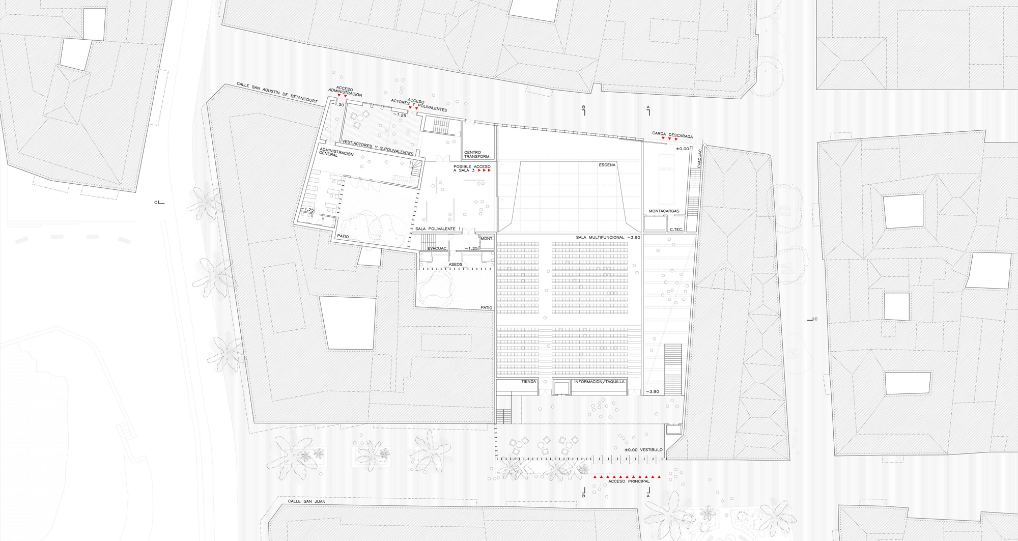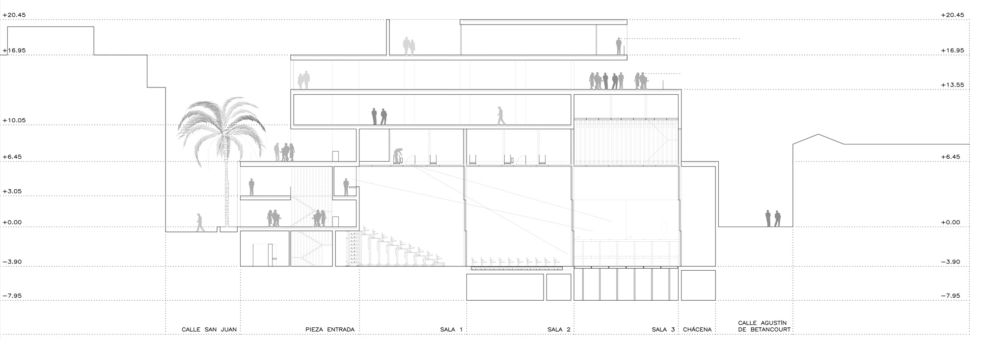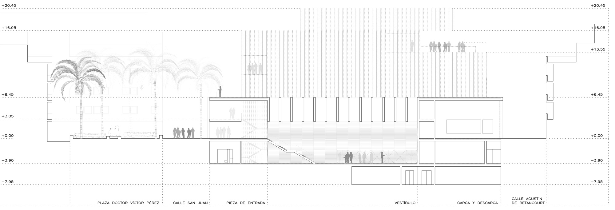 En la planta intermedia, y accesible tanto para los visitantes del edificio como para los transeúntes de la calle, se localiza la cafetería, volcada a la doble altura del vestíbulo de entrada. El restaurante, en la planta superior, está en continuidad con una terraza desde la que se puede ver el mar. El volumen de mayor altura correspondiente a la caja escénica de la gran sala se sitúa volcado hacia la calle Agustín de Betancourt (respetando el retranqueo y altura máxima), facilitando de este modo la carga-descarga. La primera crujía de la planta baja de la Casa Martel se convierte en la entrada independiente de actores desde la que pueden acceder a la zona de camerinos. La zona administrativa, se sitúa también en la Casa Martel, con entrada desde la segunda puerta que da a la calle Agustín de Betancourt y volcada tanto hacia la calle como hacia el patio interior que se mantiene descubierto. Un nuevo patio surge como consecuencia de respetar la adecuada iluminación y ventilación de las edificaciones medianeras. El centro de transformación de compañía se mantiene en el mismo lugar que el actual, tras la fachada de la Cárcel y con acceso exterior.