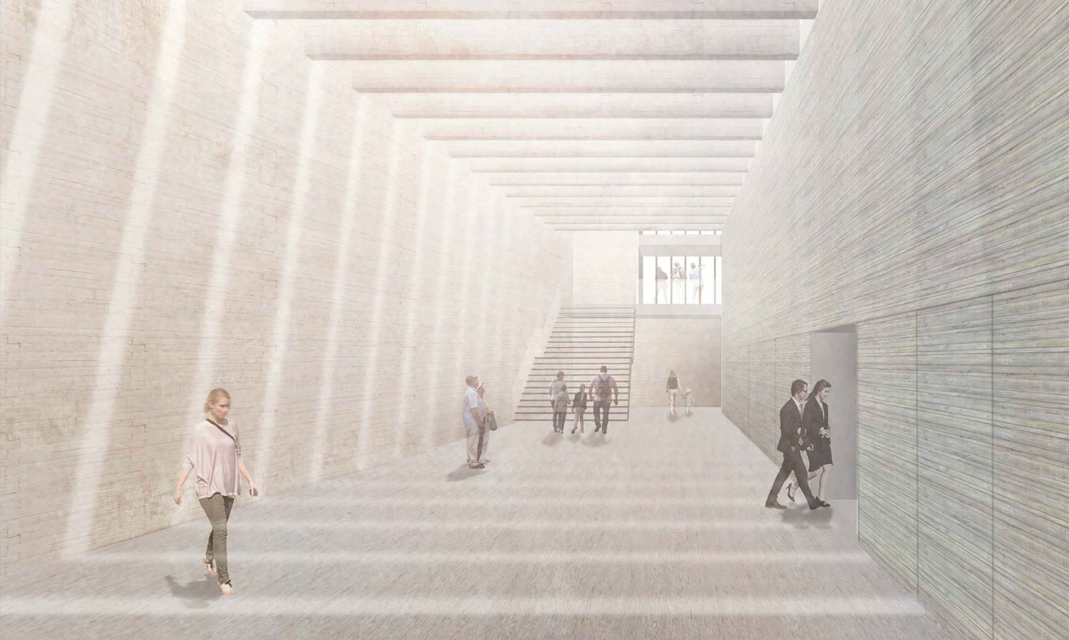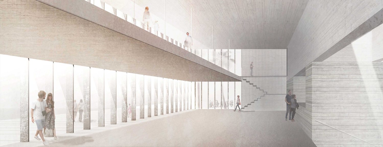 El cumplimiento de la envolvente establecida por la normativa y la necesidad de albergar el gran volumen de la sala multifuncional requerida en el programa, condicionan en gran medida las decisiones del proyecto. La fachada permeable a la Calle San Juan se establece como entrada principal al edificio para el público, tanto para visitantes del MACEW, como para los de la sala multifuncional. Este vestíbulo distribuye a los visitantes del museo hacia las plantas superiores y a los del auditorio hacia la planta inferior, donde se sitúa un segundo vestíbulo iluminado cenitalmente a cota de la sala. Los espacios expositivos del MACEW y la sala polivalente de exposiciones temporales, se sitúan en las plantas superiores, configurados como espacios neutros, diáfanos y flexibles, adaptables a las necesidades de cada momento. El museo cuenta, además del núcleo de comunicación vertical de público, con un montacargas de uso interno con acceso desde el sótano y vinculado a la zona de carga y descarga, con acceso desde la calle Agustín de Betancourt. La sala del museo de la planta cuarta se abre hacia una gran terraza con vistas al mar, donde se pueden desarrollar gran cantidad de eventos al aire libre. El edificio se remata con la última sala del museo, que vuela sobre la terraza de la planta inferior y se convierte en un gran mirador hacia el paisaje lejano.