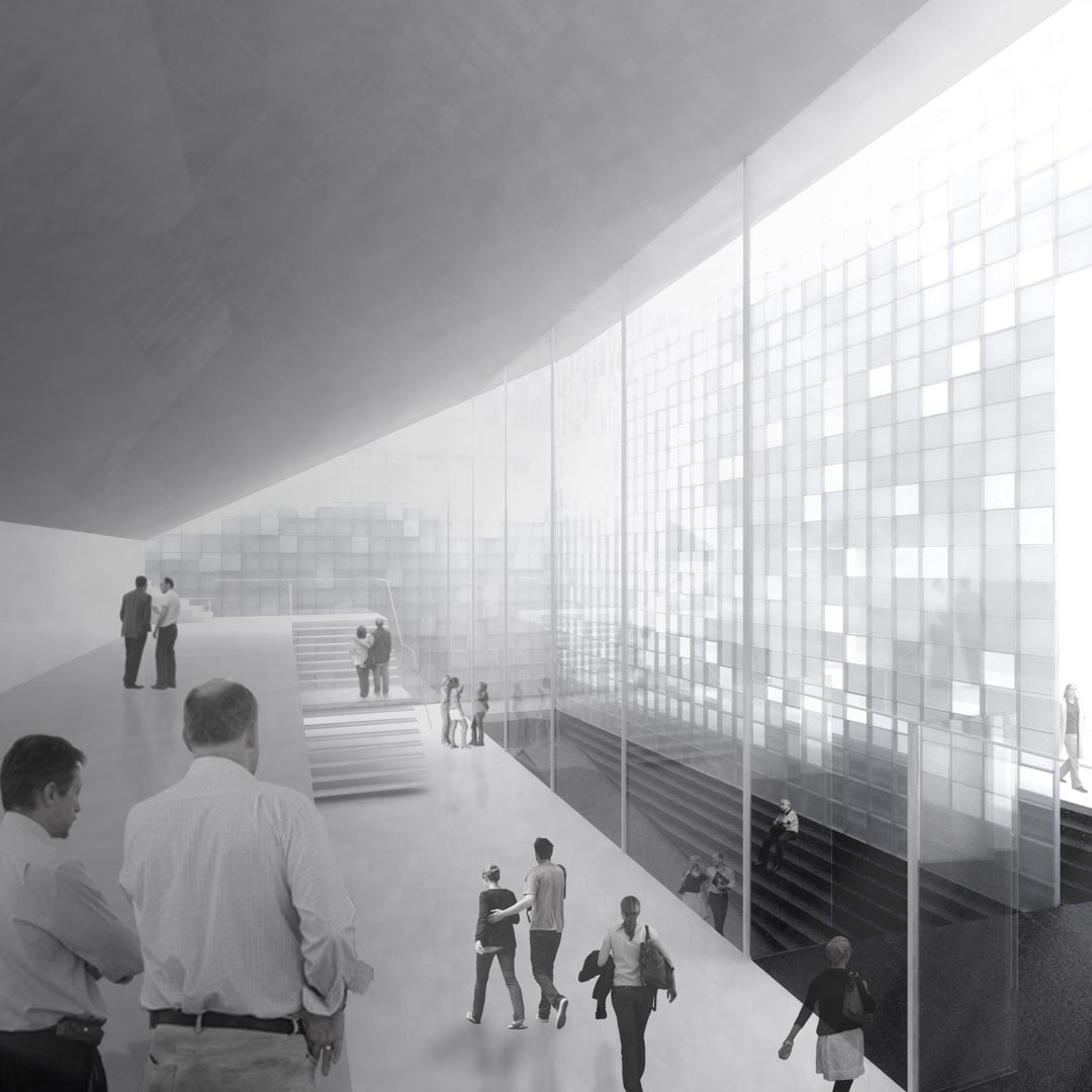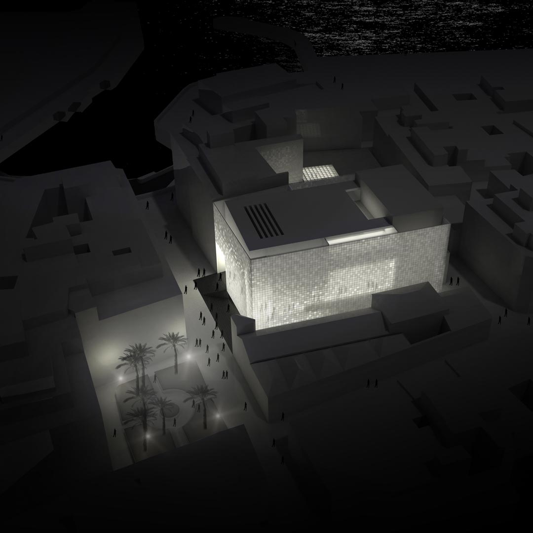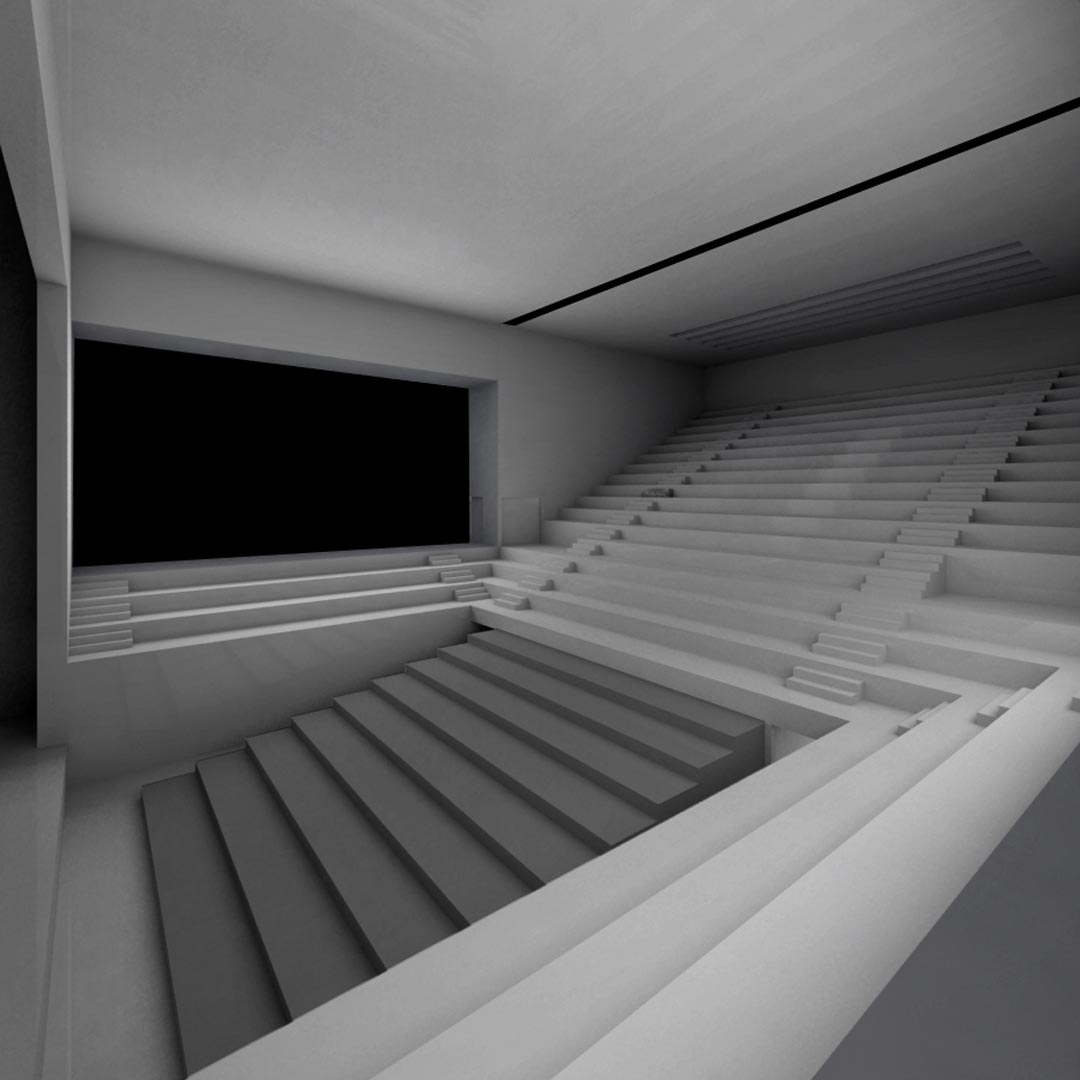– Elevation of the auditorium, making it floating-like over a clear basement, which hosts the exhibition areas and connects with the main courtyard.