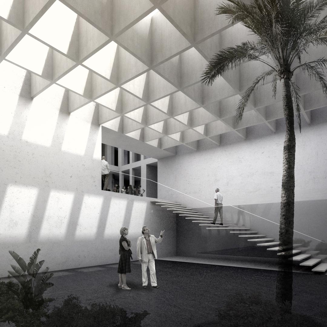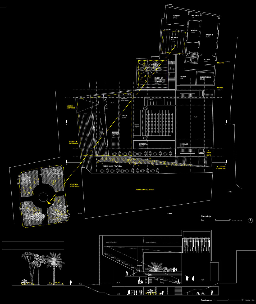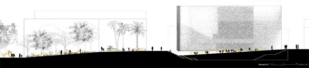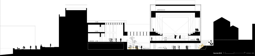 Consist on a series of linked spaces. Main of them is the exhibition area in the basement, which is completely clear, flexible and open to the pedestrian street through a system of ramps and steps, and allowing crossed ventilation. This connects with the MACEW museum through the two courtyards, which will also display exhibitions.
