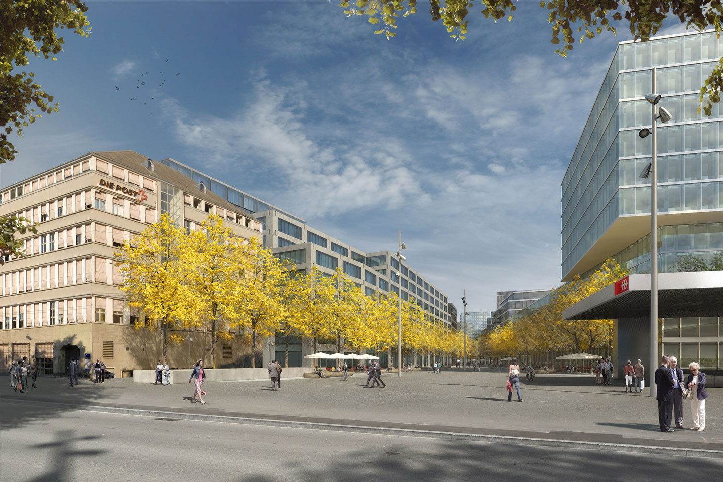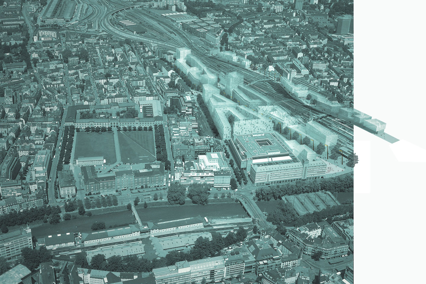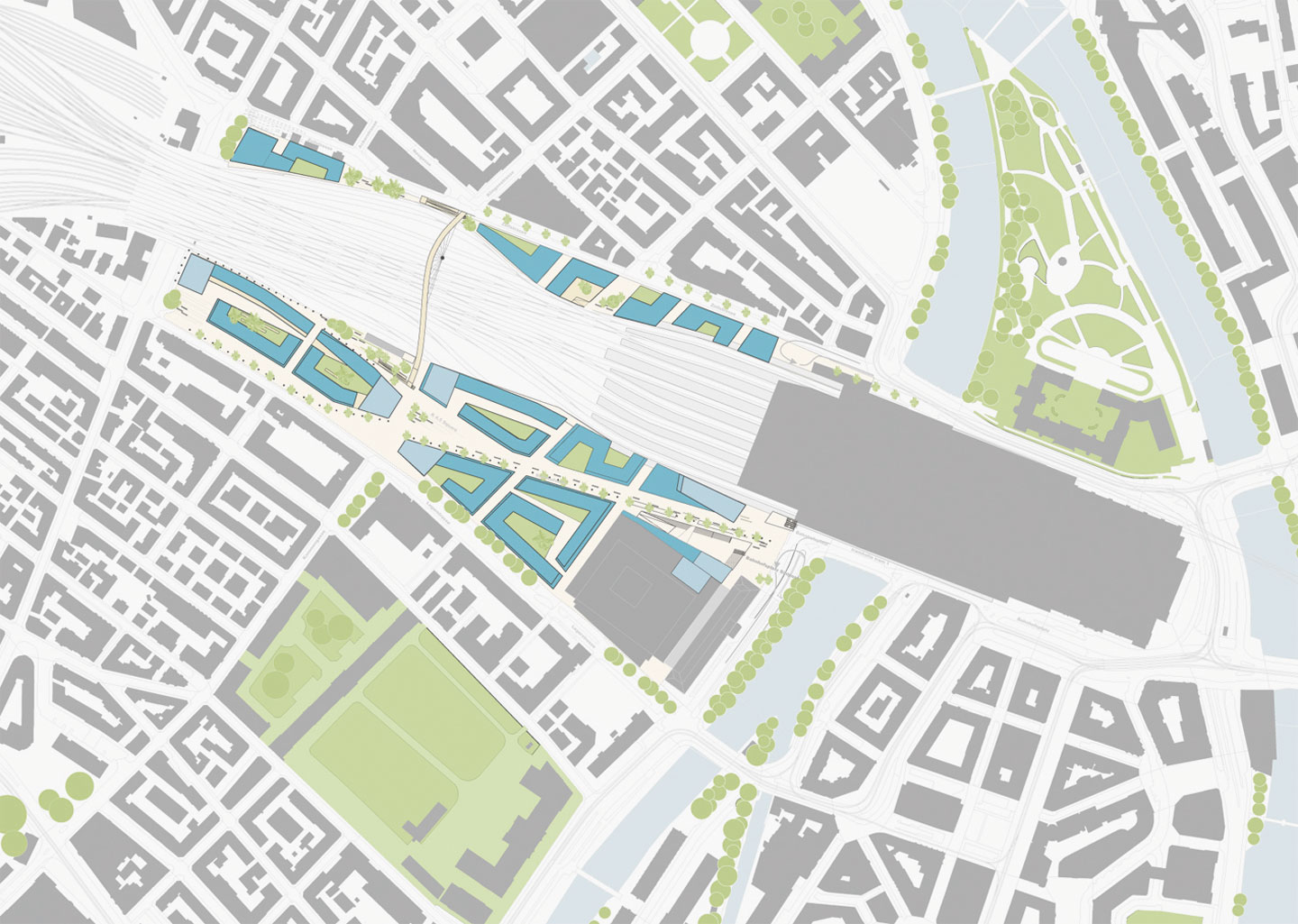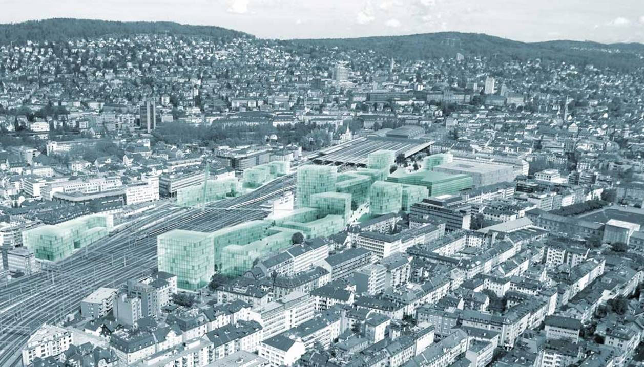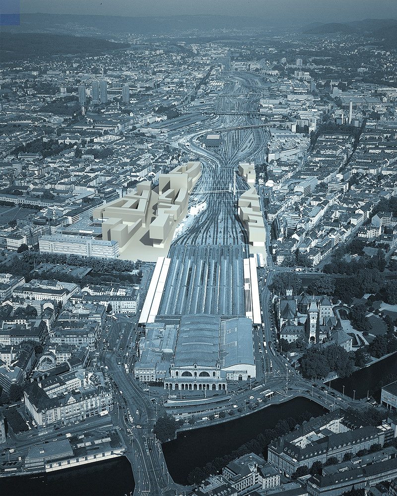 Accordingly, the immediate area around Zurich main railway station will be brought into line with modern-day requirements. It will acquire a new structure that blends seamlessly with the surrounding area. A diagonal connection drawn from the old station plaza, provides the main axis of the new station area and leads to adjacent city quarters. At right angles to this axis, existing streets are extended in north-south direction as far as the railway line. Since a strip of land on the far side of the railway tracks is also being redeveloped, station and railway lines will be fully integrated into the urban fabric. Sight lines and a new bridge across the railway unite the two sides.