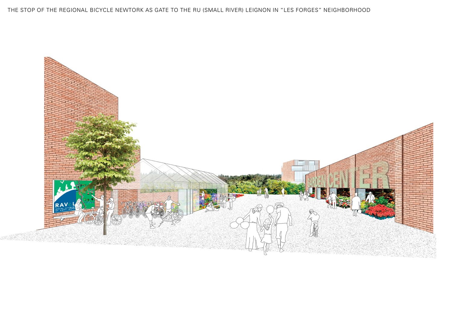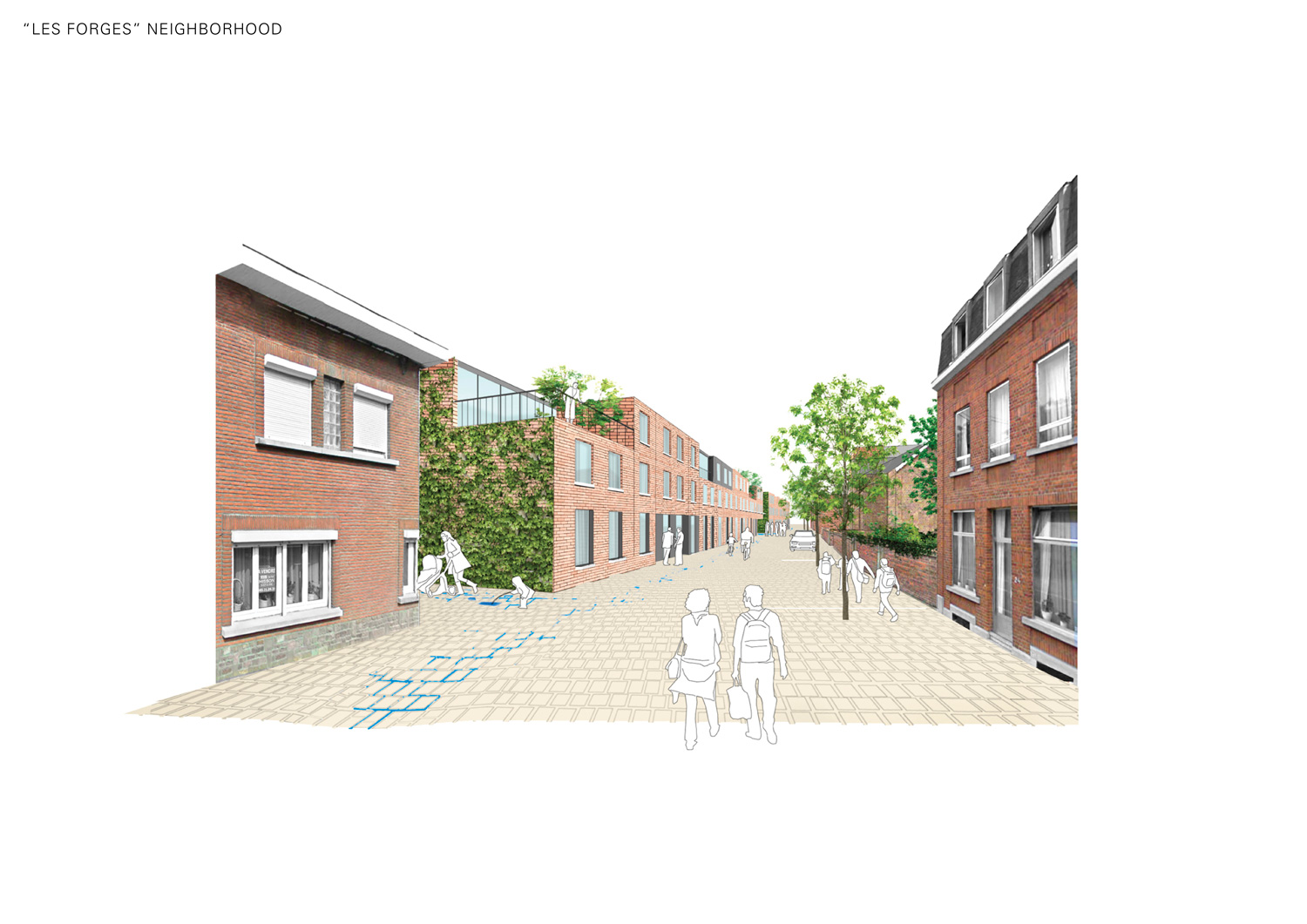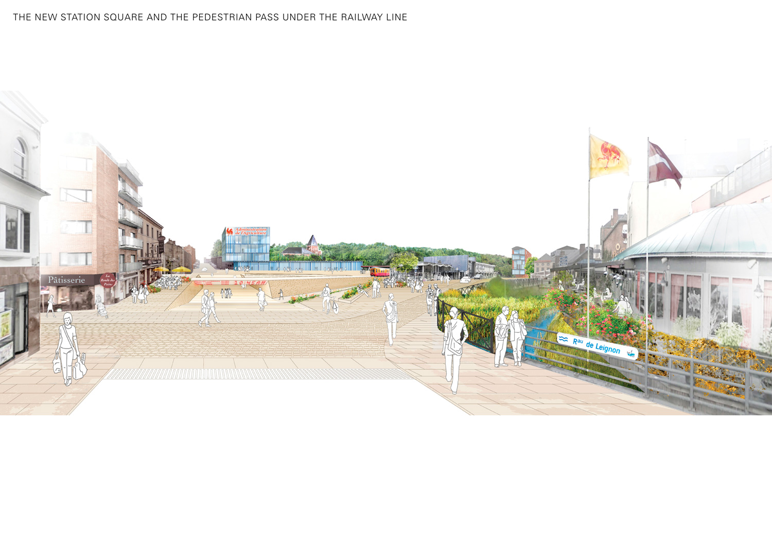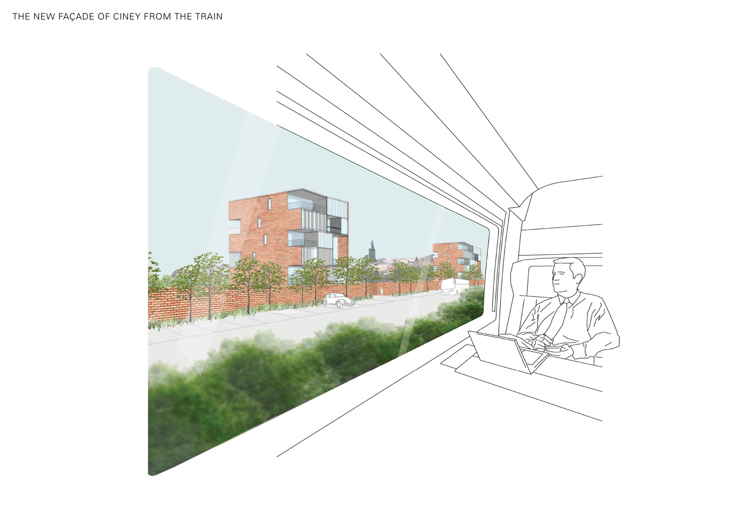 Then, for the project site in the old forges of Ciney, we propose a penetration of nature and, at the same time, an intensification of its urbanity. The Leignon, this small stream (the «ru») which crosses the site, is therefore renaturalized and regains its role as a green reserve in the heart of the city. Around the Leignon stream, the new Neighborhood of «Les Forges» establishes the necessary density to form a new vibrant neghbourhood and also composes a new facade of the city from the train. Finally, the area around the train station is reorganized and remodeled to assert its role as the second urban center of Ciney after Church Square (Place Monseu). We propose a new generous and confortable underpass under the existing railway tracks dedicated to pedestrians and cyclists, that knits together the two parts of Ciney on both sides of the railway. This crossing leads to the new building of the service of the Administration of Agriculture, which serves to reinforce the urban character of the area. All these measures are aimed at transforming the area around the station into a more friendly and urban space: a real Station Square for the city.