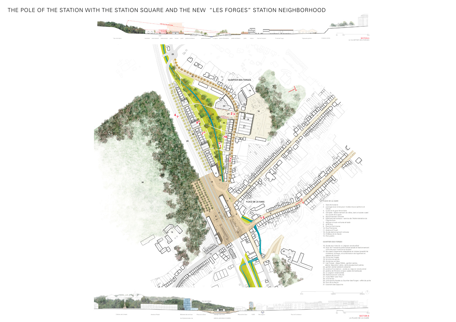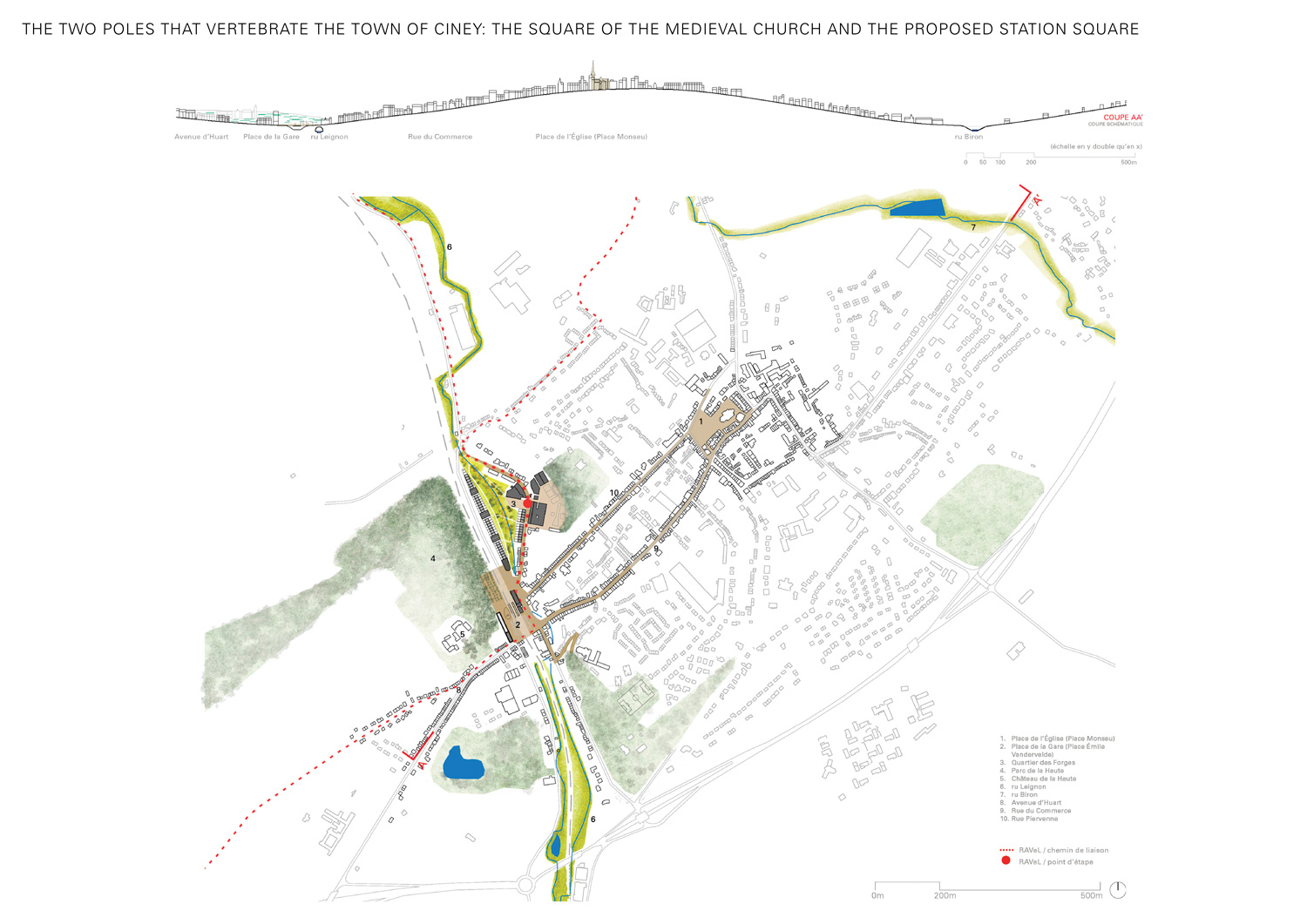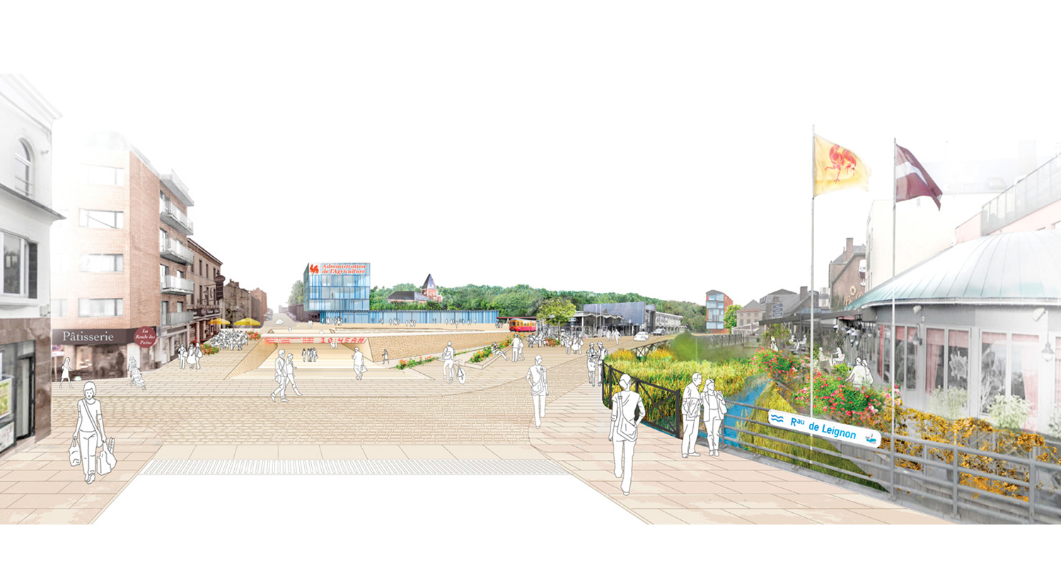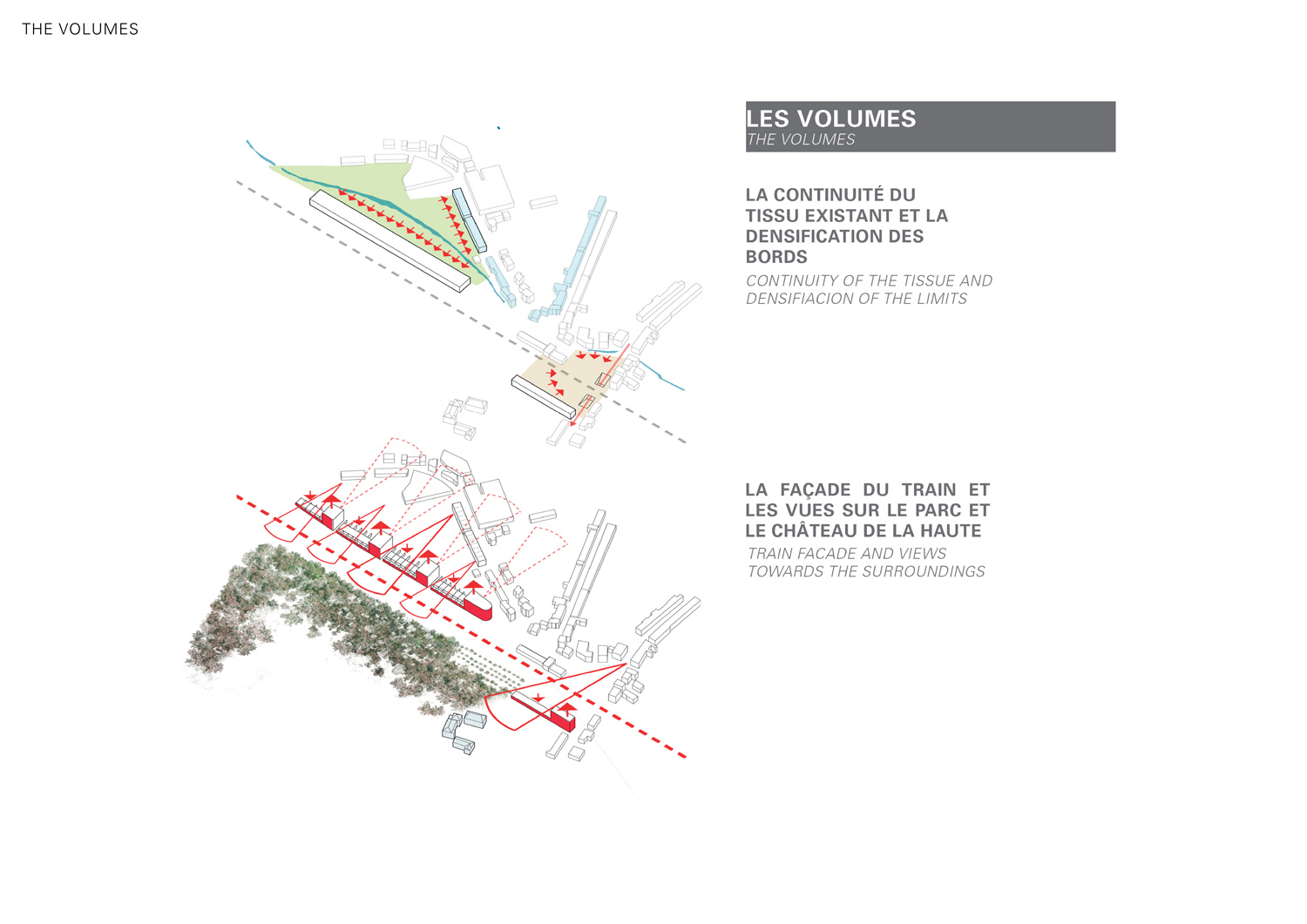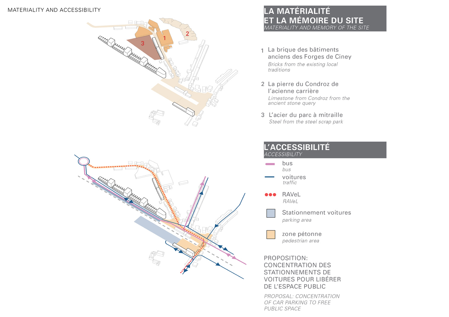 Then, for the project site in the old forges of Ciney, we propose a penetration of nature and, at the same time, an intensification of its urbanity. The Leignon, this small stream (the «ru») which crosses the site, is therefore renaturalized and regains its role as a green reserve in the heart of the city. Around the Leignon stream, the new Neighborhood of «Les Forges» establishes the necessary density to form a new vibrant neghbourhood and also composes a new facade of the city from the train. Finally, the area around the train station is reorganized and remodeled to assert its role as the second urban center of Ciney after Church Square (Place Monseu). We propose a new generous and confortable underpass under the existing railway tracks dedicated to pedestrians and cyclists, that knits together the two parts of Ciney on both sides of the railway. This crossing leads to the new building of the service of the Administration of Agriculture, which serves to reinforce the urban character of the area. All these measures are aimed at transforming the area around the station into a more friendly and urban space: a real Station Square for the city.