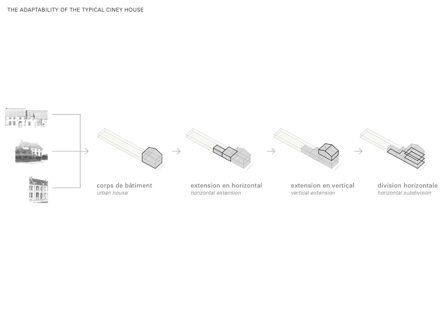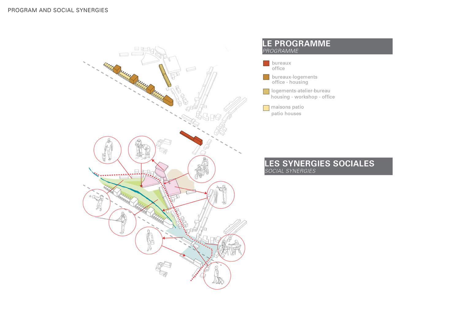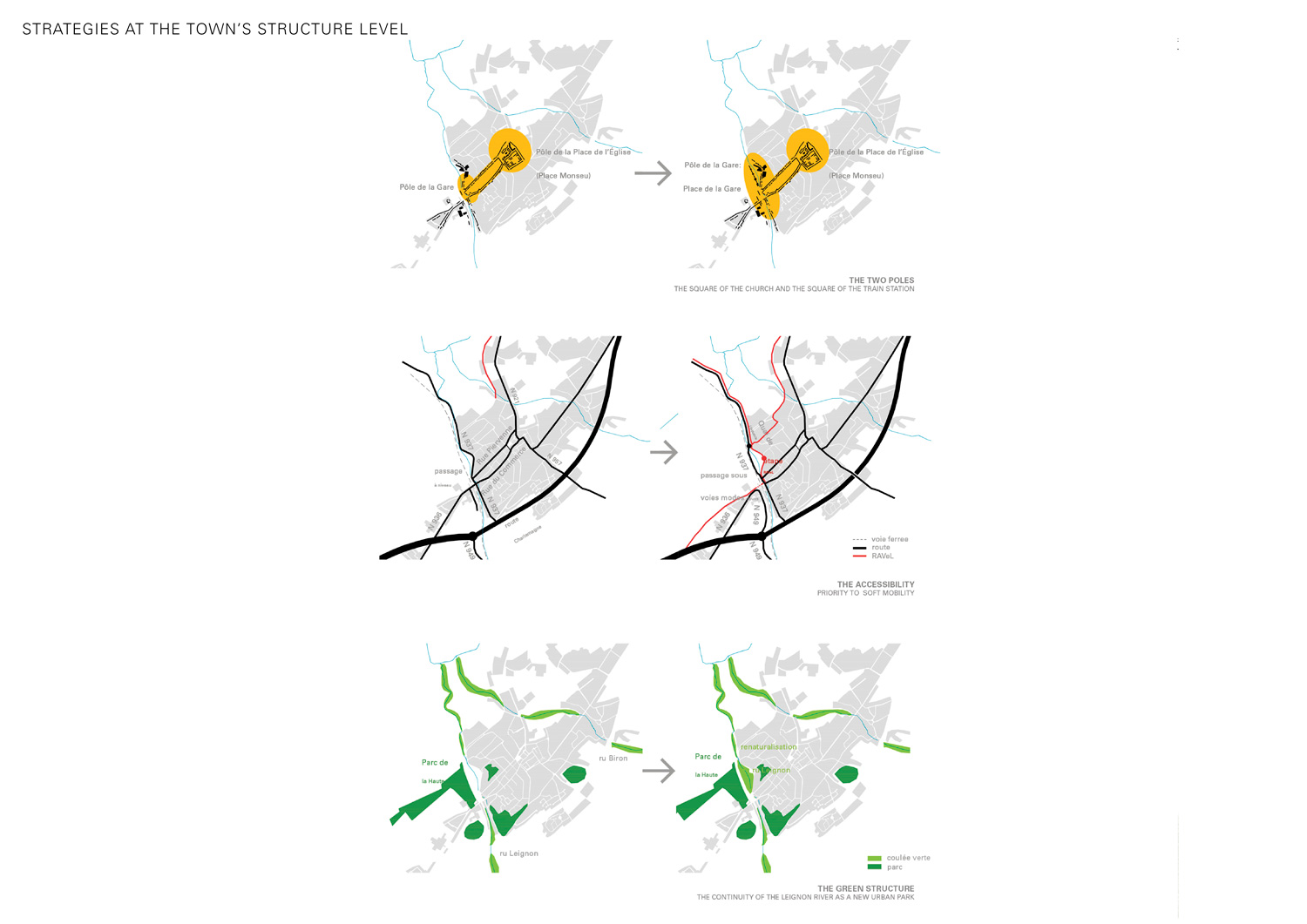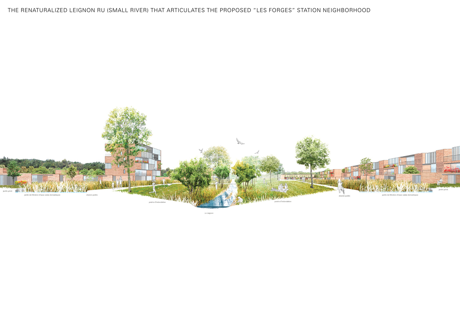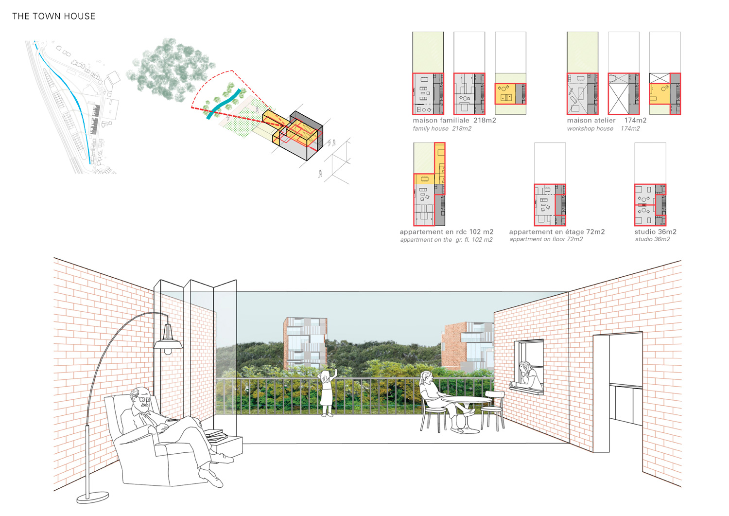 Then, for the project site in the old forges of Ciney, we propose a penetration of nature and, at the same time, an intensification of its urbanity. The Leignon, this small stream (the «ru») which crosses the site, is therefore renaturalized and regains its role as a green reserve in the heart of the city. Around the Leignon stream, the new Neighborhood of «Les Forges» establishes the necessary density to form a new vibrant neghbourhood and also composes a new facade of the city from the train. Finally, the area around the train station is reorganized and remodeled to assert its role as the second urban center of Ciney after Church Square (Place Monseu). We propose a new generous and confortable underpass under the existing railway tracks dedicated to pedestrians and cyclists, that knits together the two parts of Ciney on both sides of the railway. This crossing leads to the new building of the service of the Administration of Agriculture, which serves to reinforce the urban character of the area. All these measures are aimed at transforming the area around the station into a more friendly and urban space: a real Station Square for the city.