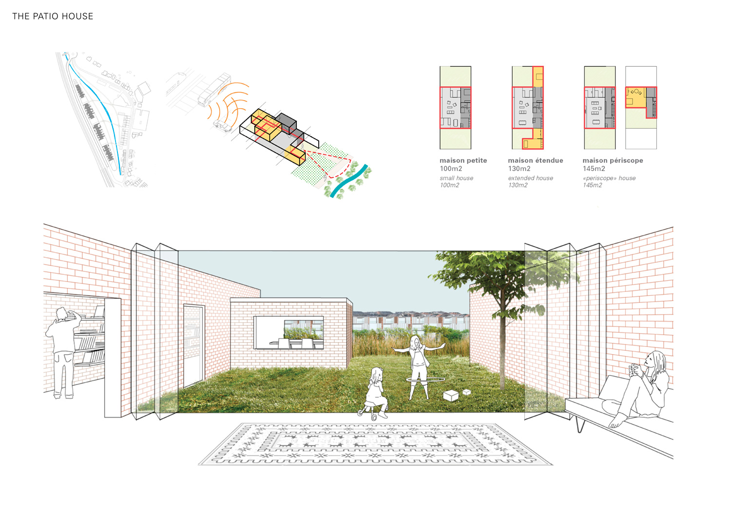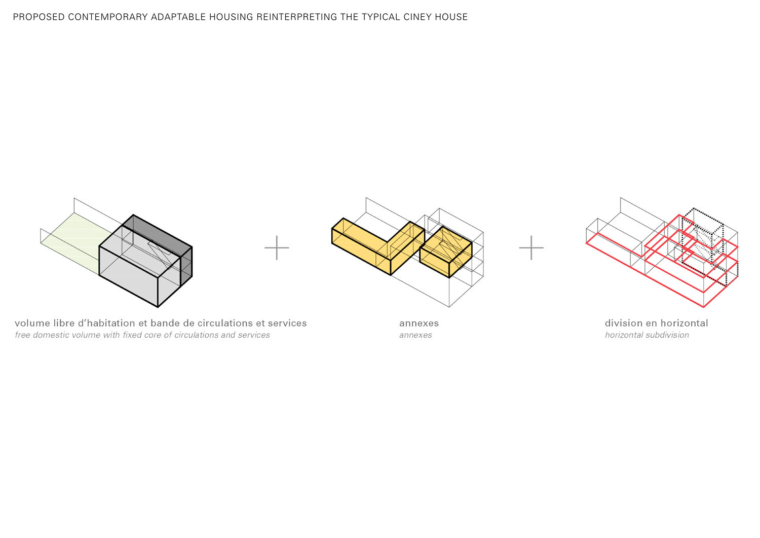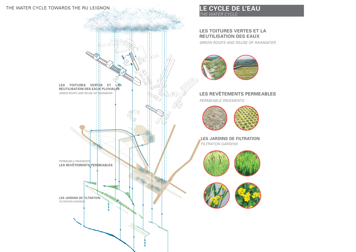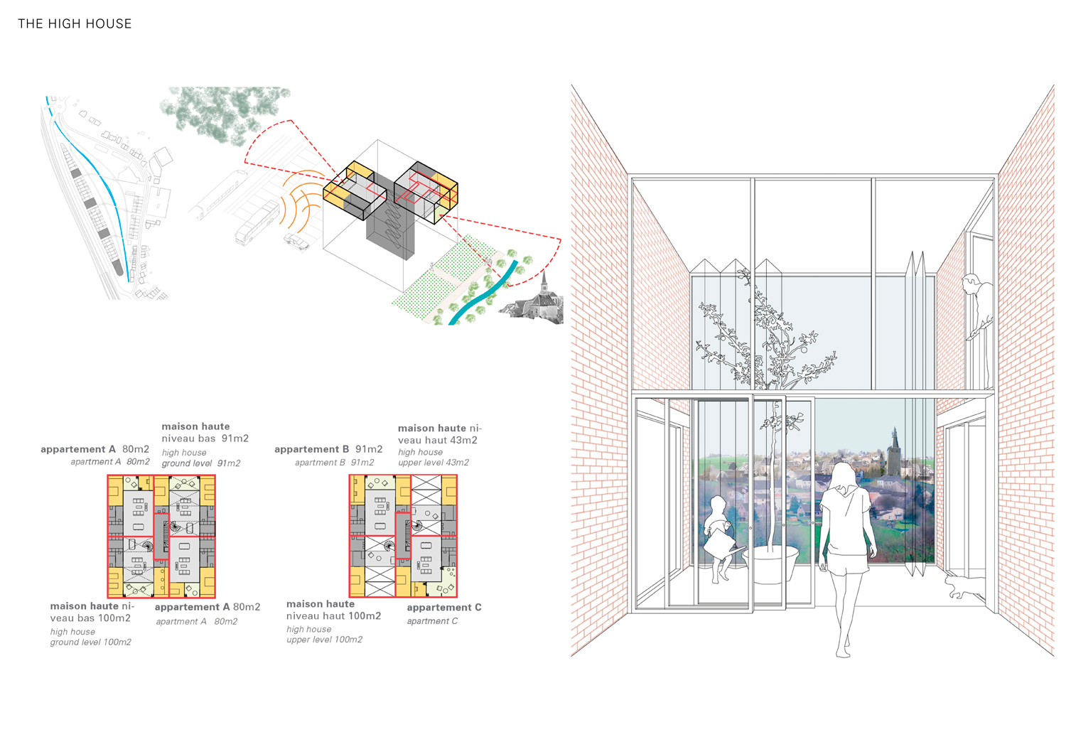 Then, for the project site in the old forges of Ciney, we propose a penetration of nature and, at the same time, an intensification of its urbanity. The Leignon, this small stream (the «ru») which crosses the site, is therefore renaturalized and regains its role as a green reserve in the heart of the city. Around the Leignon stream, the new Neighborhood of «Les Forges» establishes the necessary density to form a new vibrant neghbourhood and also composes a new facade of the city from the train. Finally, the area around the train station is reorganized and remodeled to assert its role as the second urban center of Ciney after Church Square (Place Monseu). We propose a new generous and confortable underpass under the existing railway tracks dedicated to pedestrians and cyclists, that knits together the two parts of Ciney on both sides of the railway. This crossing leads to the new building of the service of the Administration of Agriculture, which serves to reinforce the urban character of the area. All these measures are aimed at transforming the area around the station into a more friendly and urban space: a real Station Square for the city.