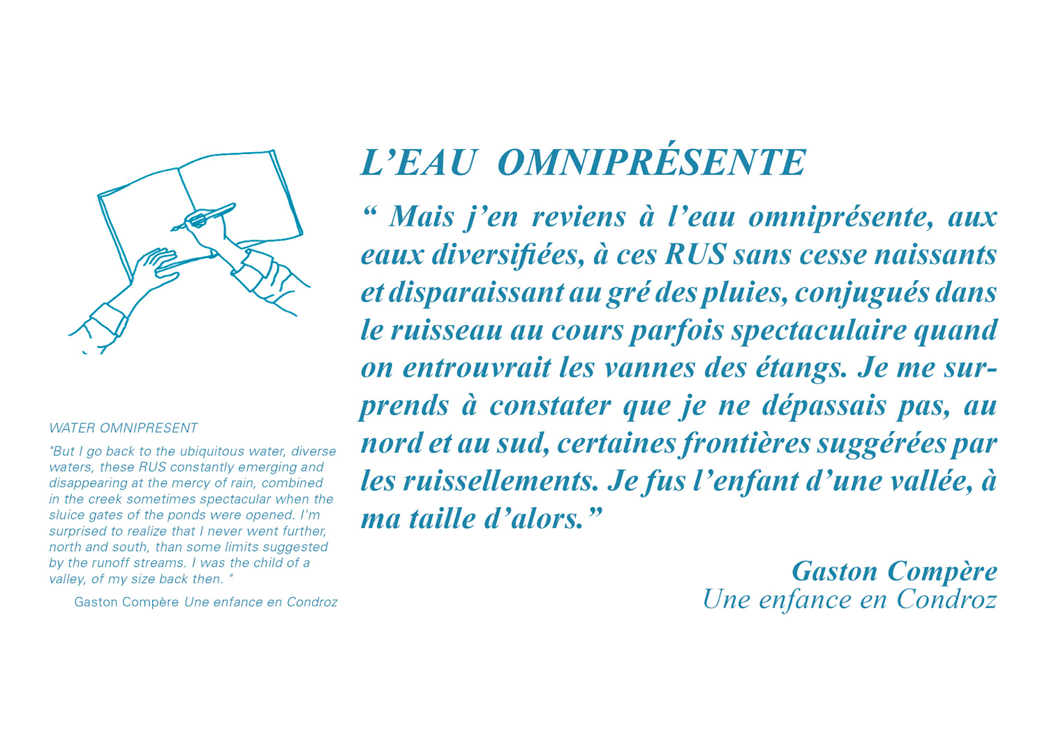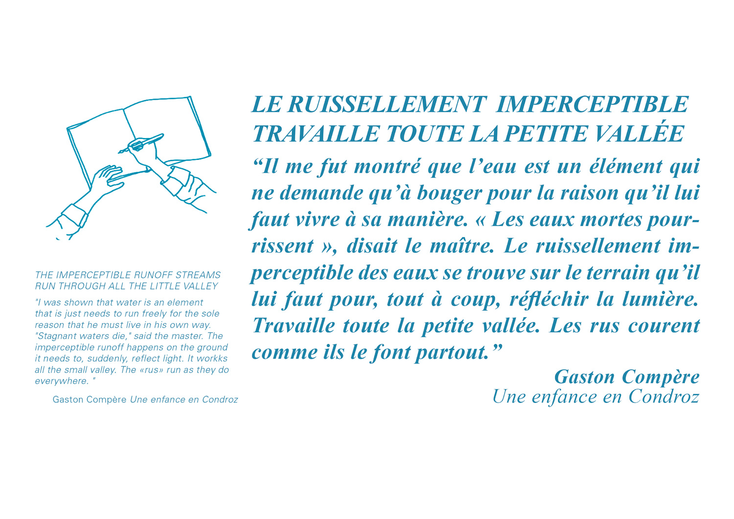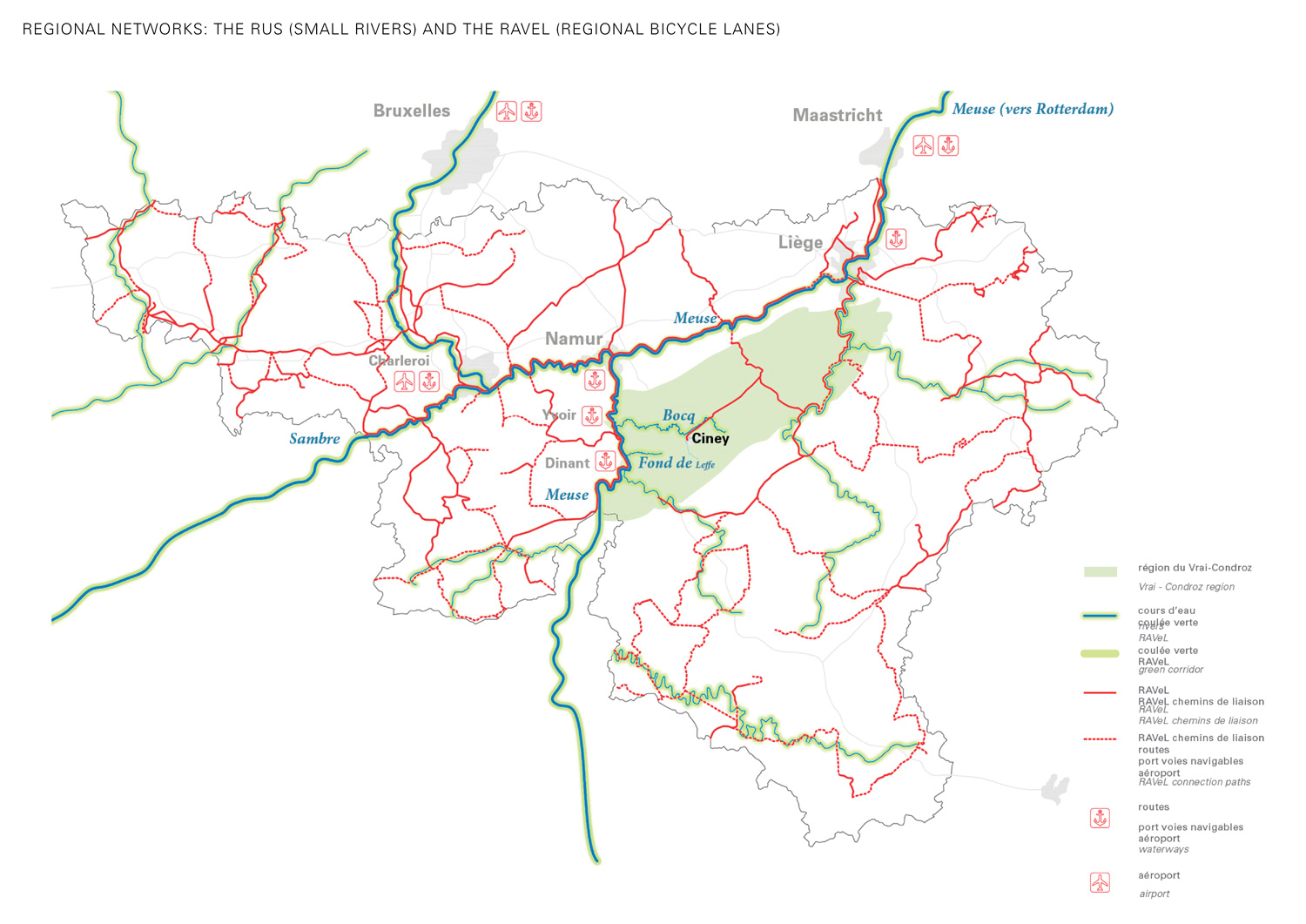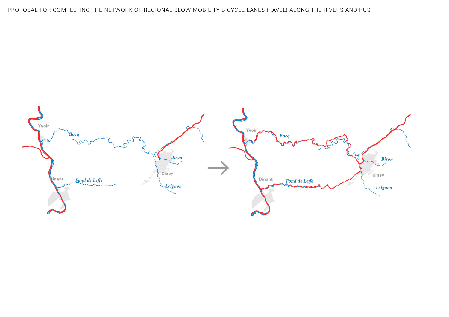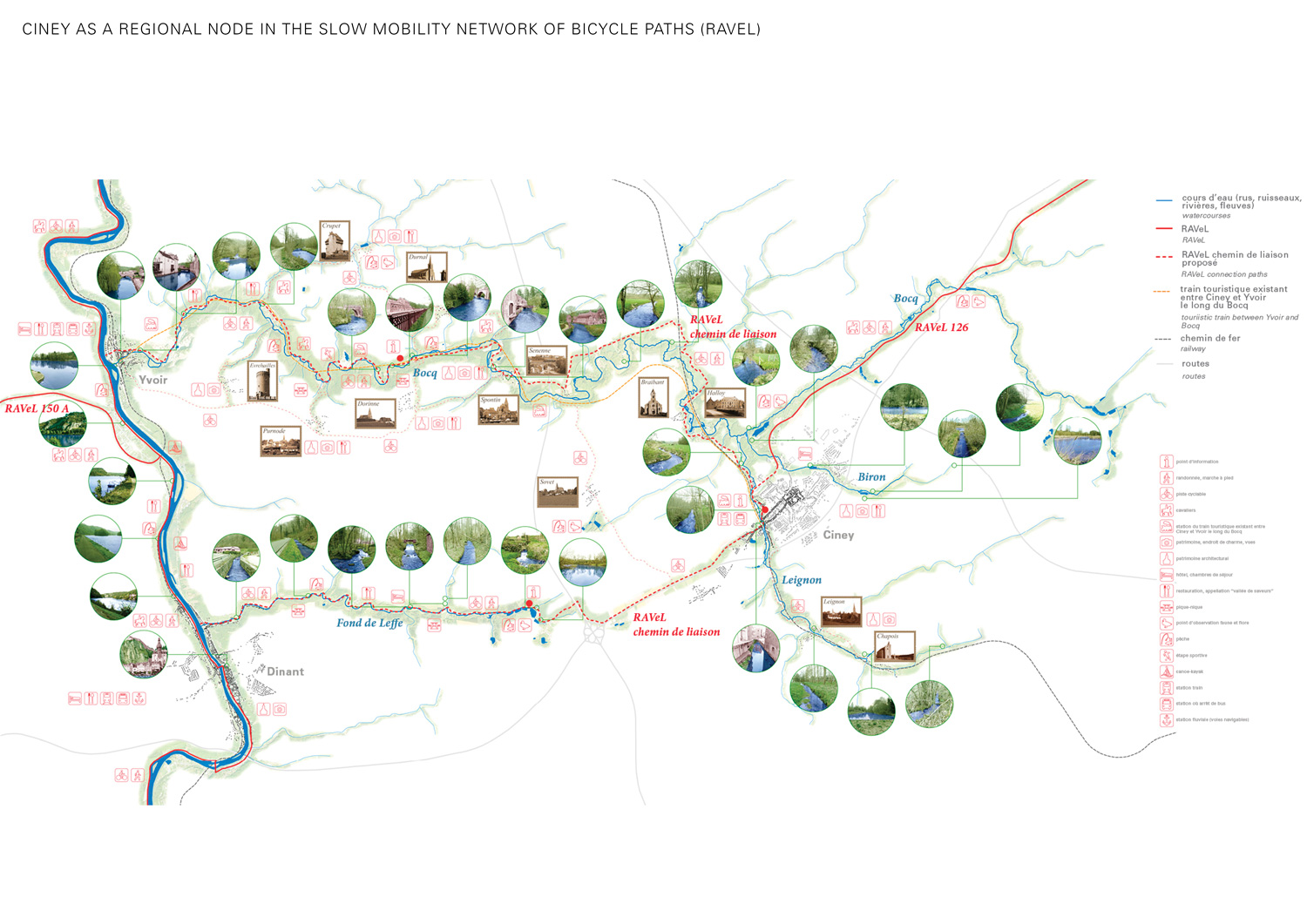 The famous Belgian writer Gaston Compere spent his childhood in the hamlet of Conjoux, in the urban area of Ciney. In his memories «A childhood in Condroz», he describes the region as a harmony between human activity and landscape, between city and nature. Nature is structured by a dense network of rivers and roads entering the city, and the city takes its place on the land wisely. It is this idea of harmony, conectivity and network which guide our project. In first place, we propose to complete the missing link in the of Wallonia’s slow lanes between the vertices of the triangle formed by the cities of Ciney, Yvoir and Dinant, with connection paths that follow the rivers. Thus, the relationship between these three main urban centers of the region is thus enhanced through these slow lanes specifically dedicated to slow modes (pedestrians, cyclists and horse riders), which are at the same time utilitarian, for leisure, and touristic.