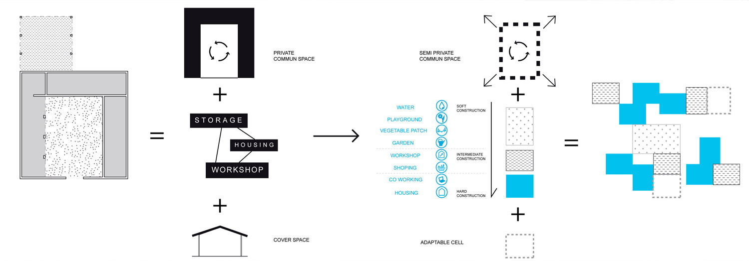 From an existing spatial system, we decompose its parts to analyze and understand relationships. Simple organization object but powerfully flexible organization we can describe the firm as a closed and empty structuring around which the built masses hosting several features to a single activity. In this closed object, usually adds lightweight structures that are covered and open spaces.