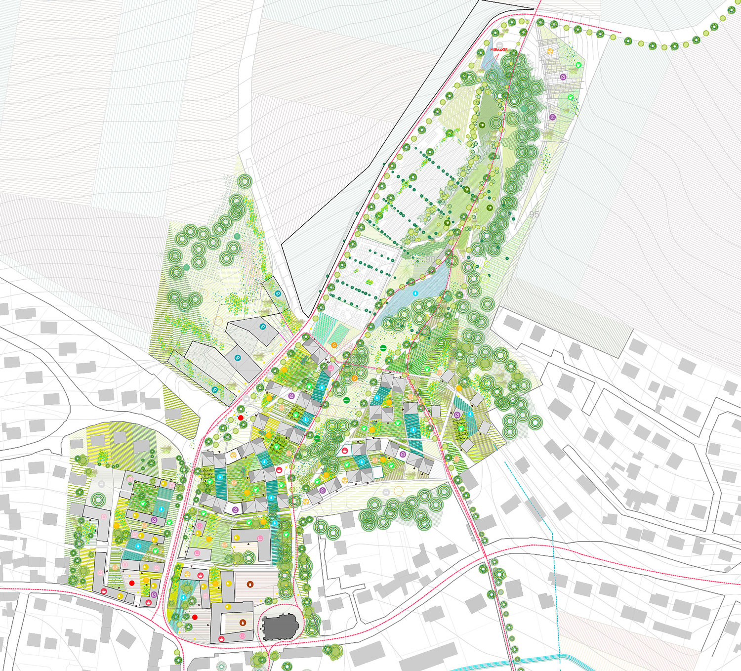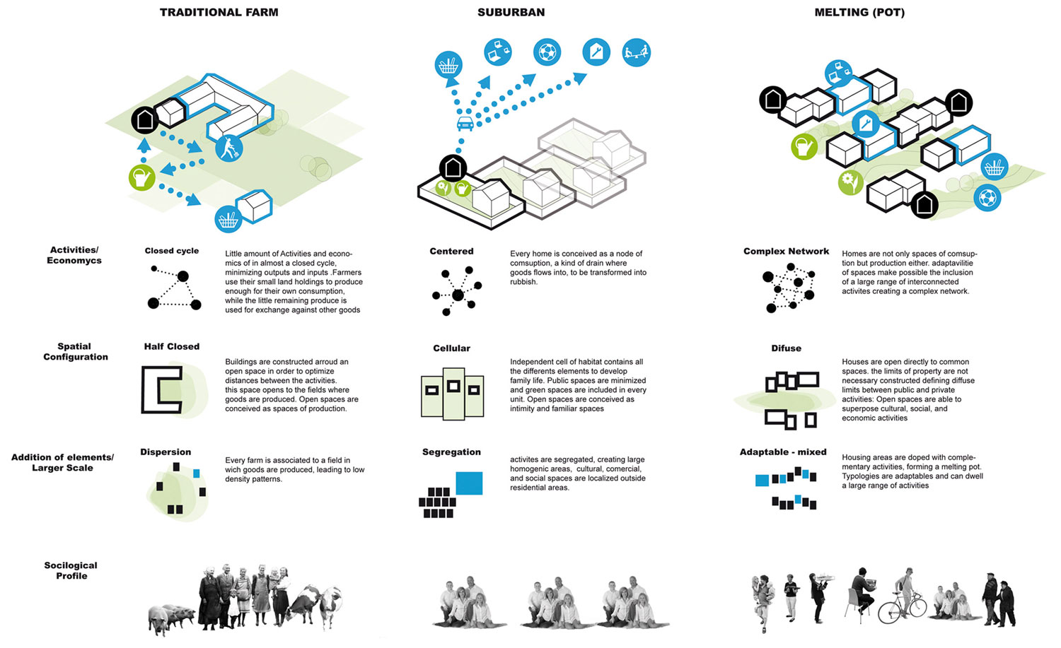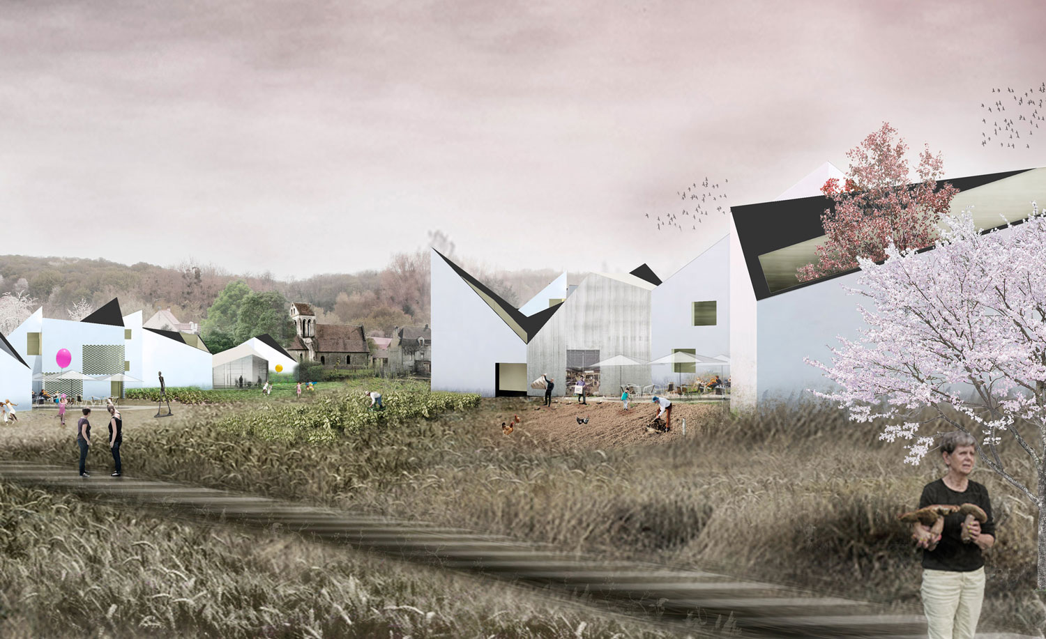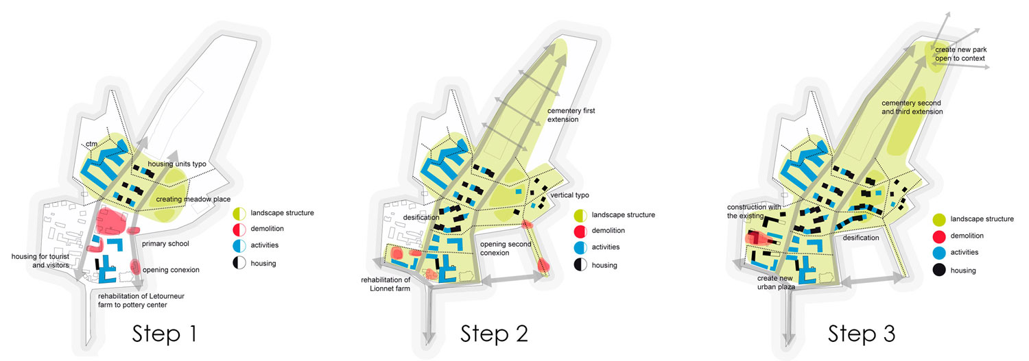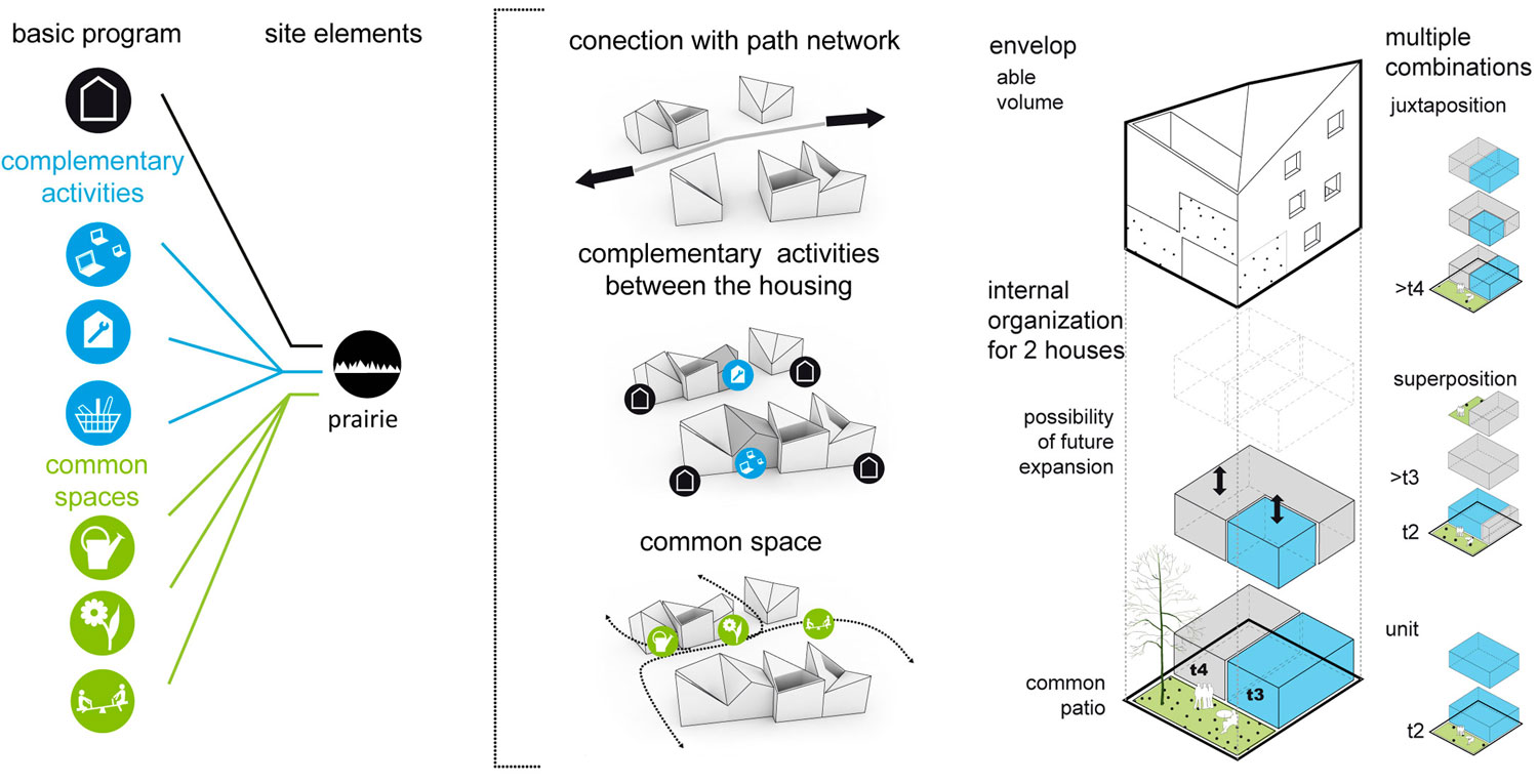 The design process of architectural typologies is based on linking remarkable elements of the site (meadow, grove, existing buildings) with programmatic elements. This association is not defined a priori and operates as opportunities and strategies previously defined: mixed uses, insertion and landscape structure, establishment of areas shares. The design process sets a variety of objects and revitalization of existing structures.
