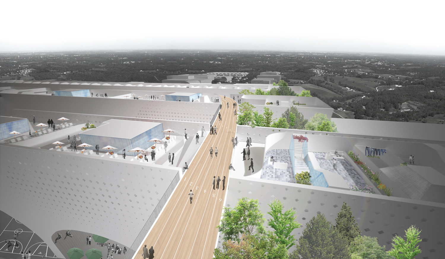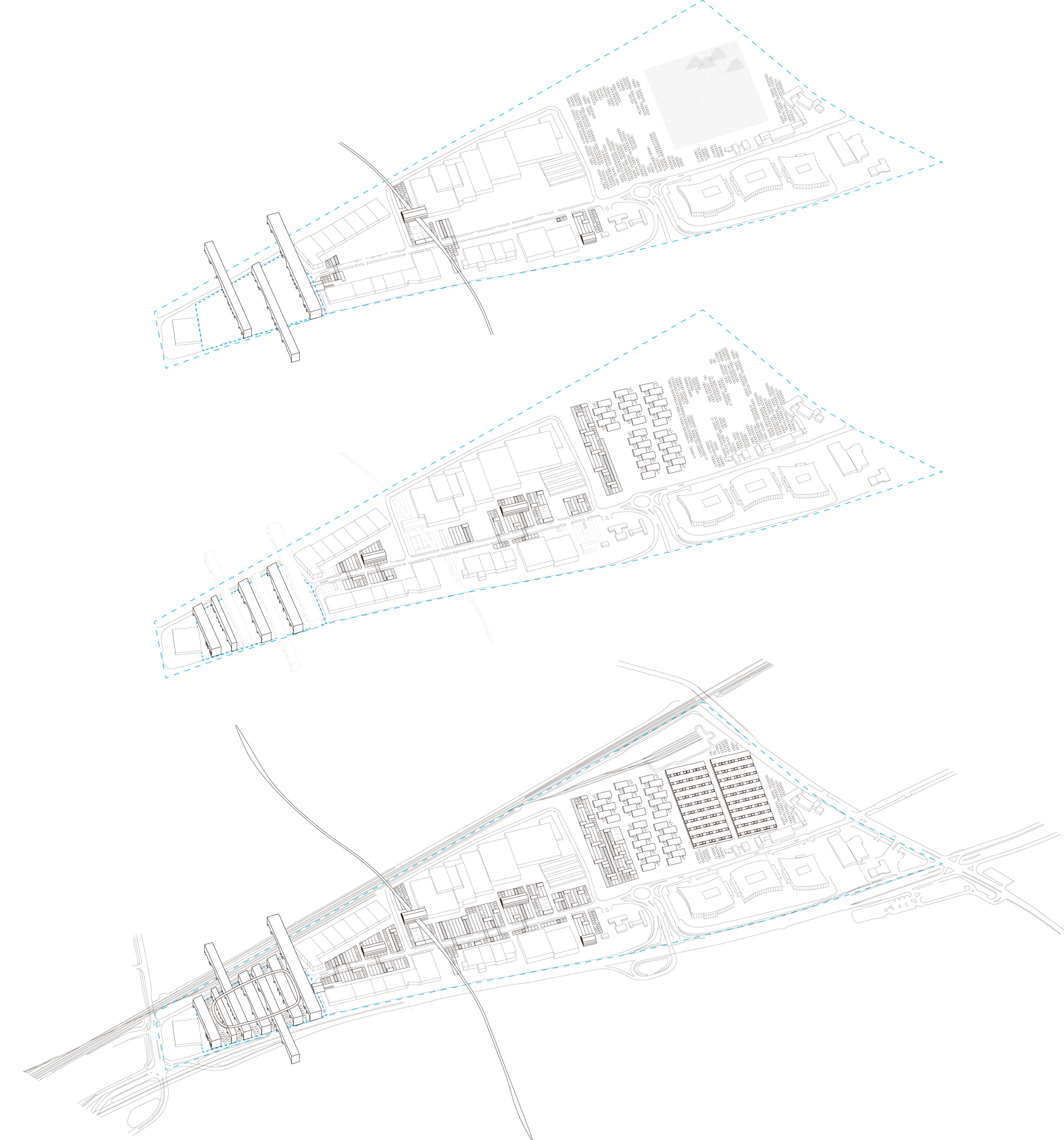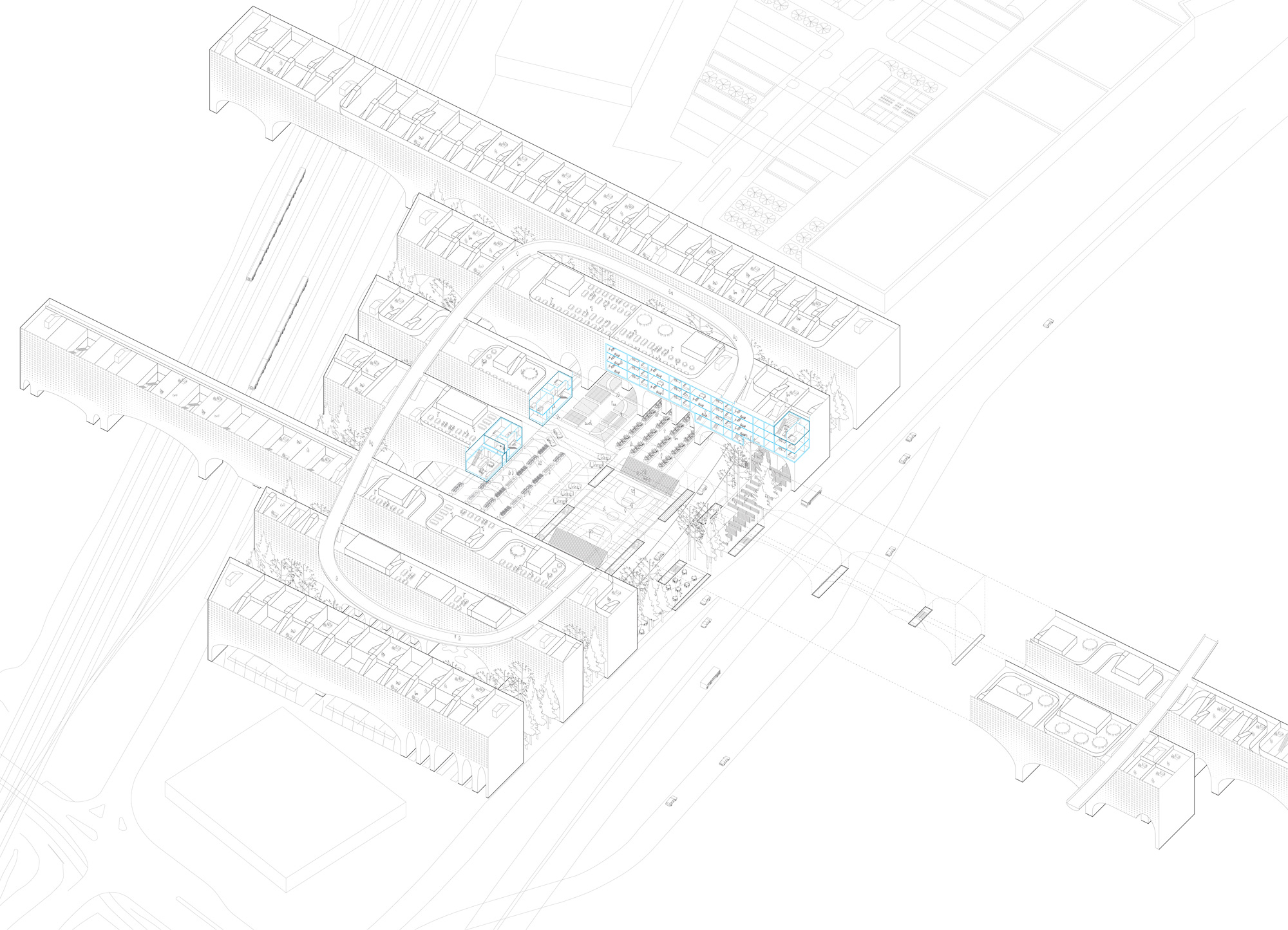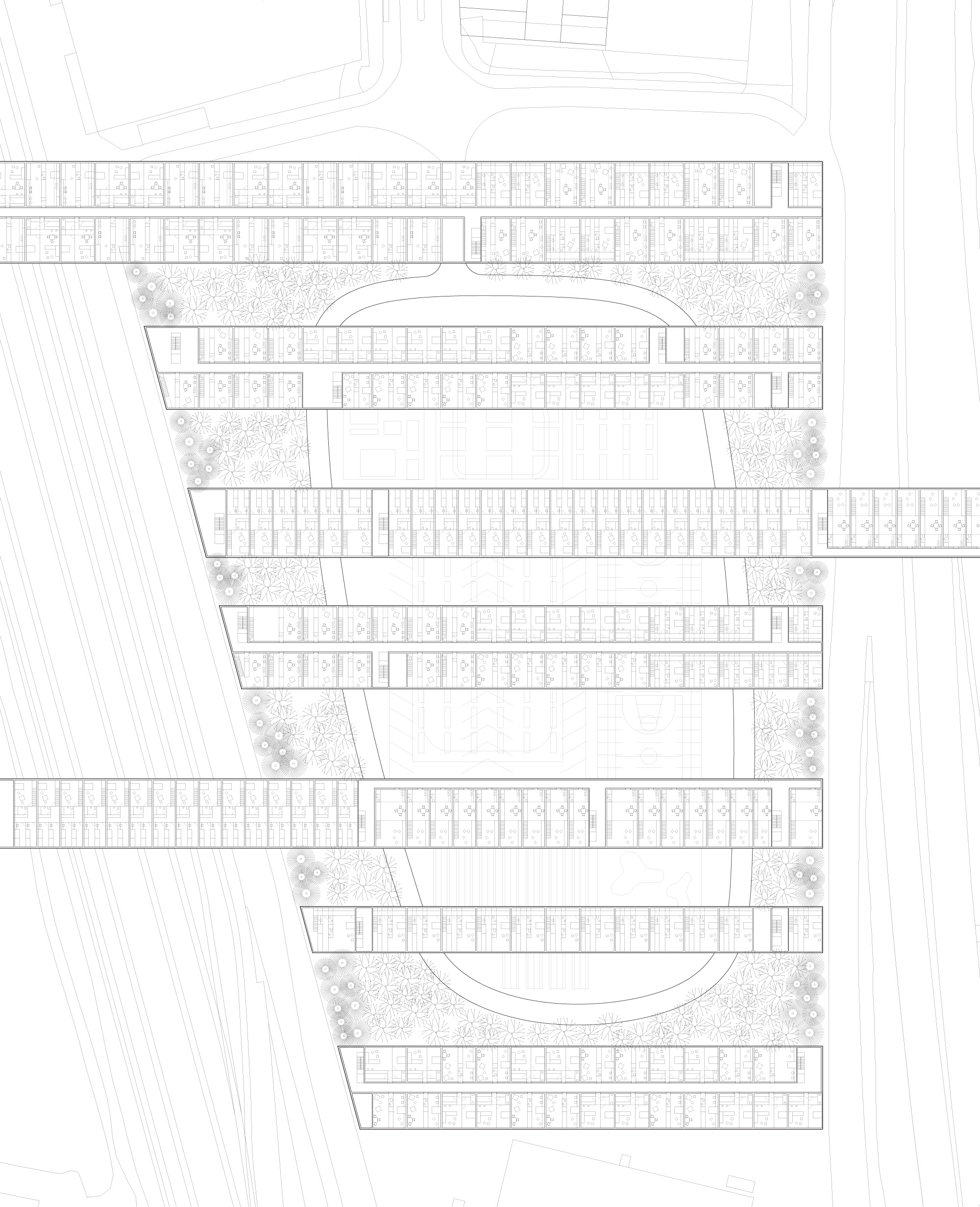 A singular road loop enters the site from the North, and provides access and service to the site without ordering the entire site as most examples of contemporary urbanism. A running track sits above the bars to allow connection between the arcades above grade. Void spaces between the bars and outside of the running track are densely planted with coniferous and deciduous trees to act as air and acoustic filters. The rooftops of the bars in these zones are dedicated to private uses — terraces, gardens, and courtyards. The roof tops within the region defined by the running track are zoned with public programs — restaurants, bars, community gardens, etc. Thus, the bars reconcile the scale of the public and private in plan and section. The strategic site is addressed with a similar methodology as the site, but is structured by space running east-west and form running north-south. This inverted use of space/form allows for an ease of phasing and implementation with regards to the existing buildings. The strategic site is phased to consolidated parking and return the vast surface to public uses. The north edge of the site phased for a natural remediation techniques — aeration, phytoremediation and steam remediation. In time, this land is zoned for a denser development of housing. The arcaded public realm works in conjunction with the surface that adheres to the monumentality of the infrastructure and surrounding architecture while breaking down into local supports to promote soft neighborhood units. By connecting this island to the surrounding developments and infrastructure, a multivalent public realm is achieved in a dynamic field condition.